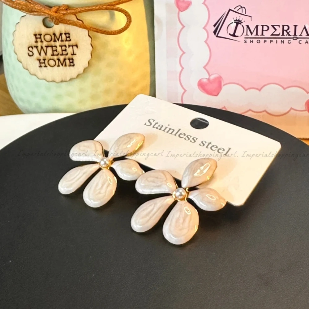 Large, high-shine floral studs with a pearlescent finish and a delicate center bead. A bold yet feminine statement piece.