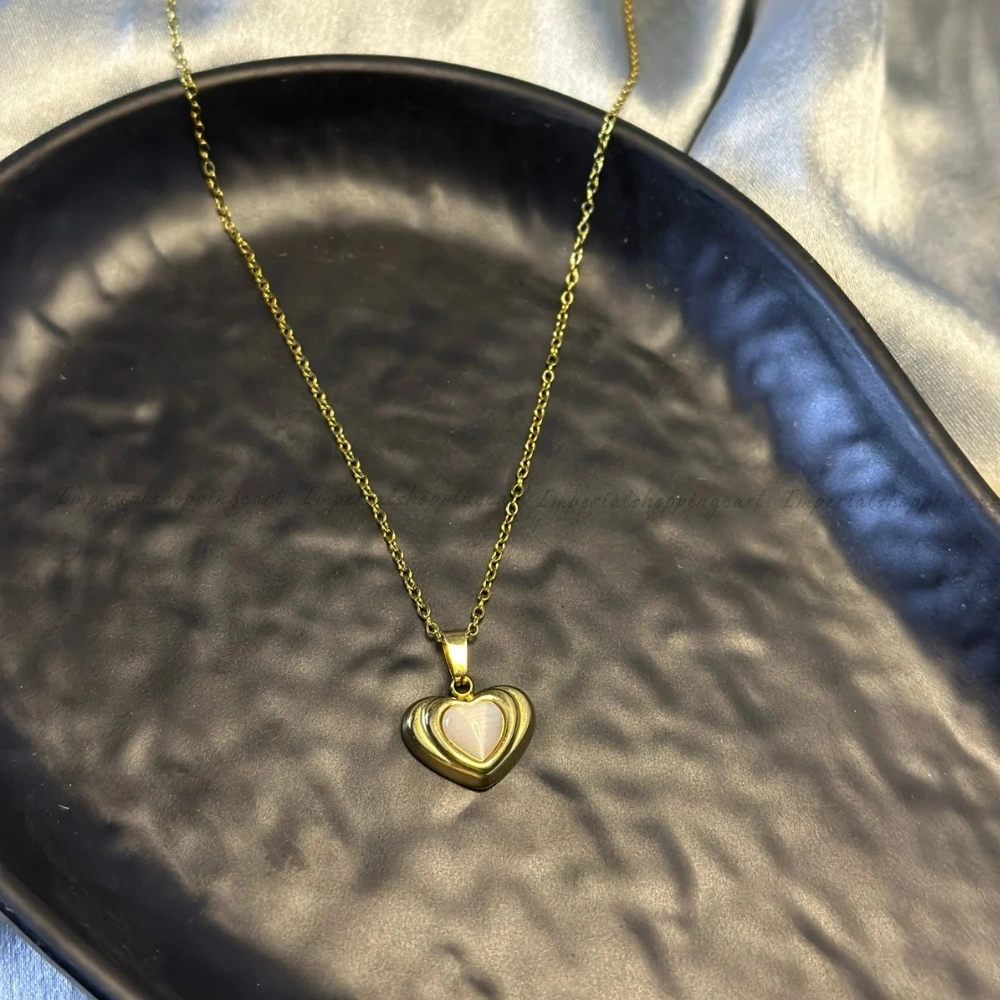 A timeless classic. This necklace features a smooth, polished gold-tone heart with a genuine-look Mother of Pearl inlay at the center. Its clean lines and warm glow make it a versatile staple for any jewelry box.
