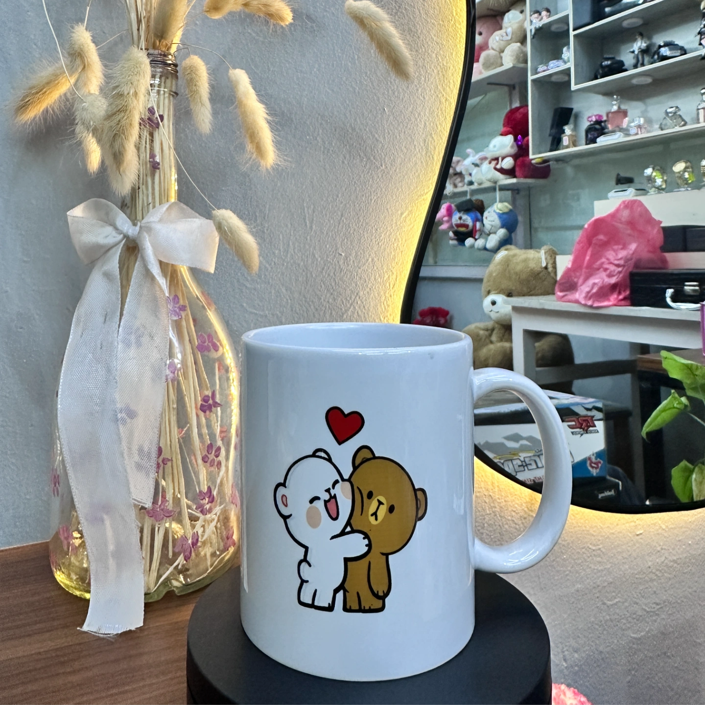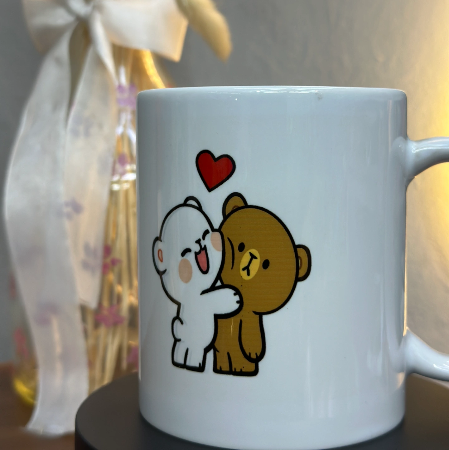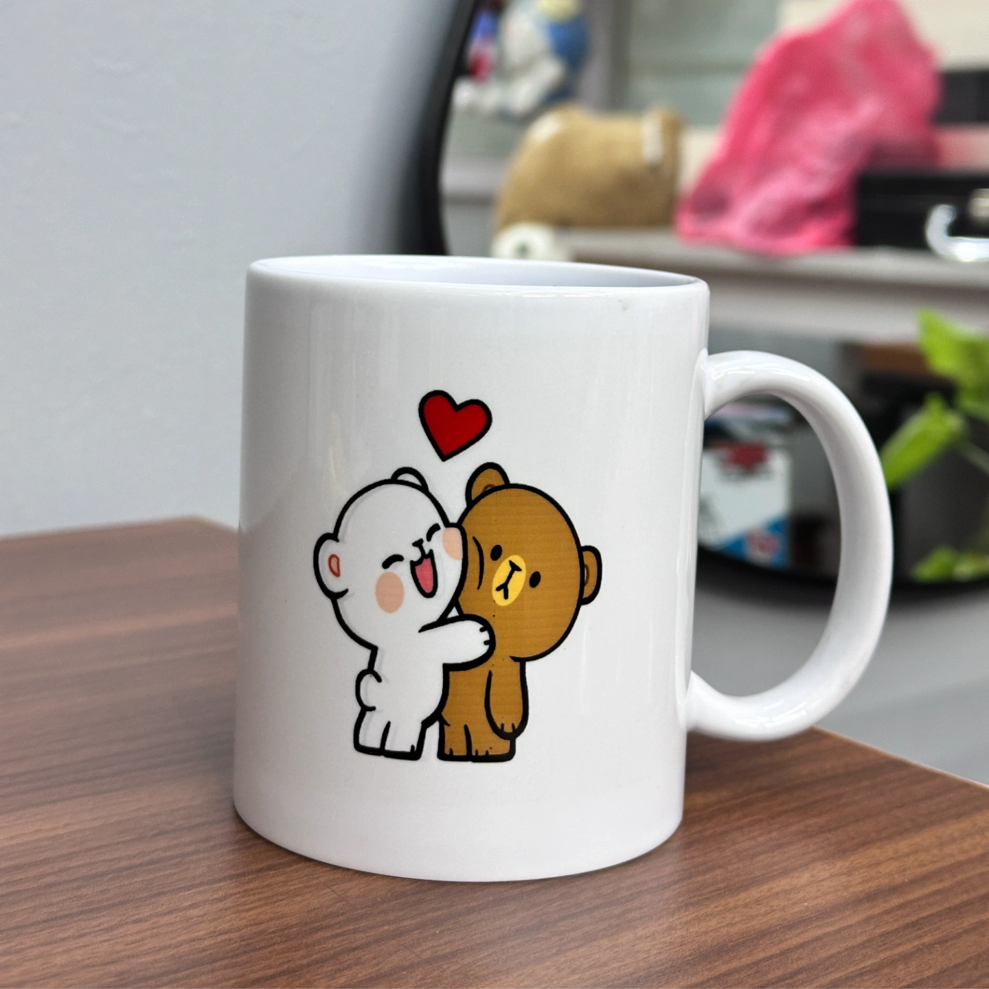 A charming white ceramic mug featuring a heartwarming illustration of a cheerful white bear hugging a bashful brown bear. Topped with a vibrant red heart, this mug is perfect for brightening up your morning coffee or gifting to someone who brings a smile to your face.