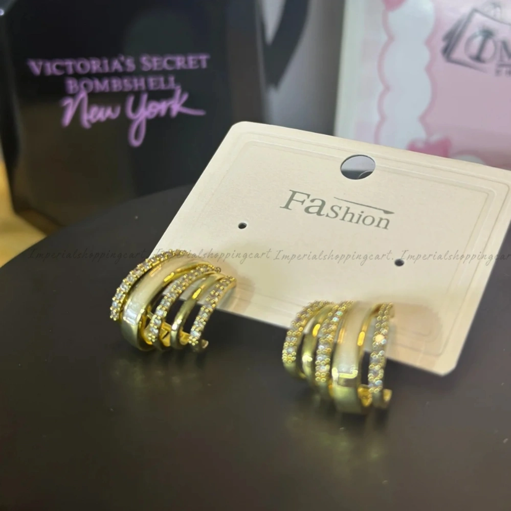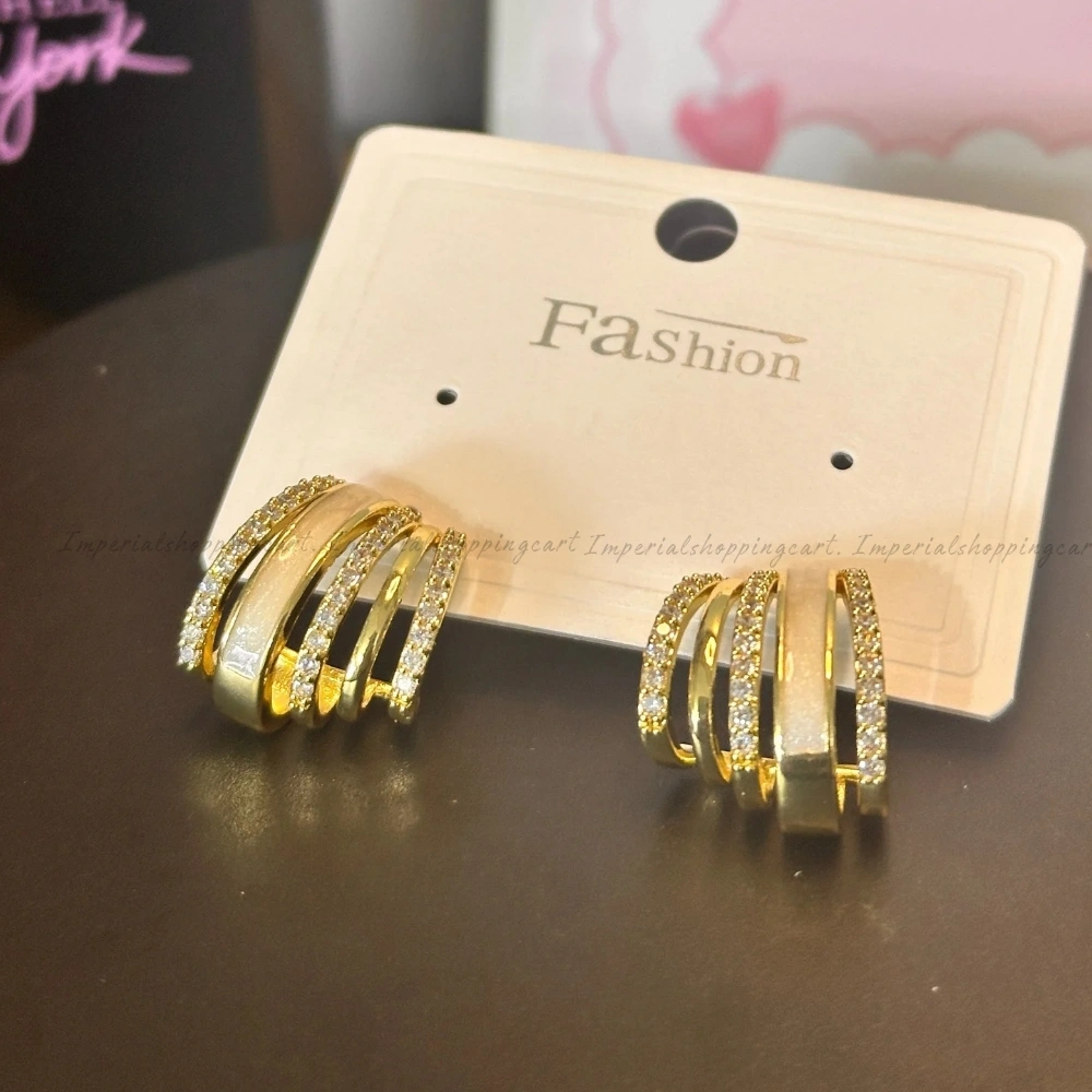 A bold, contemporary take on the classic hoop. These earrings feature five parallel bands: three encrusted with shimmering pavé crystals and two smooth gold-tone bands with a pearlescent inlay. They offer the look of multiple piercings in one chic accessory.