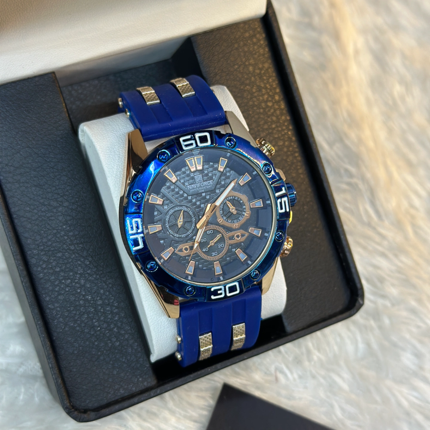 A bold statement piece featuring a deep blue rotating bezel with rose gold accents. The textured carbon-fiber style dial includes multiple sub-dials and is finished with a comfortable blue silicone strap.