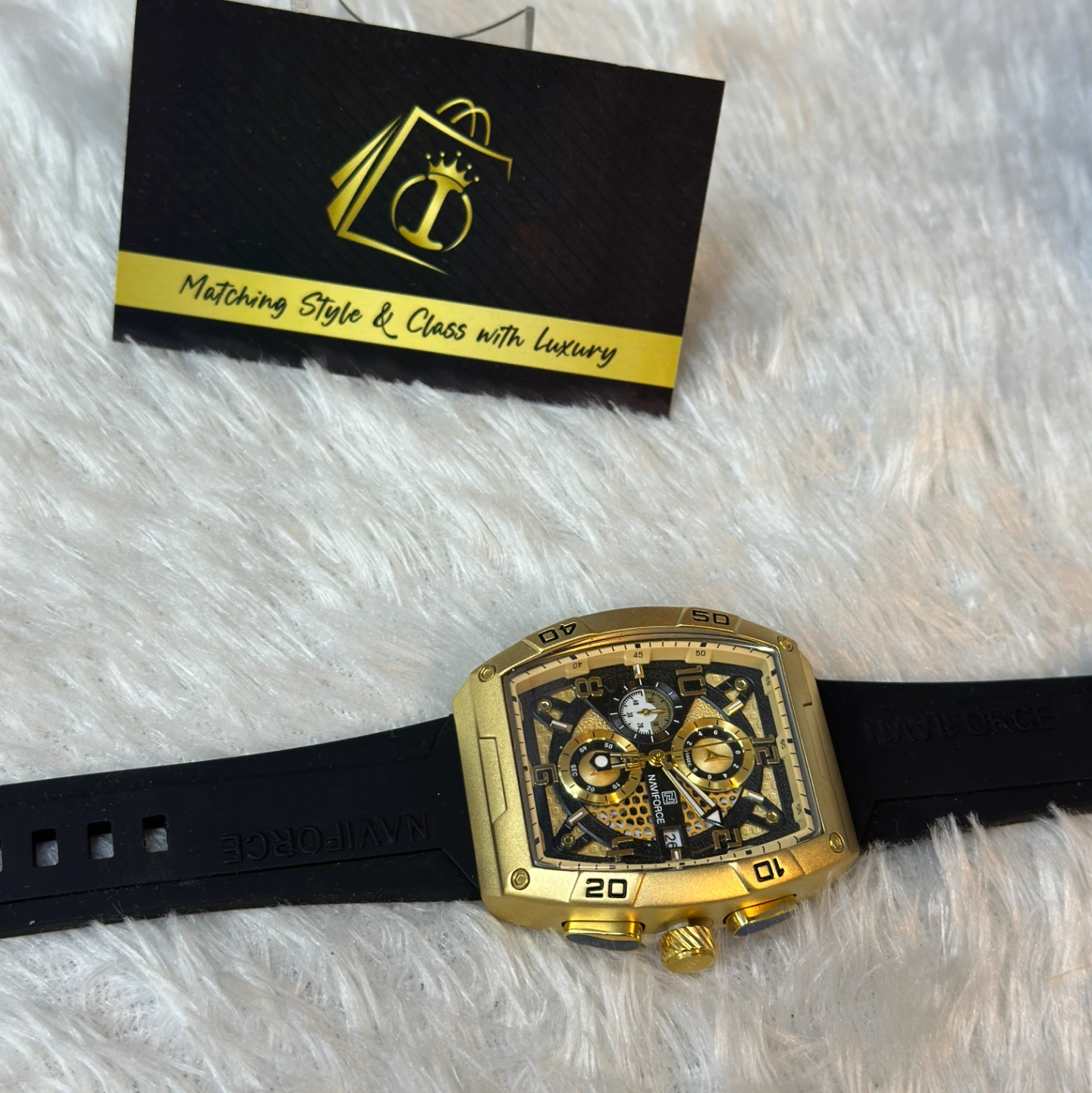 Key Features: Matte gold finish, tachymeter scale on the inner bezel, and a durable black silicone strap for a sporty look.