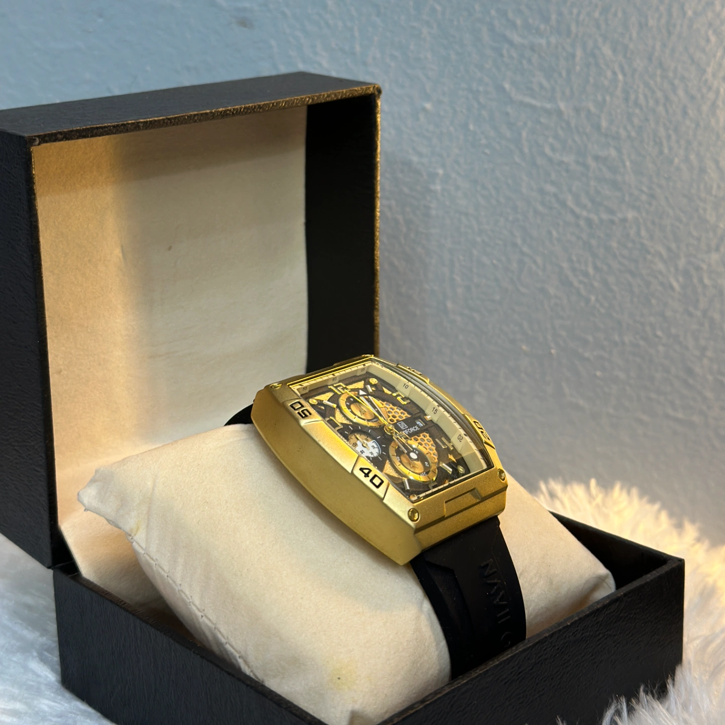 This is a bold, industrial-style watch featuring a tonneau (barrel-shaped) gold-tone case. It has a complex, layered skeletonized dial with three chronograph sub-dials and a date window at the 4 o'clock position.