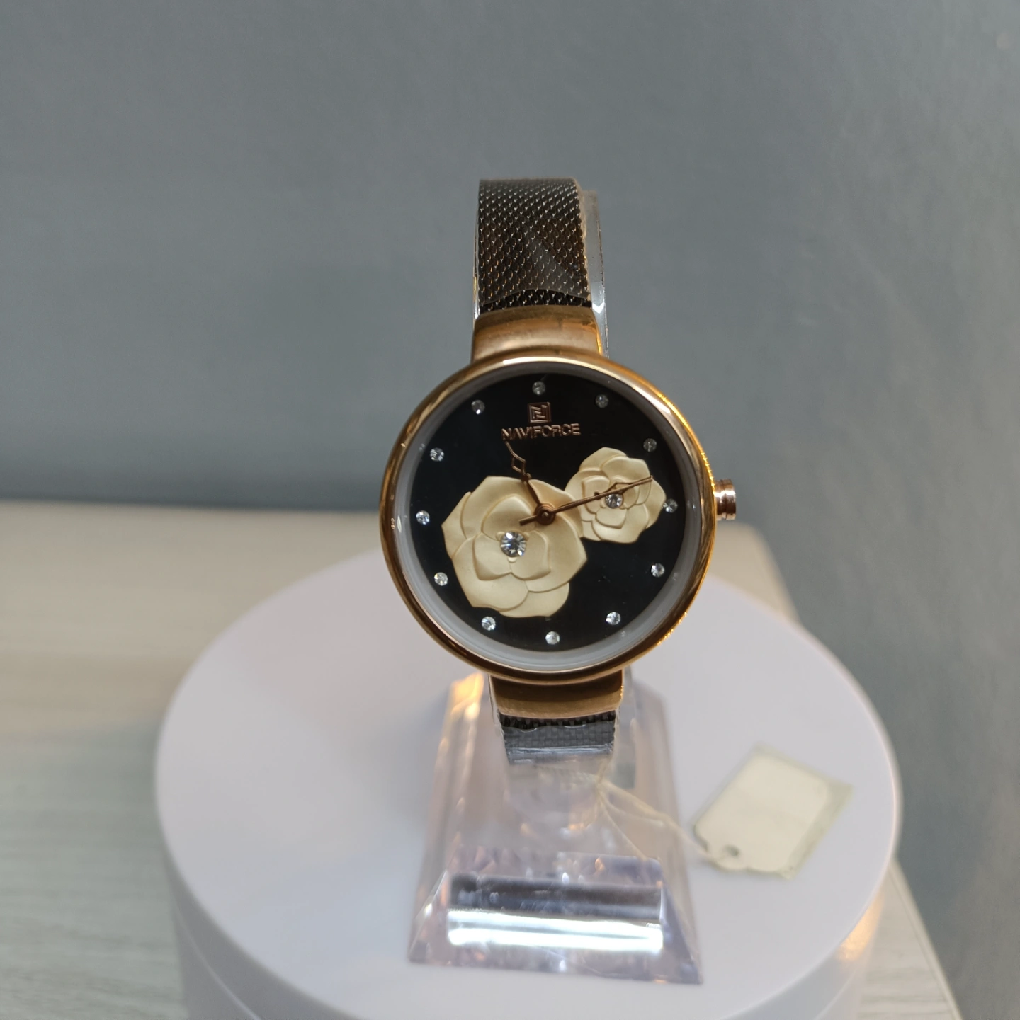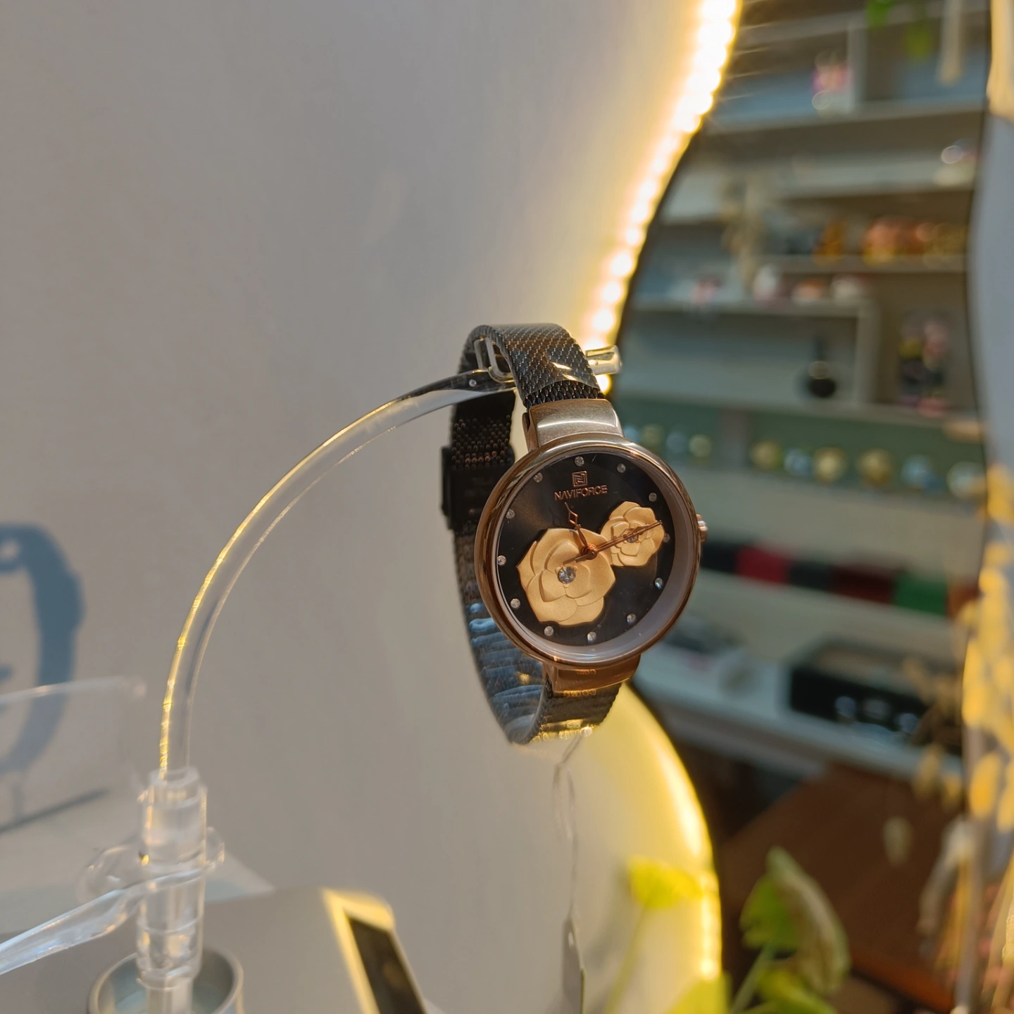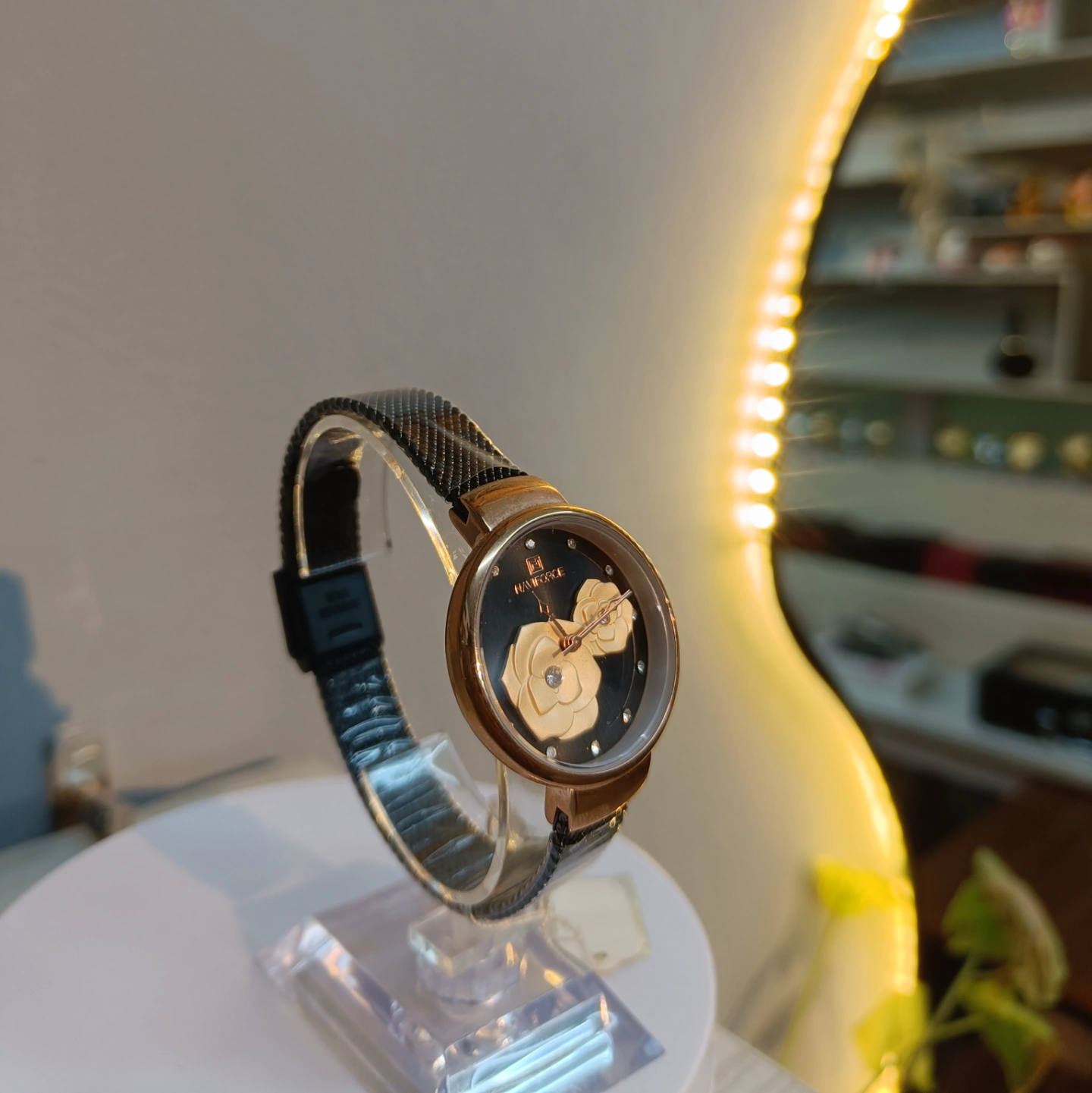 The rose gold-toned case and contrasting black Milanese mesh strap combine to create a modern, romantic look suitable for any elegant occasion.