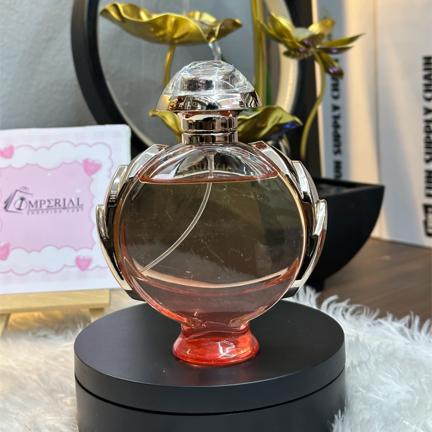 While the name isn't visible on the glass, the circular bottle with "laurel leaf" metal wings on the side is the signature look of Paco Rabanne’s Olympéa.