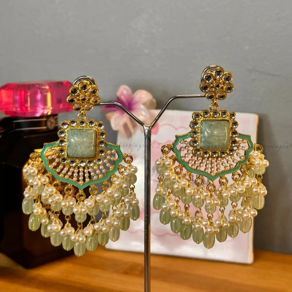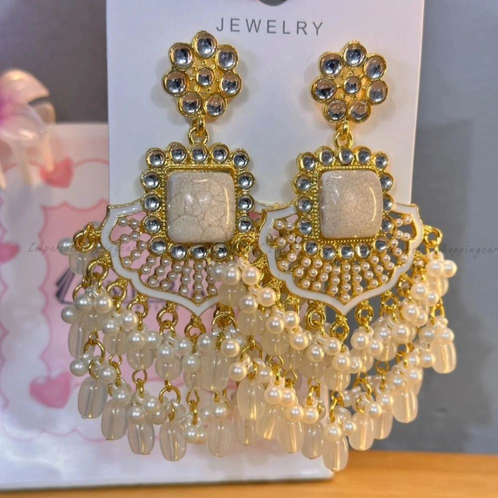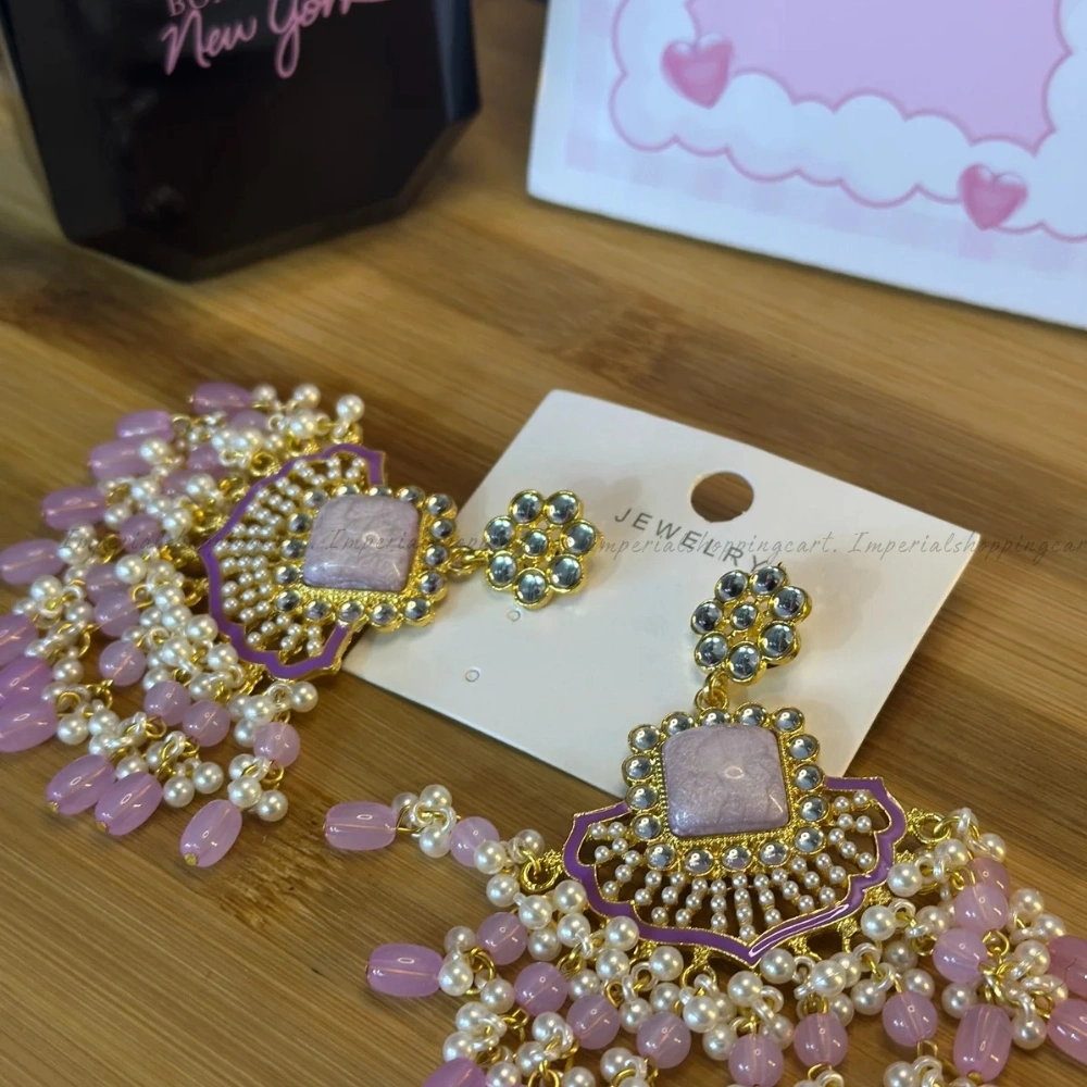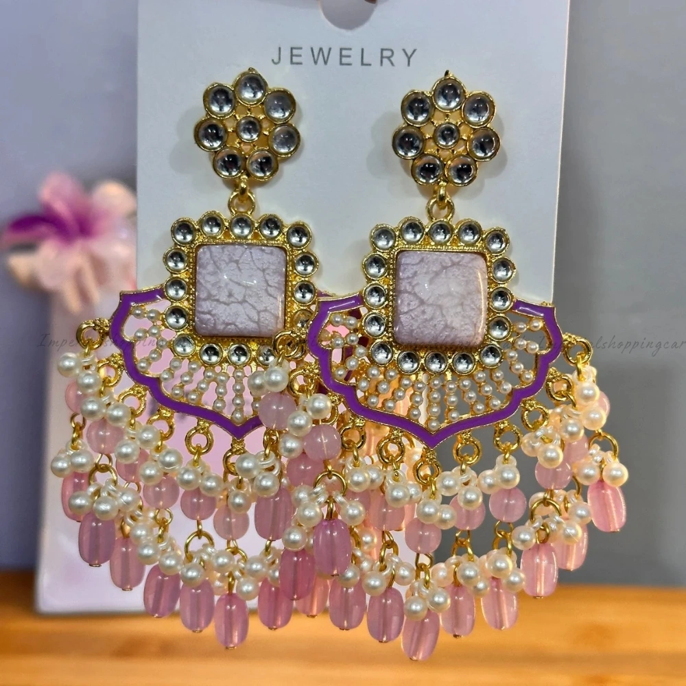 Design: The earrings showcase a floral stud leading to a square marble-effect stone. The lower section is a wide, purple-enameled fan shape (Chandbali style) decorated with pearls and multiple tiers of hanging pastel pink glass beads.