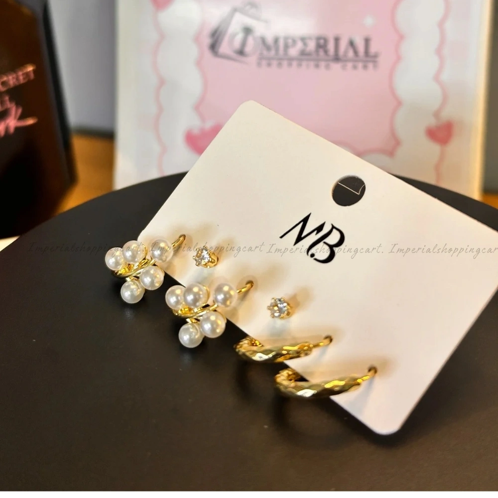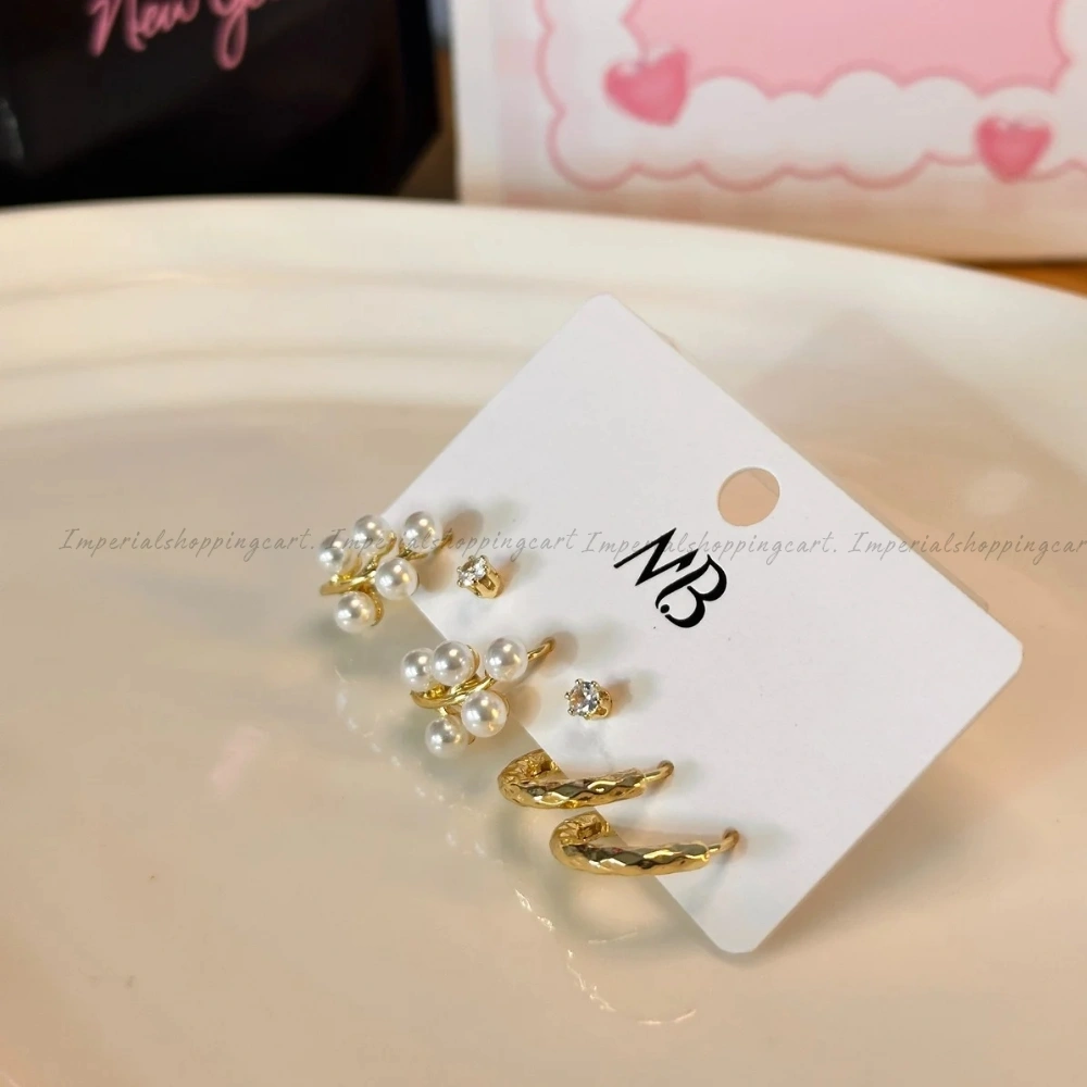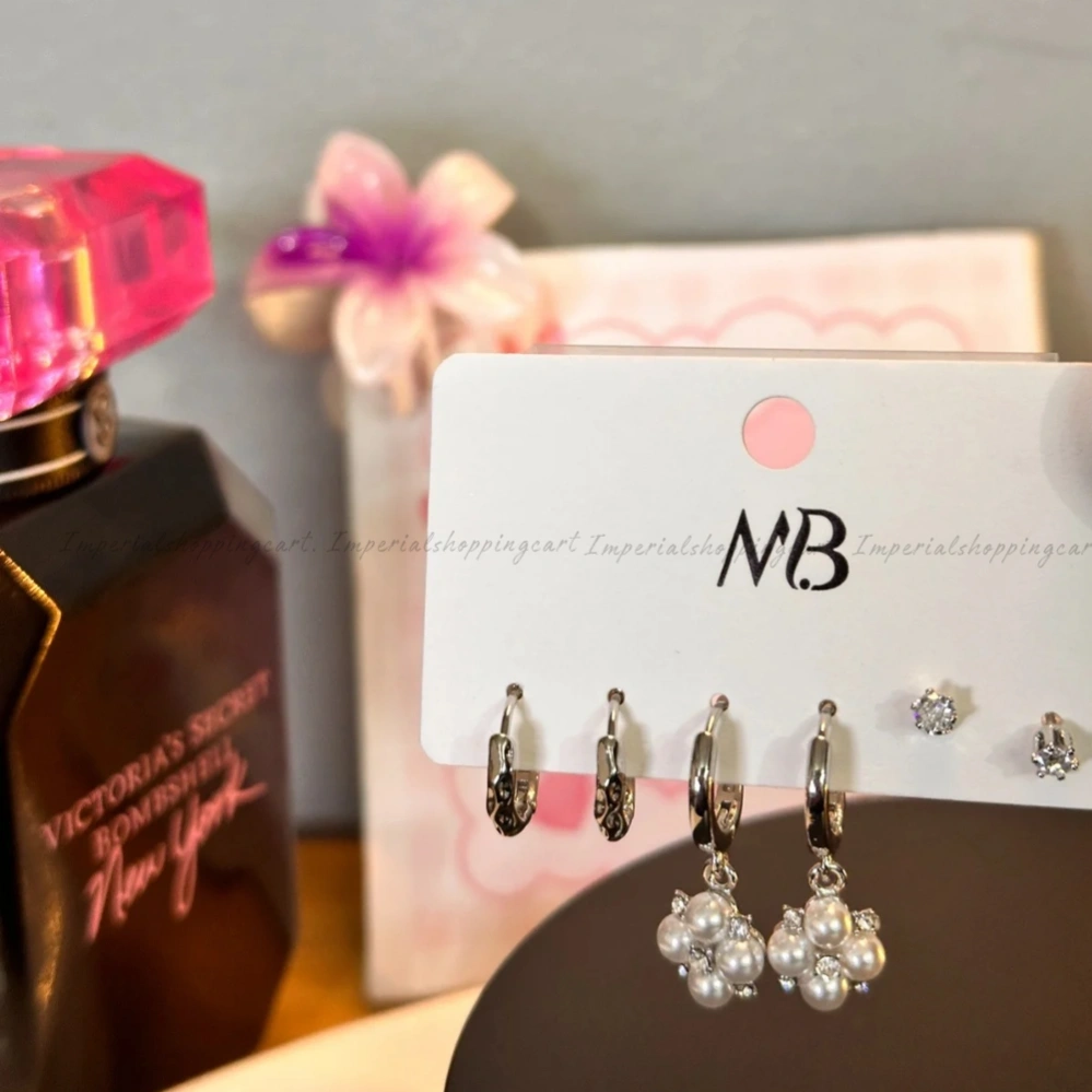 A multi-piercing set featuring sleek silver hoops and a standout pair of huggies adorned with a cluster of five pearls.