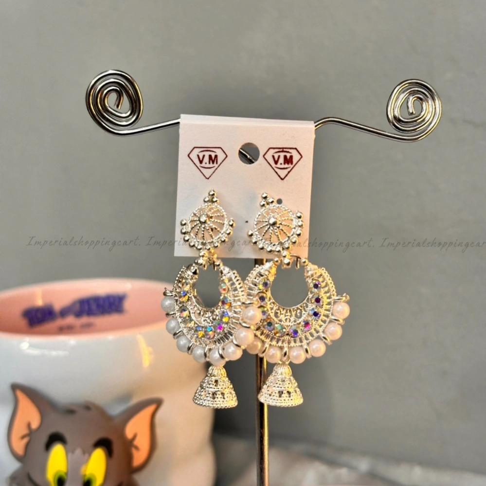 Description: These earrings feature a lush cluster of small white pearls at the stud, resembling a tiny bouquet. The jhumka bell below is encrusted with sparkling crystals and finished with a row of matching pearls along the bottom rim.
