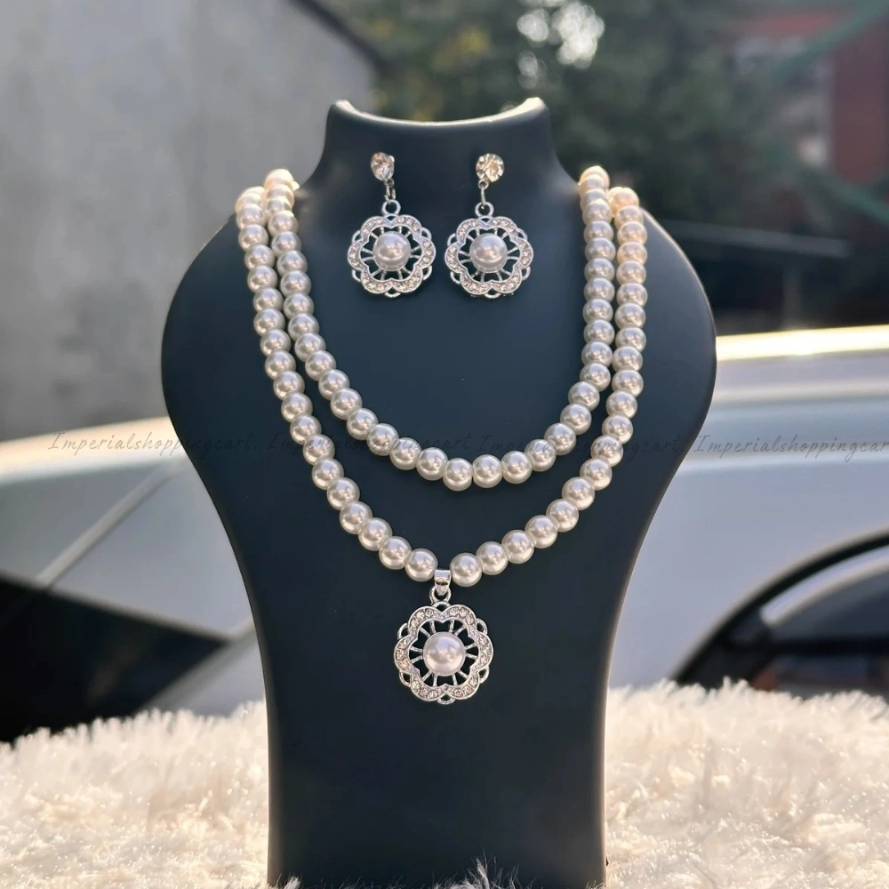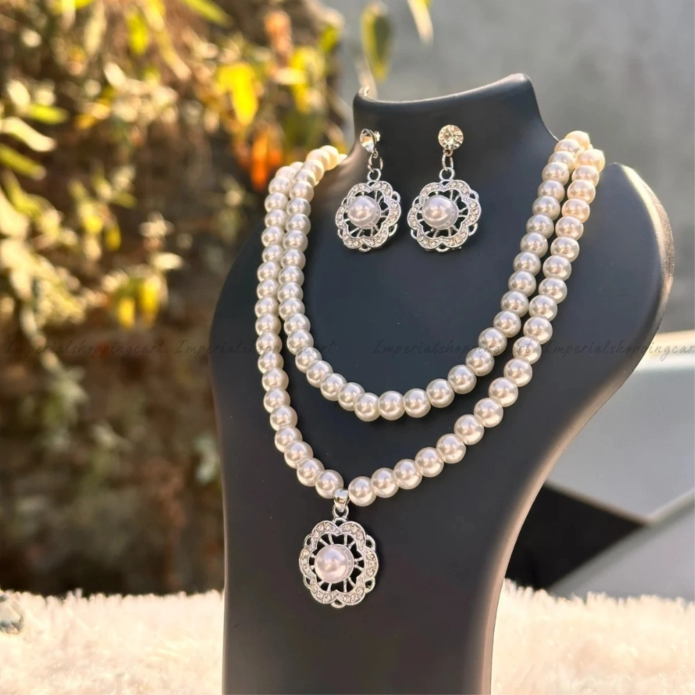 A sophisticated jewelry set featuring a double strand of lustrous faux pearls. The centerpiece is a floral-patterned pendant encrusted with crystals, matching the included stud earrings. Perfect for weddings or formal gatherings.