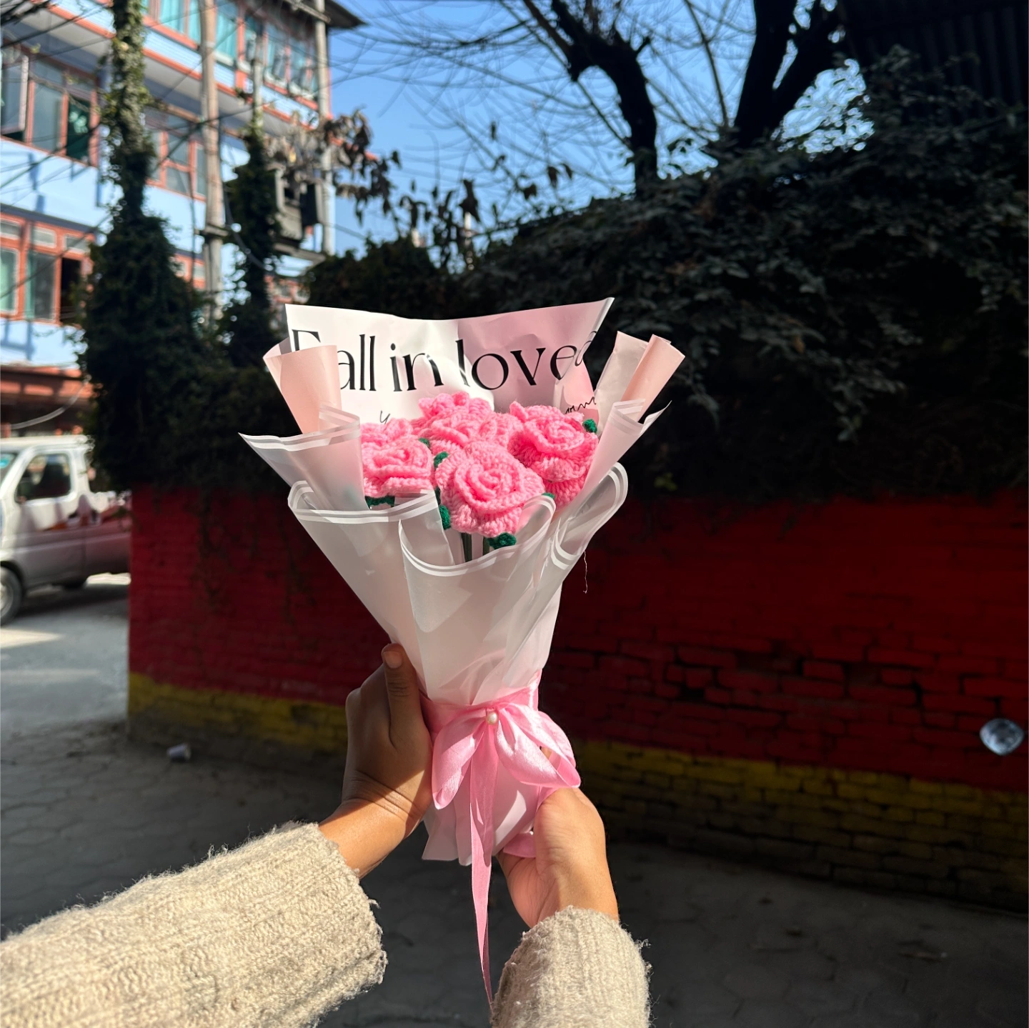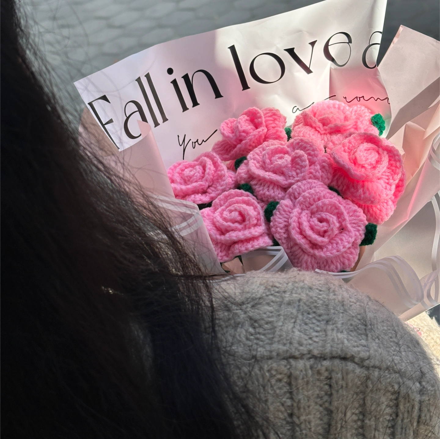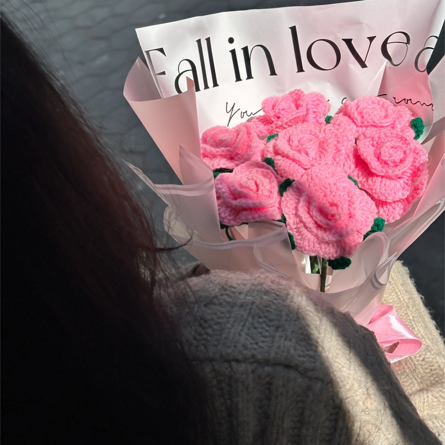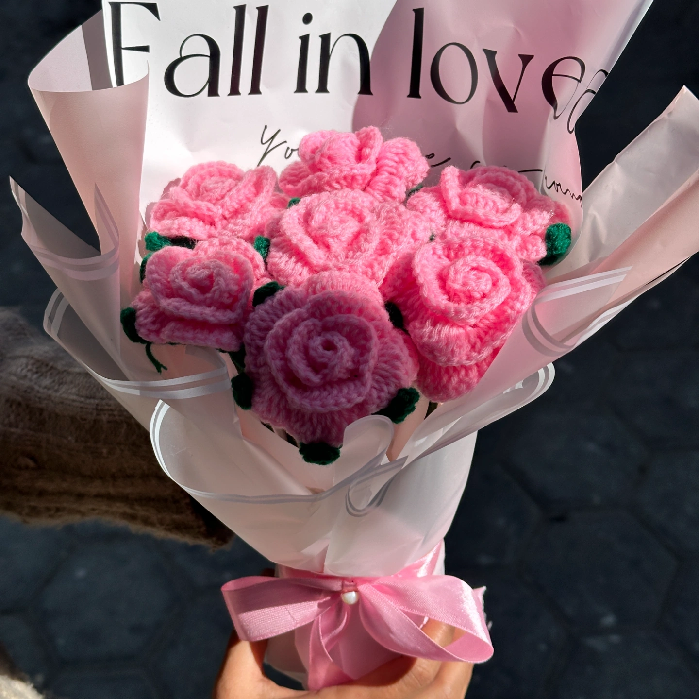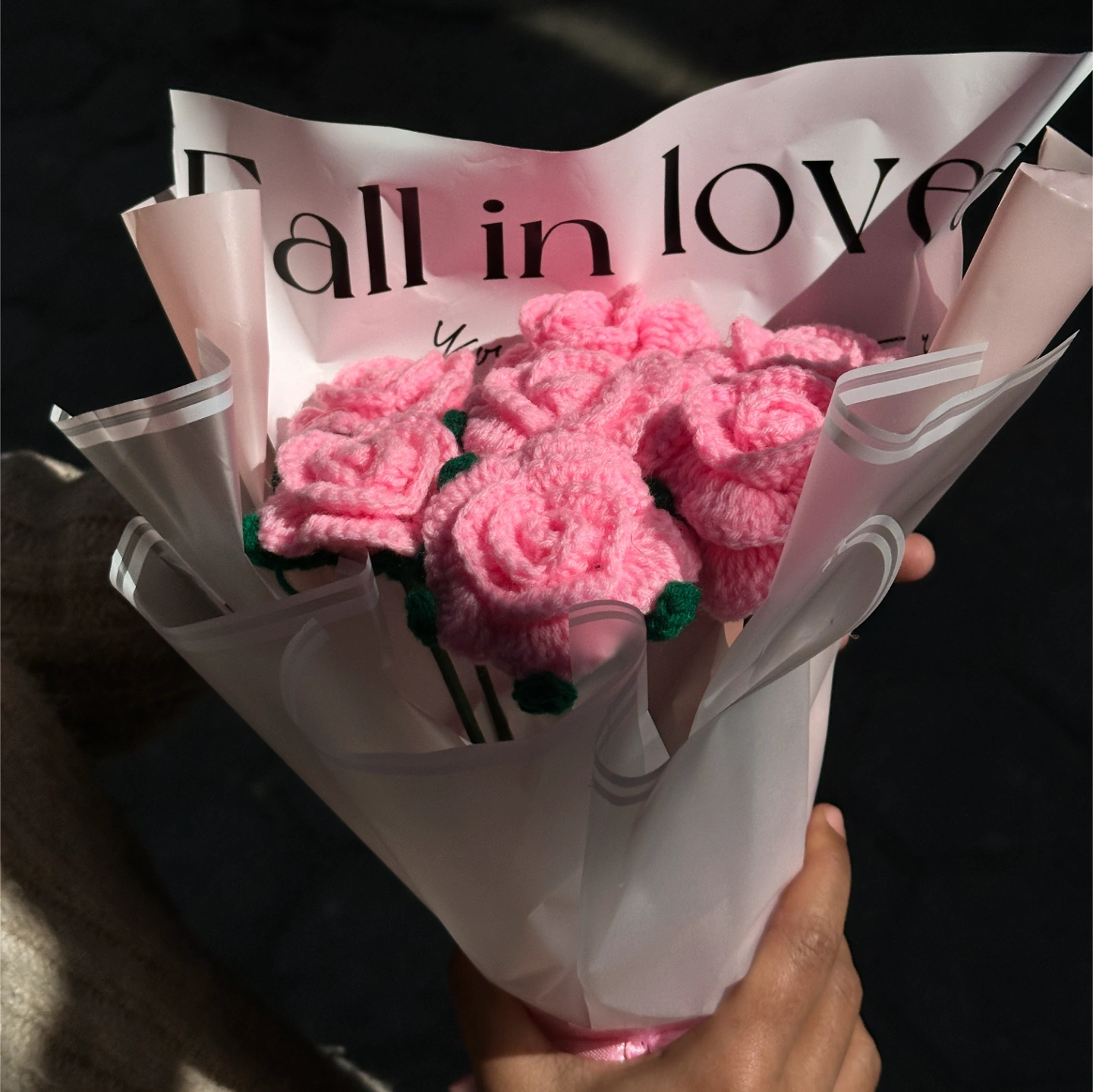 Hand-stitched with love, this bouquet features delicate pink roses crafted from high-quality yarn. Wrapped in frosted paper with a "Fall in Love" message, it’s a timeless gift that never wilts. Perfect for a romantic gesture or a sweet surprise for a friend.