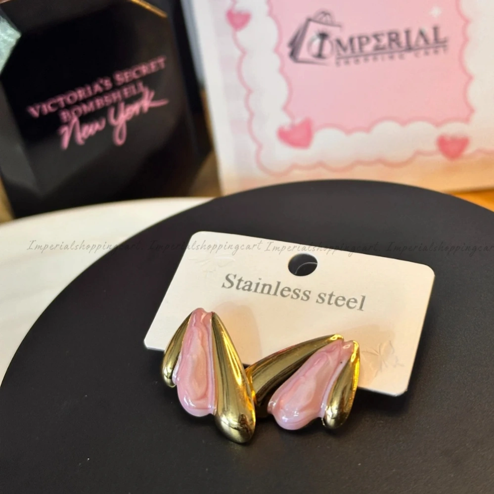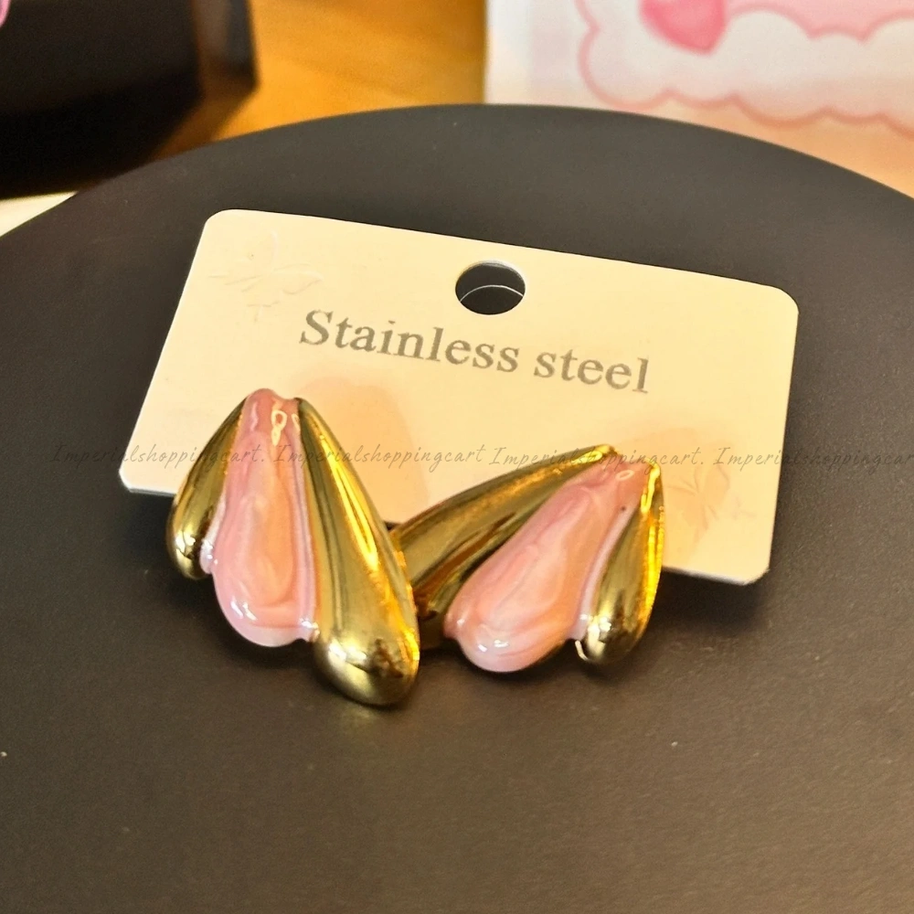 Sleek stainless steel gold-plated studs featuring a unique pink marbled inlay. Modern, durable, and stylish.