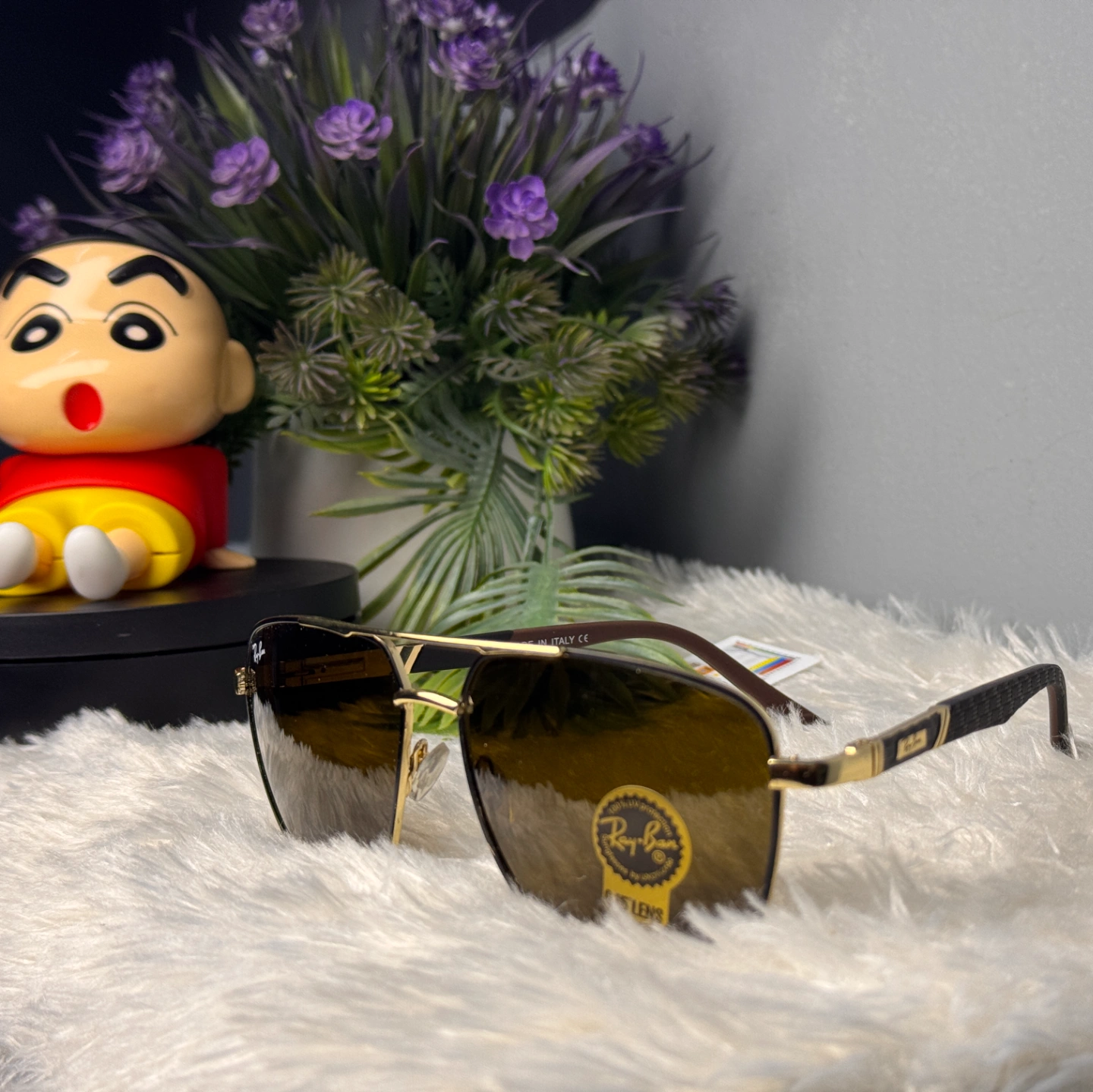Gold-toned metal aviator-style sunglasses with brown lenses and a distinctive black textured pattern on the temples.