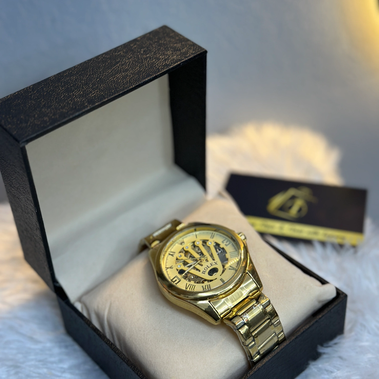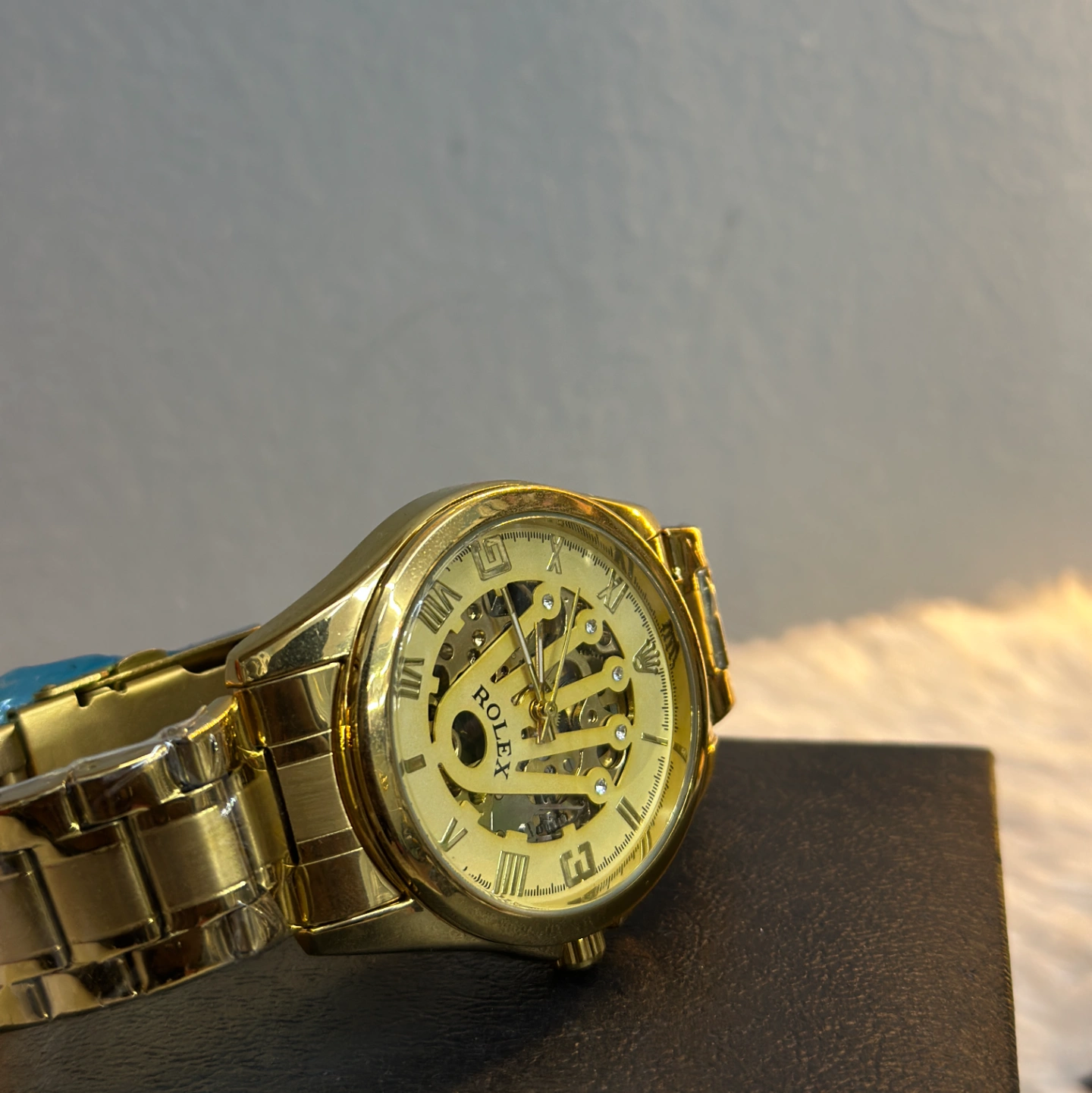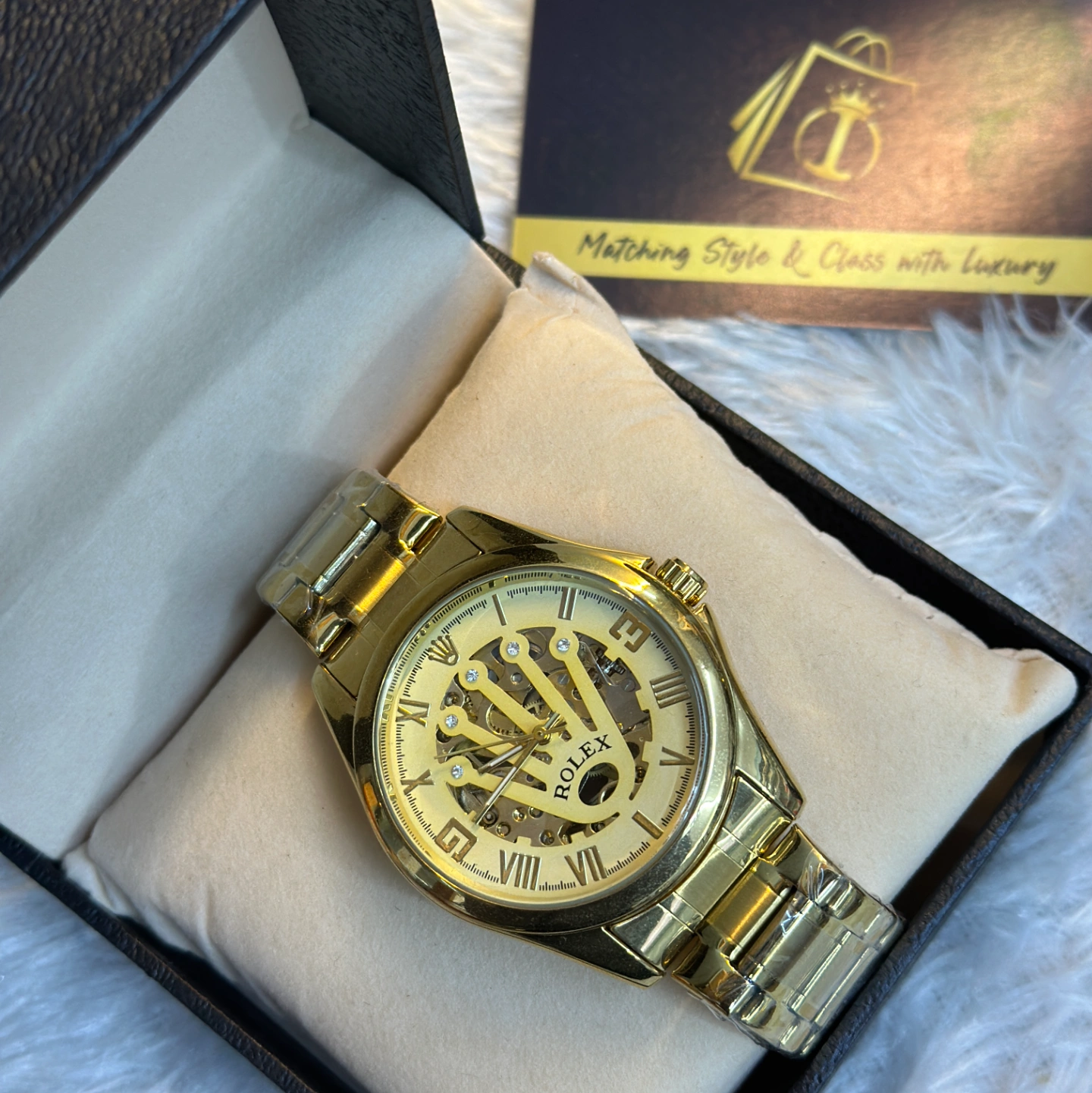 A luxury-inspired gold-tone watch featuring a skeletonized dial that reveals the inner mechanical gears. The dial is uniquely designed with a large "Crown" motif cutout.