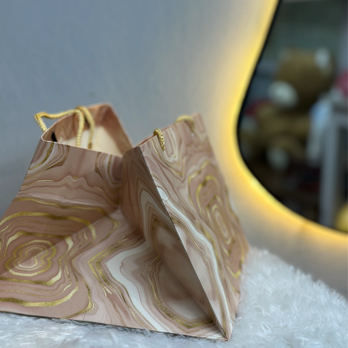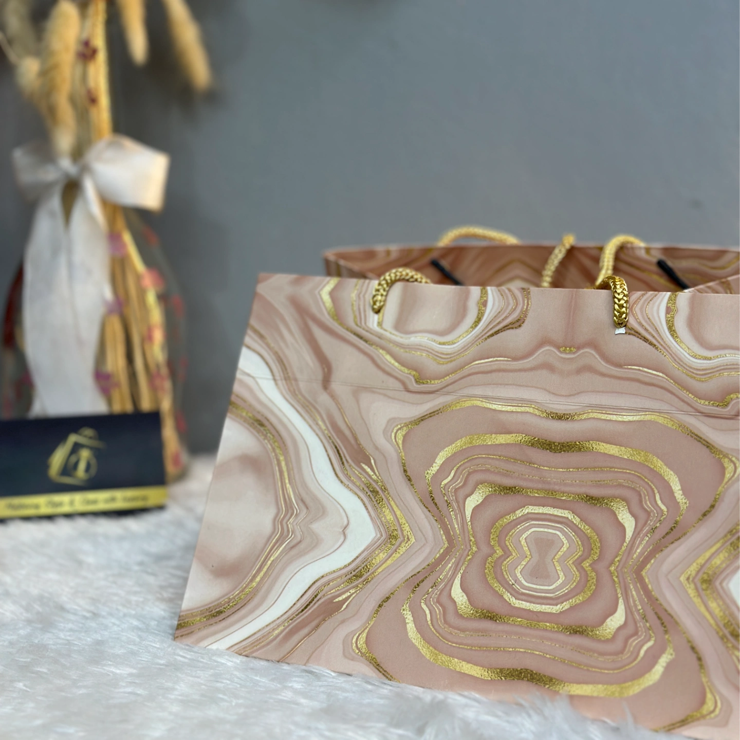 A stunning wide-gusset bag featuring a pink and gold marbleized agate pattern. Includes braided gold rope handles for a heavy-duty luxury feel.