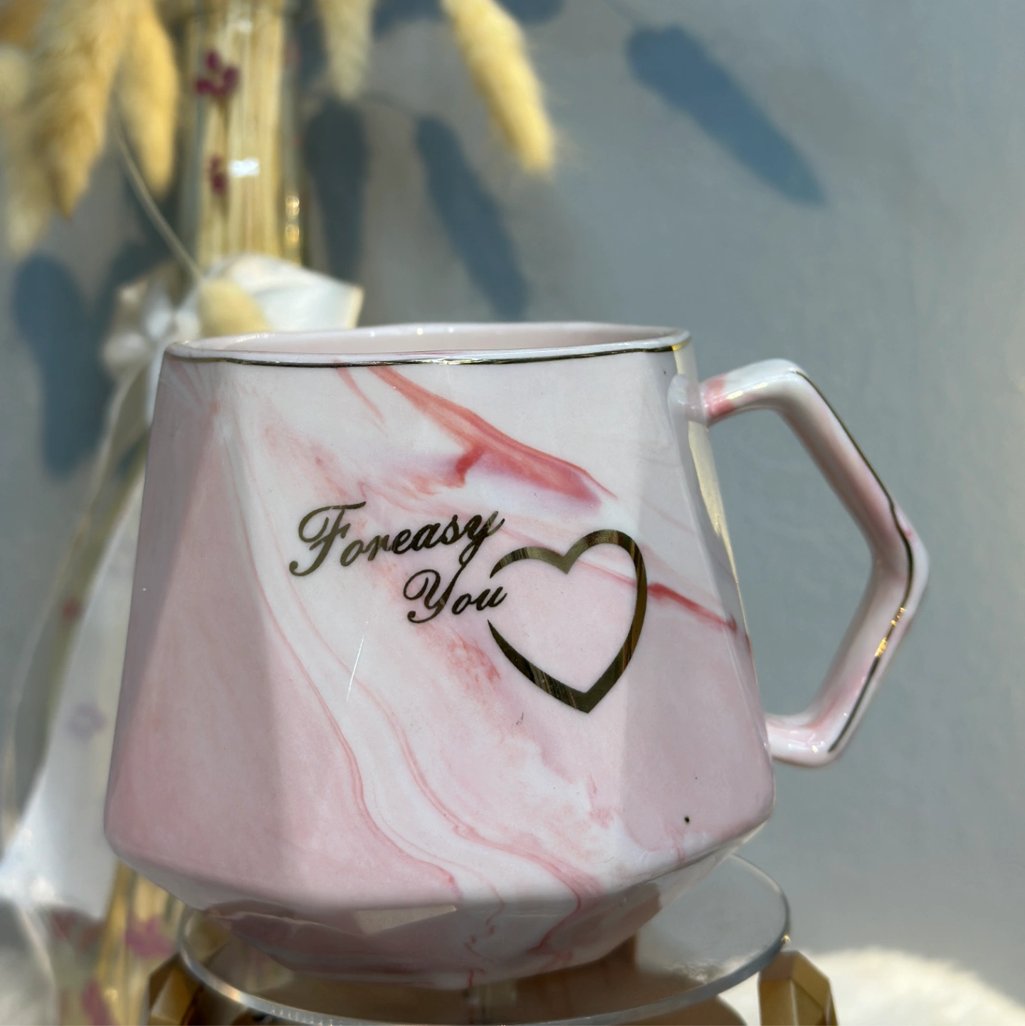 An elegant, geometric-shaped ceramic mug featuring a soft pink marble swirl and metallic gold accents. Perfect for a sophisticated morning coffee or as a thoughtful gift.