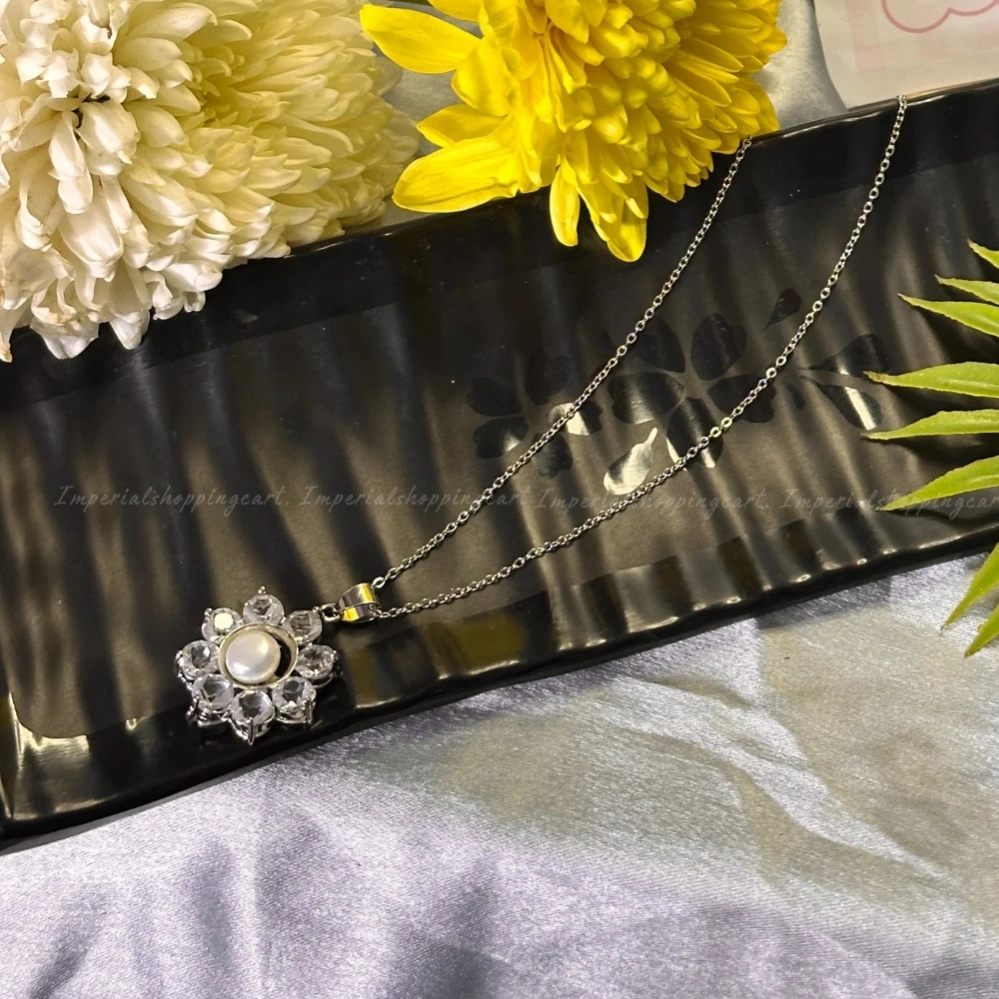 A high-glamour silver-toned necklace featuring a large floral pendant. The "petals" are made of brilliant-cut clear crystals that surround a smooth, lustrous pearl center. An eye-catching piece for evening wear.
