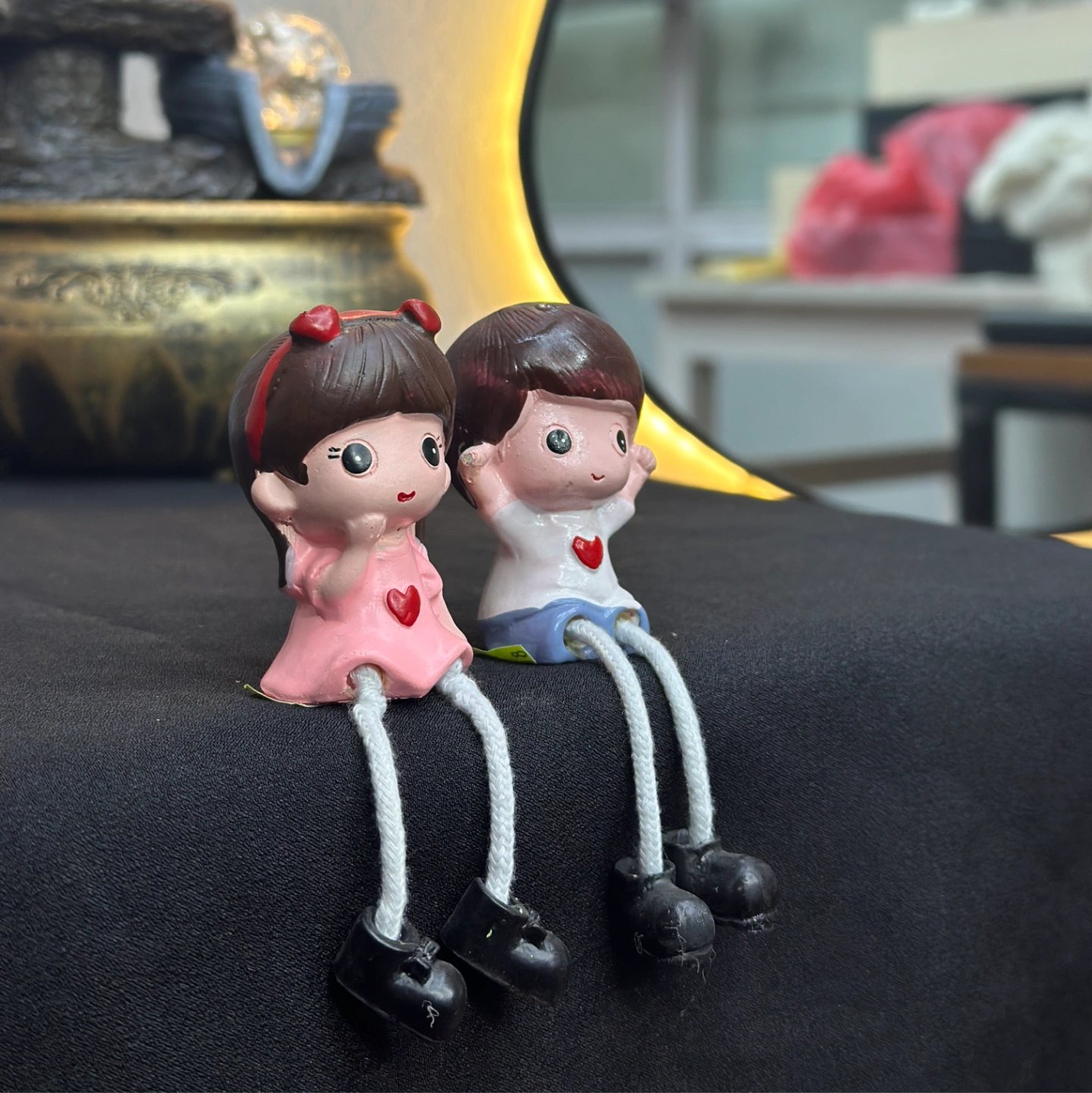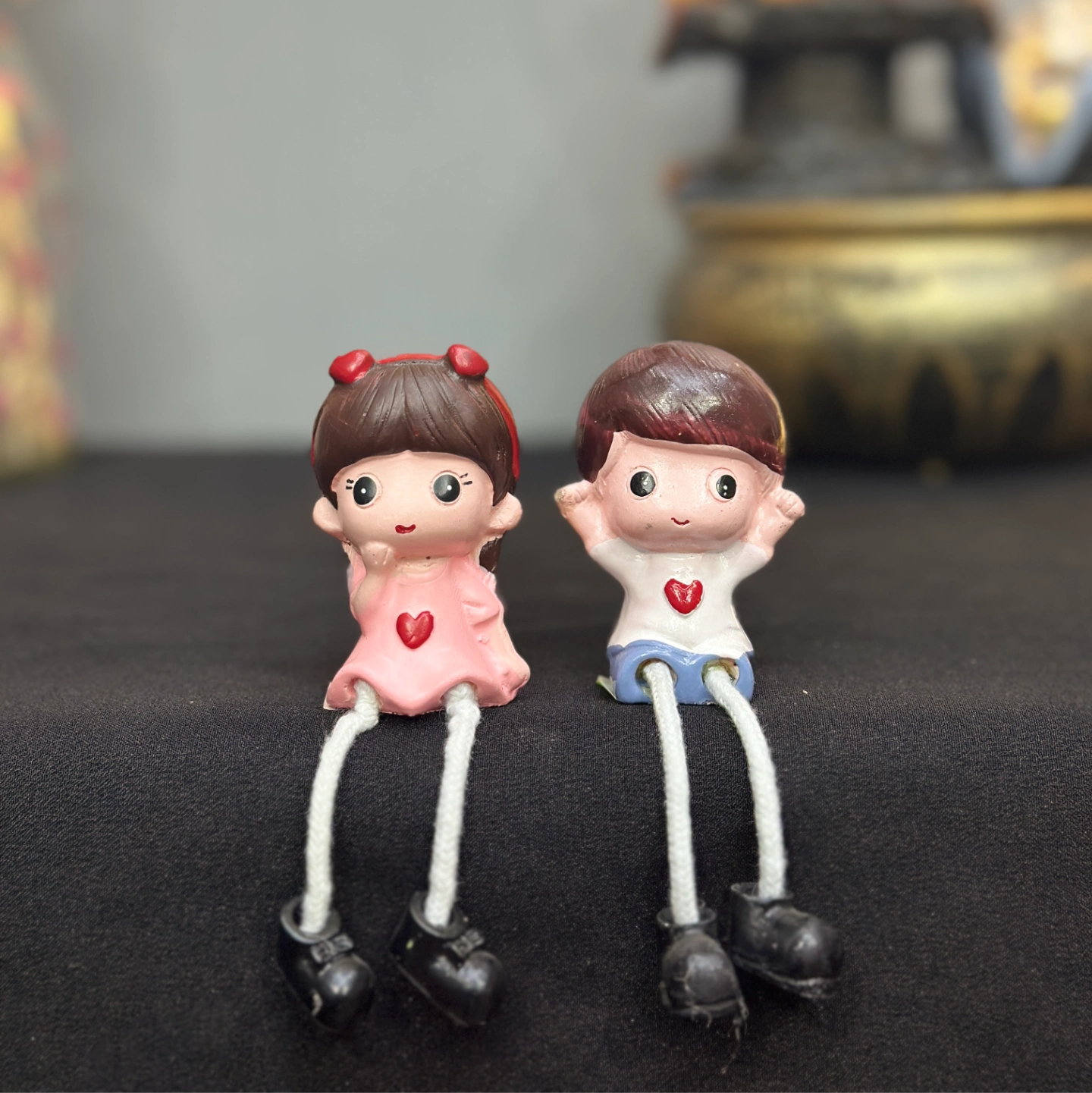 Description: Add a playful touch to your shelves with these "dangling leg" figurines. Featuring a boy and girl in matching pink and blue outfits with heart motifs, they are designed to sit on the edge of a table or shelf.