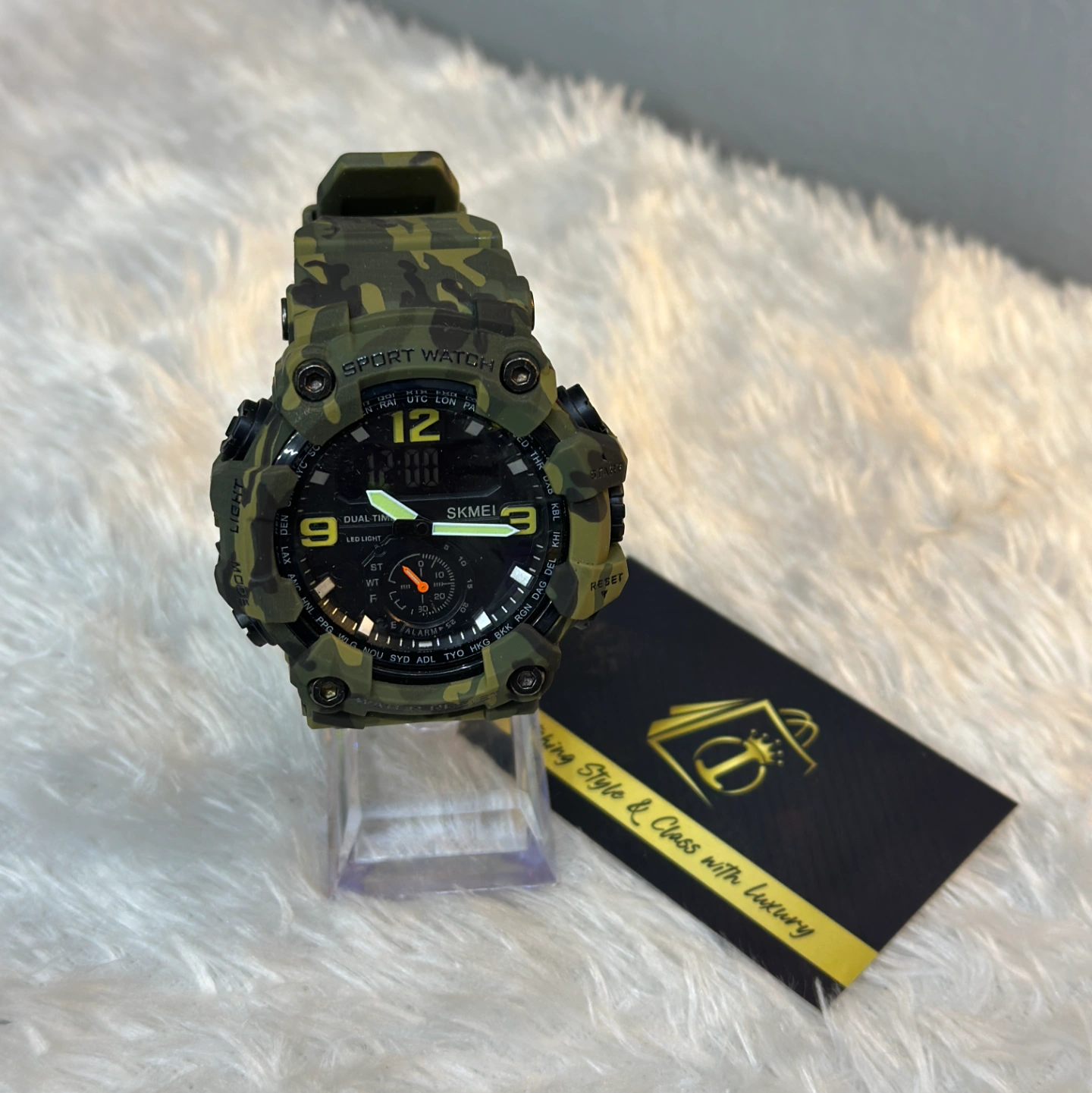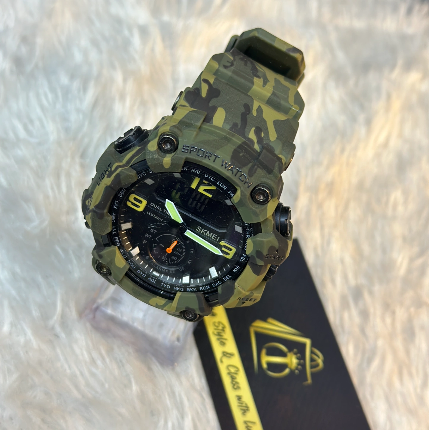 A heavy-duty digital-analog hybrid watch designed for the outdoors. It features a green forest camo strap, a shock-resistant case, and "Dual Time" functionality with high-visibility luminous hands.