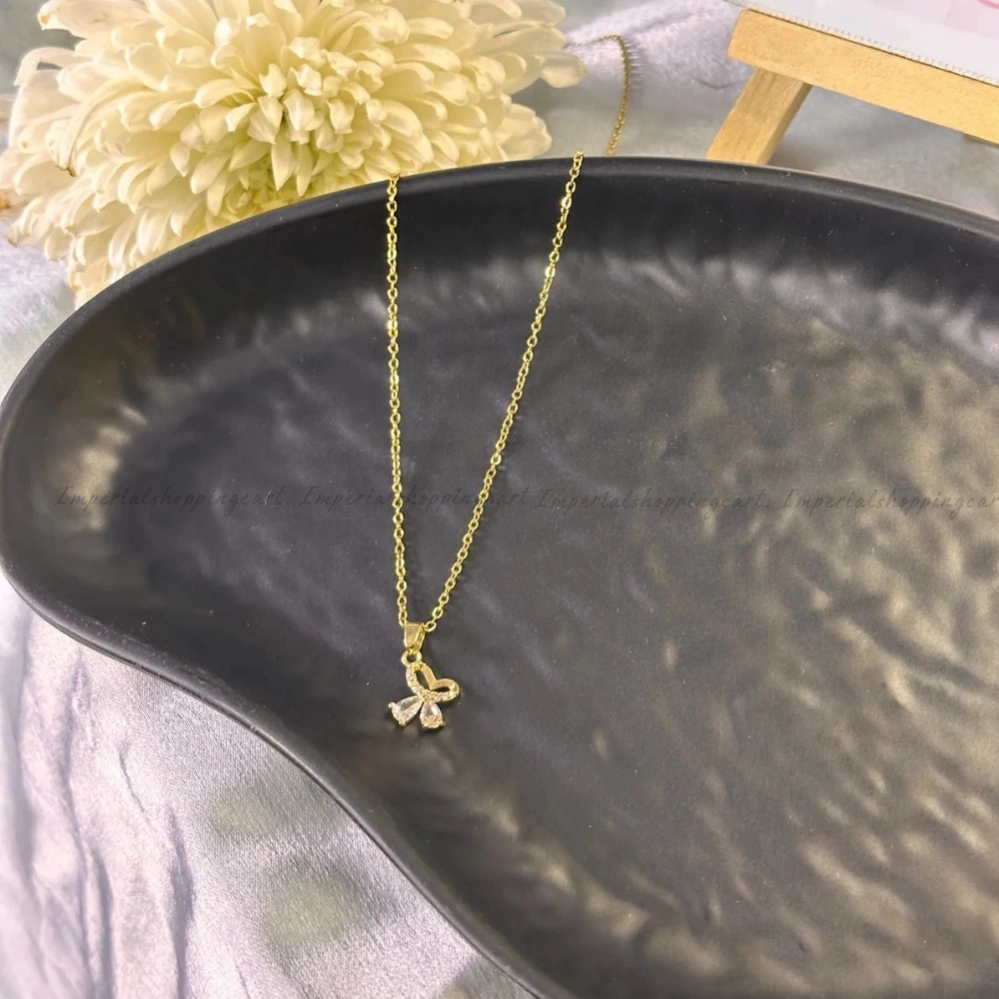 This charming gold-toned necklace features a whimsical ribbon bow pendant encrusted with shimmering cubic zirconia crystals. The delicate chain and feminine design make it a perfect gift for birthdays or special occasions.