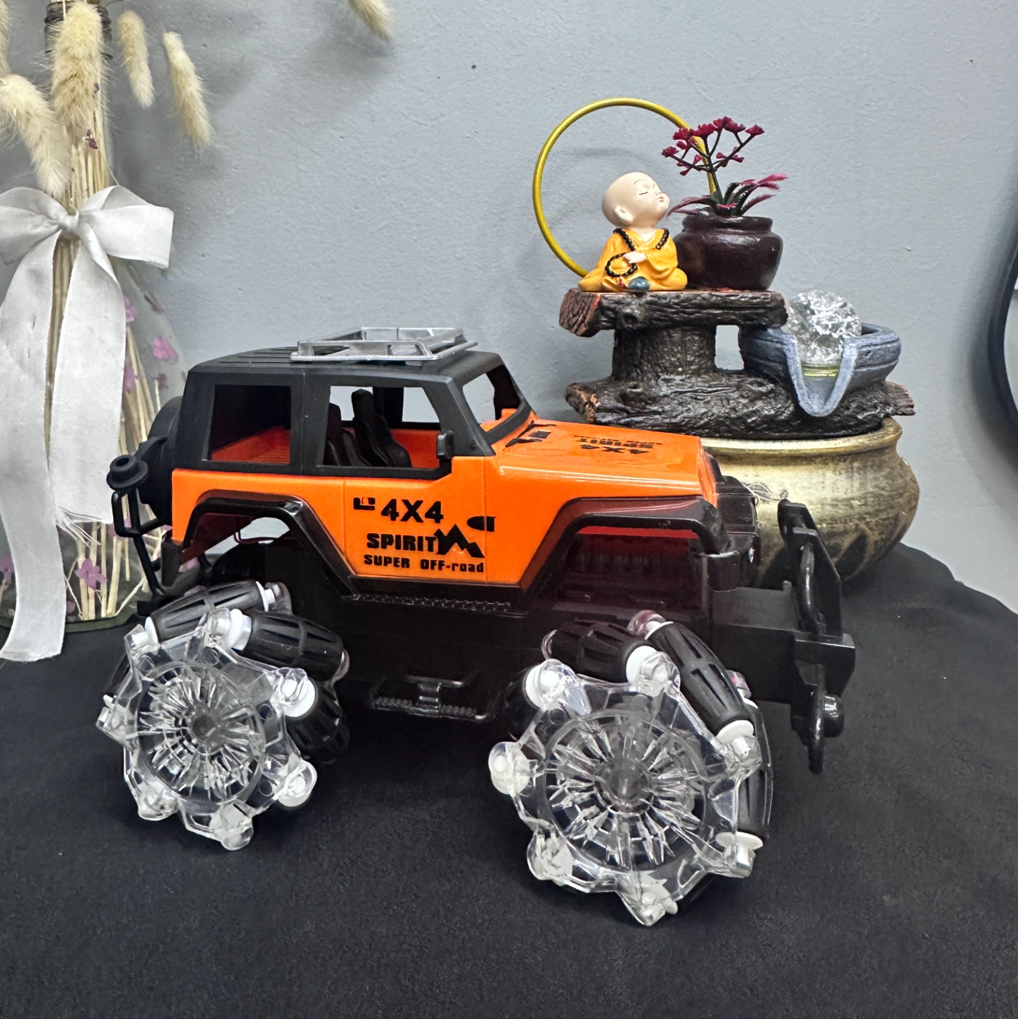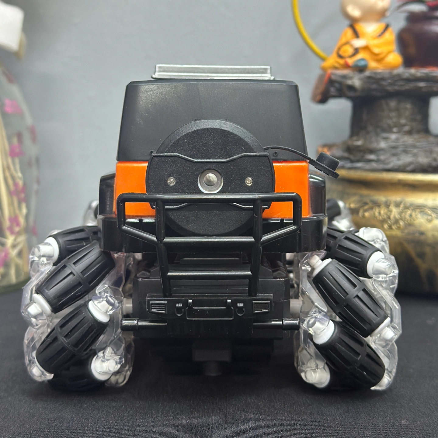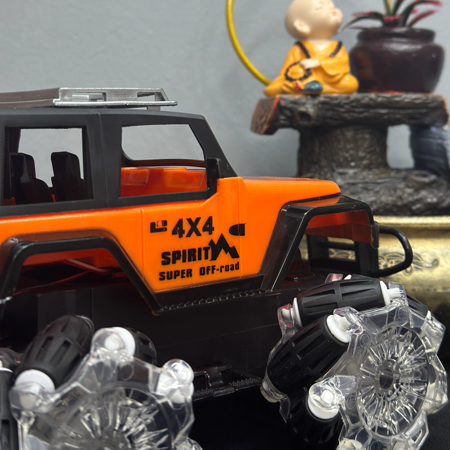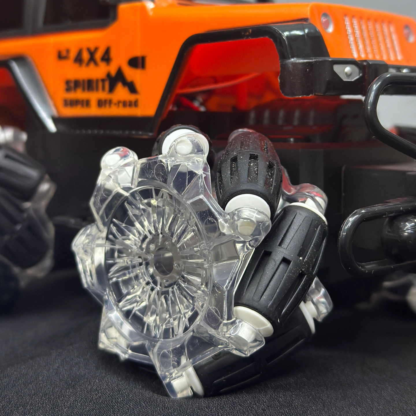 Description: An orange-and-black performance RC car featuring advanced Mecanum wheels (rollers set at 45-degree angles). This design allows it to drift sideways and spin in place effortlessly, earning its "Spirit" branding for its high-energy movement.