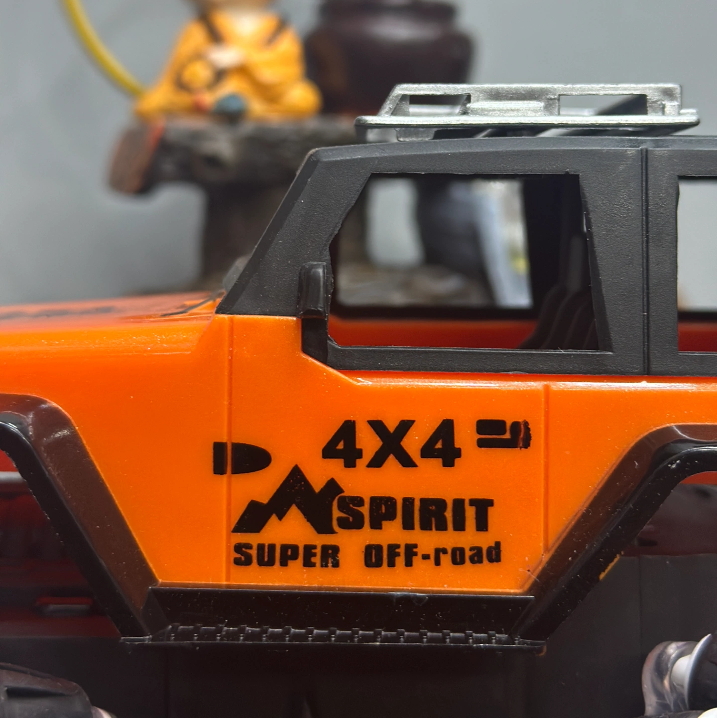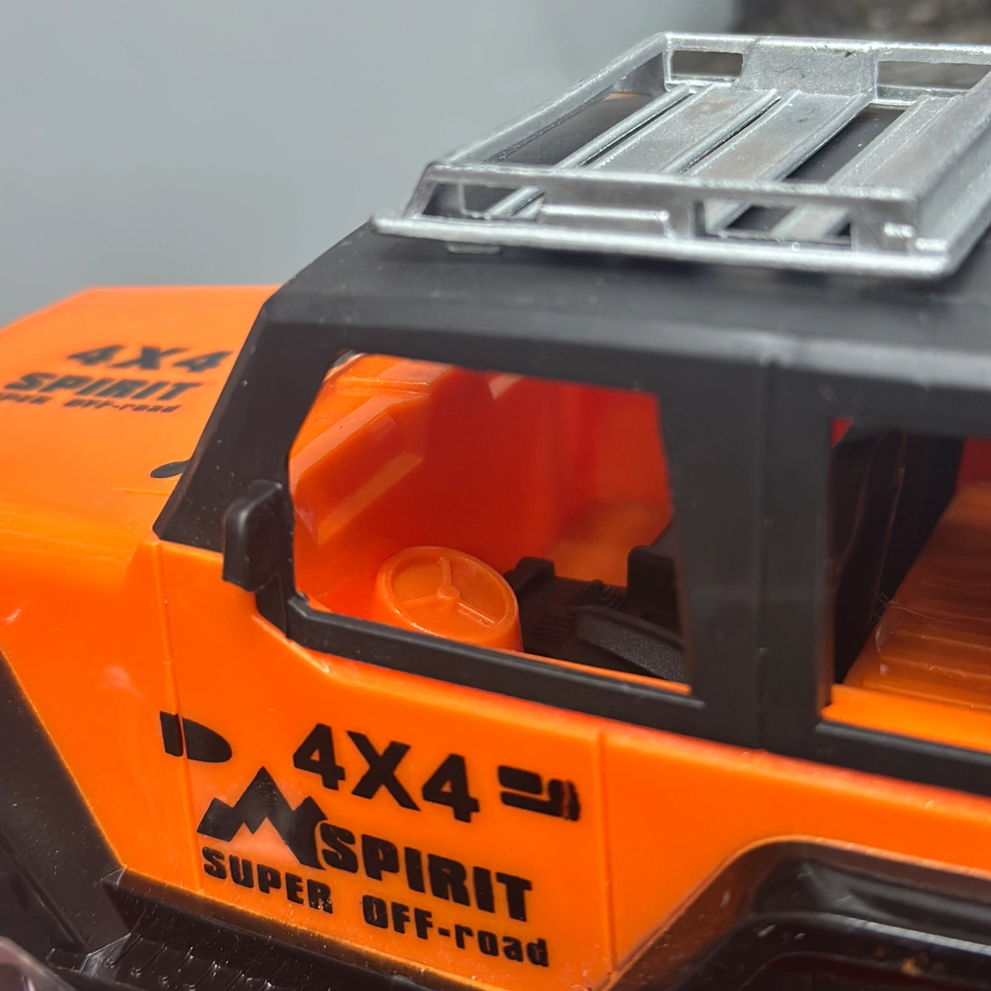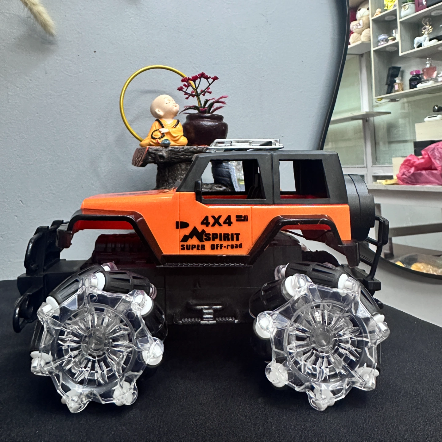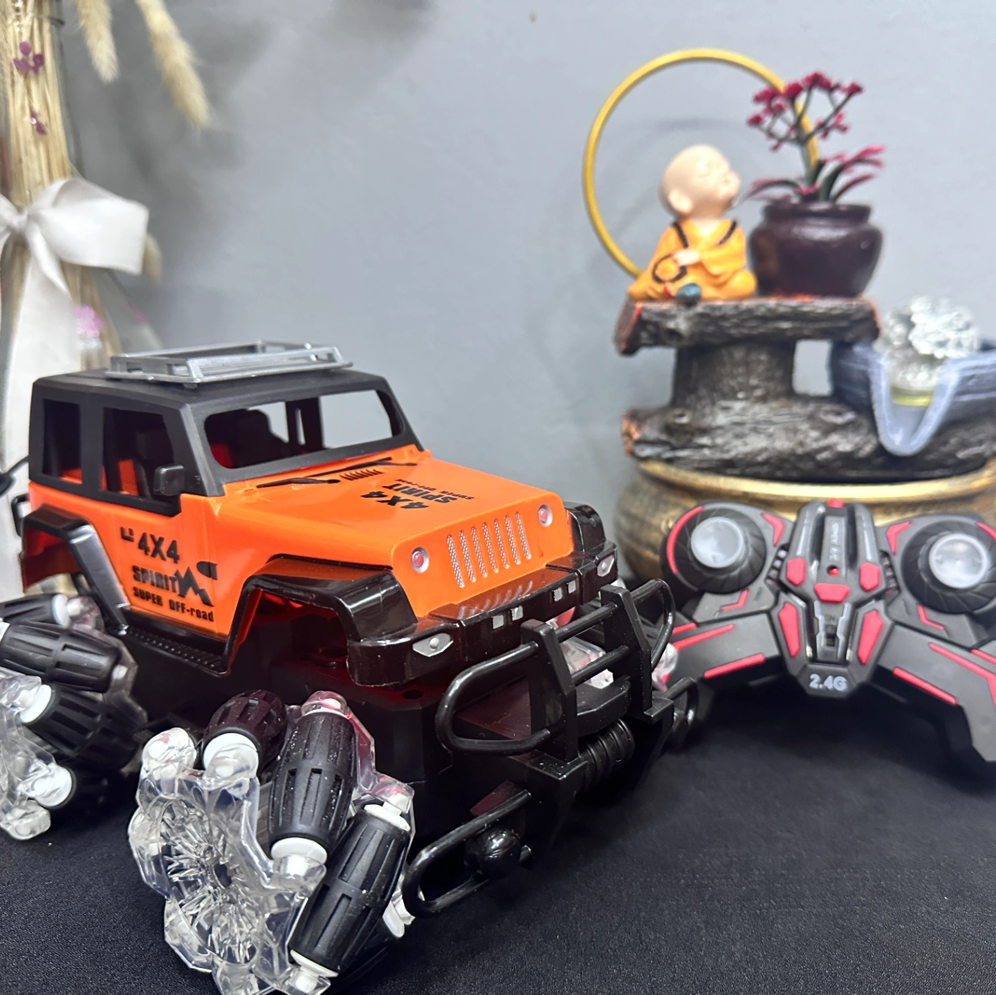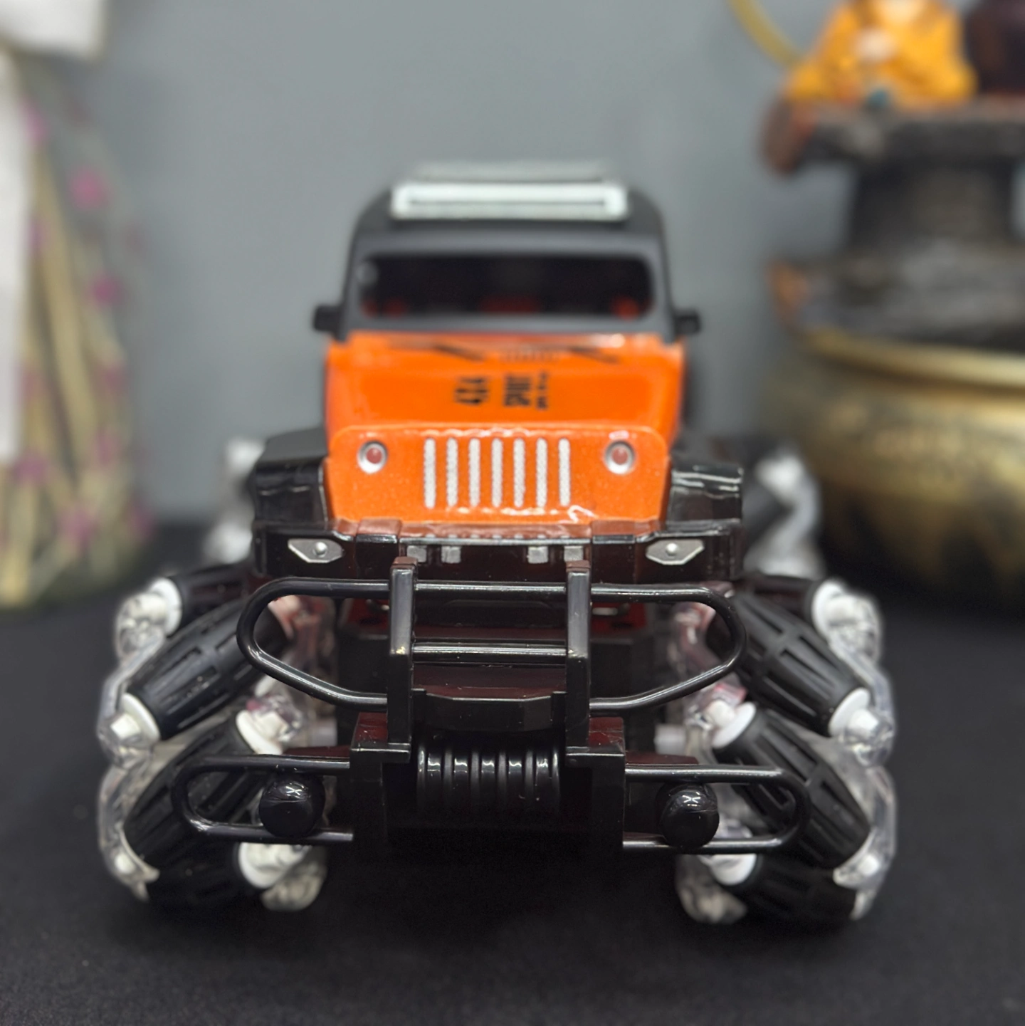Description: An orange-and-black performance RC car featuring advanced Mecanum wheels (rollers set at 45-degree angles). This design allows it to drift sideways and spin in place effortlessly, earning its "Spirit" branding for its high-energy movement.