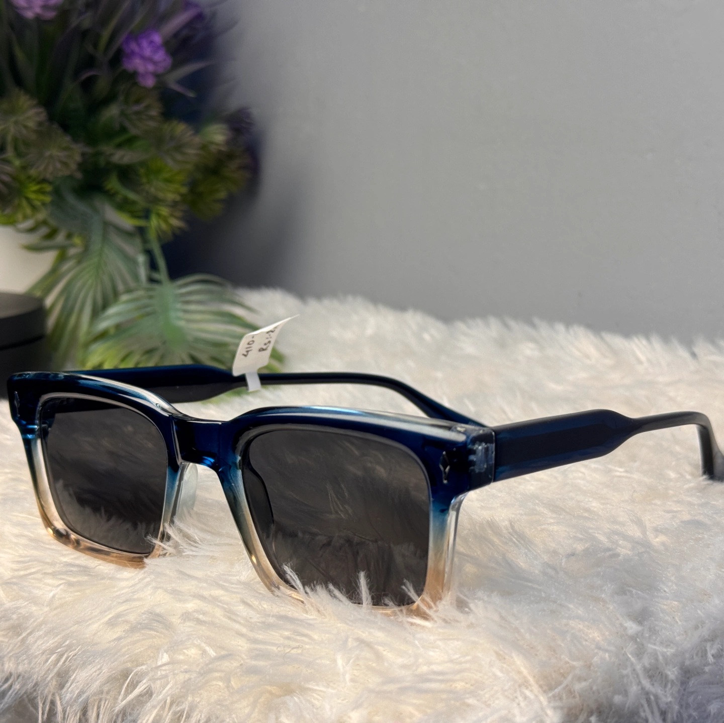 Square-frame sunglasses with a unique blue-to-nude ombre (two-tone) acetate frame and dark gradient lenses.