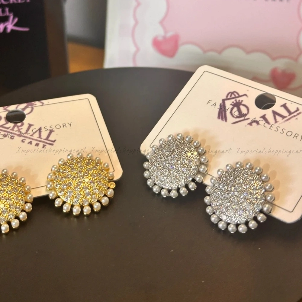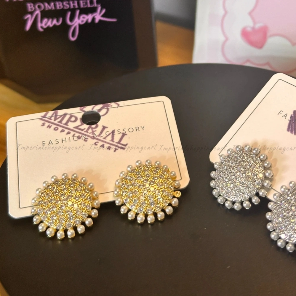 These circular studs are packed with brilliant micro-crystals that catch the light from every angle. The outer edge is delicately fringed with miniature white pearls, creating a sunburst effect that adds a vintage "royal" feel to any outfit.