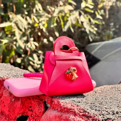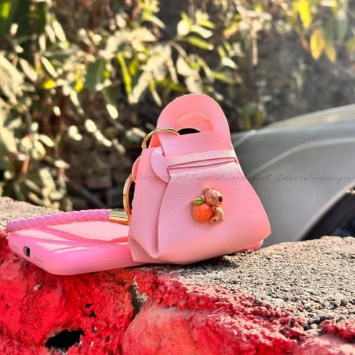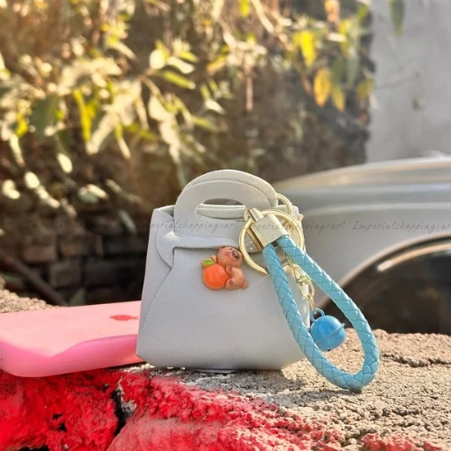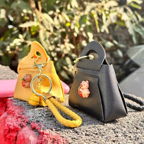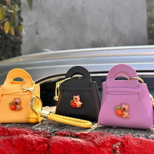 Description: Carry a bit of sweetness wherever you go! These vibrant mini-tote keyrings come in cheerful yellow, classic black, and soft lavender. Each one is adorned with a tiny 3D bear holding a strawberry or orange. Featuring a braided wristlet strap and a matching bell, these are perfect for those who love bright colors and playful details.