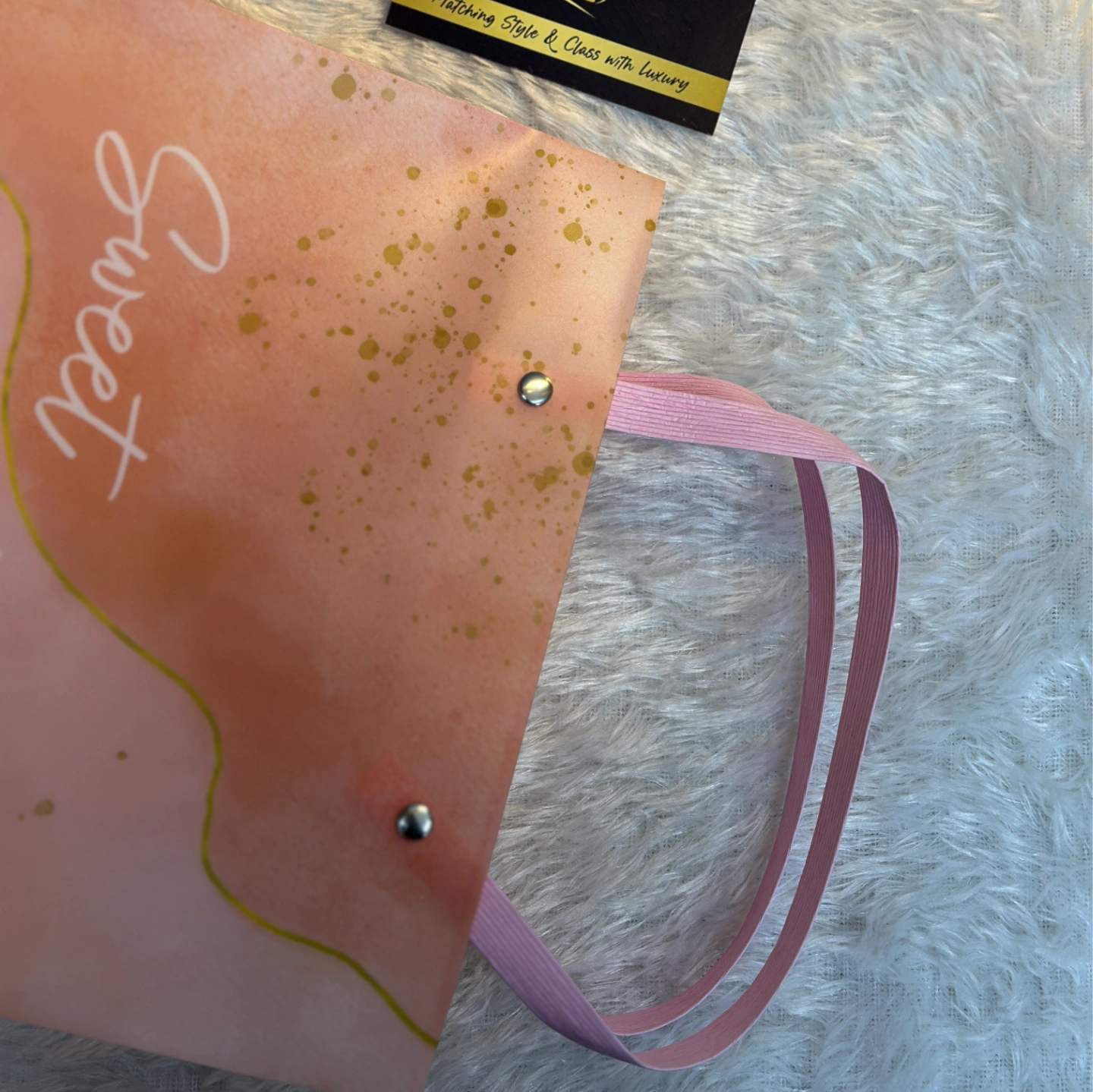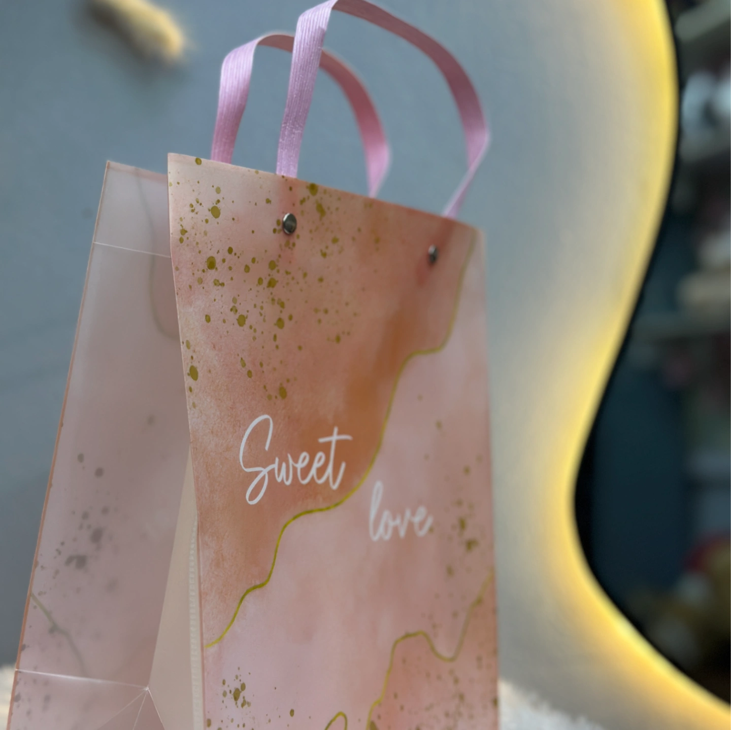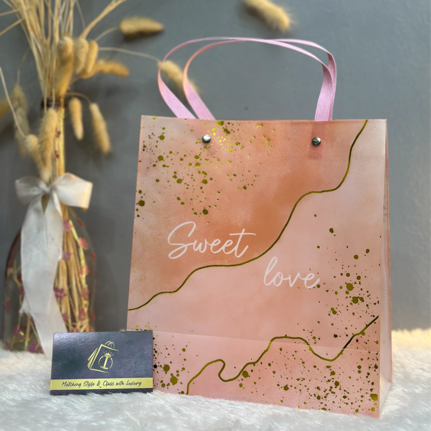 A soft peach and gold watercolor design with "Sweet Love" script. Features elegant pink ribbon handles and gold splatter accents.