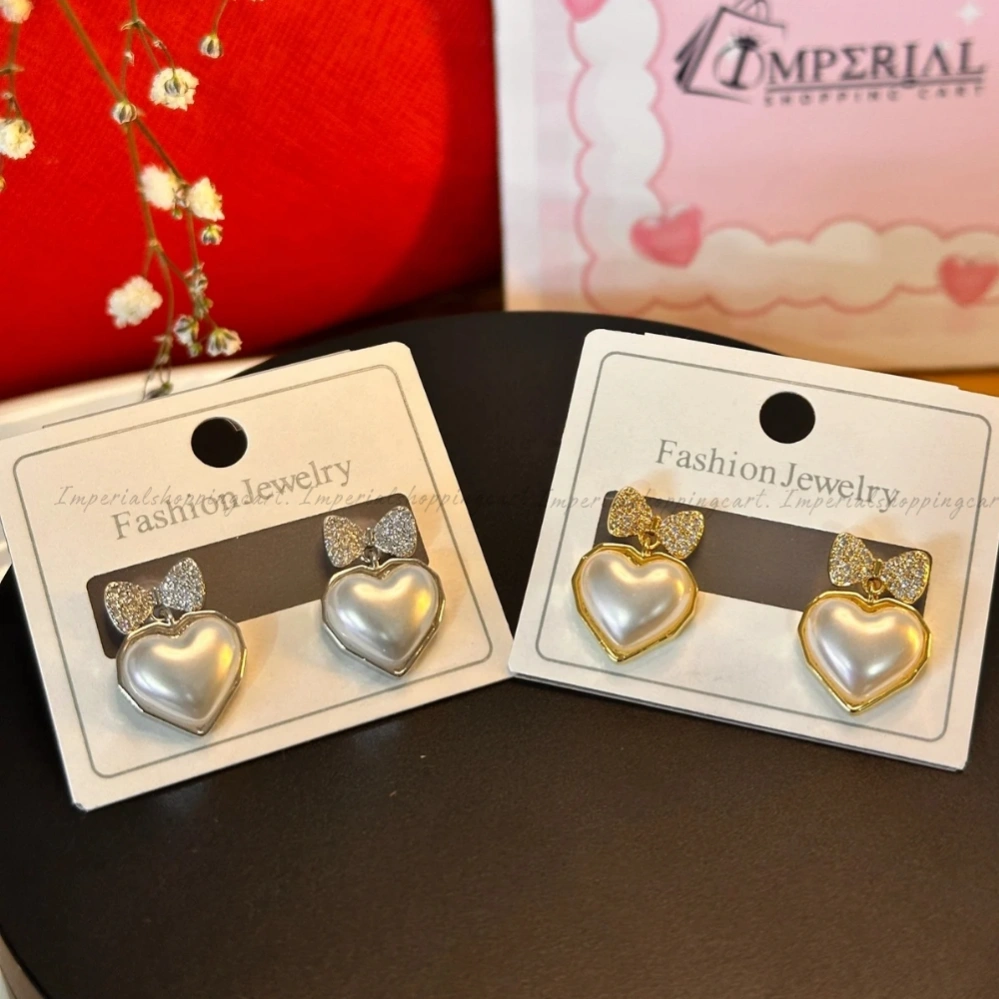 Elegant heart-shaped faux pearls topped with a delicate, shimmering pavé bow. Available in both classic Gold and sleek Silver finishes.