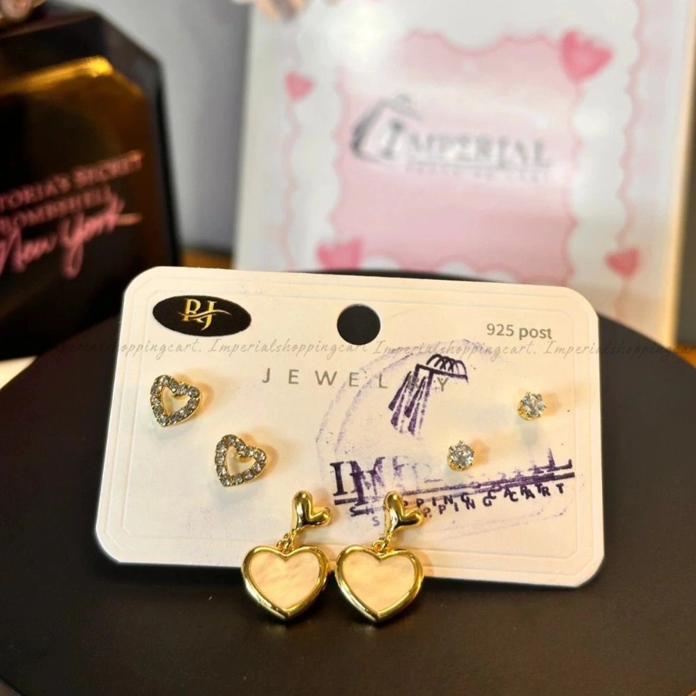 A 3-pair curated set featuring crystal-encrusted heart outlines, classic gold studs, and elegant hanging mother-of-pearl heart charms.