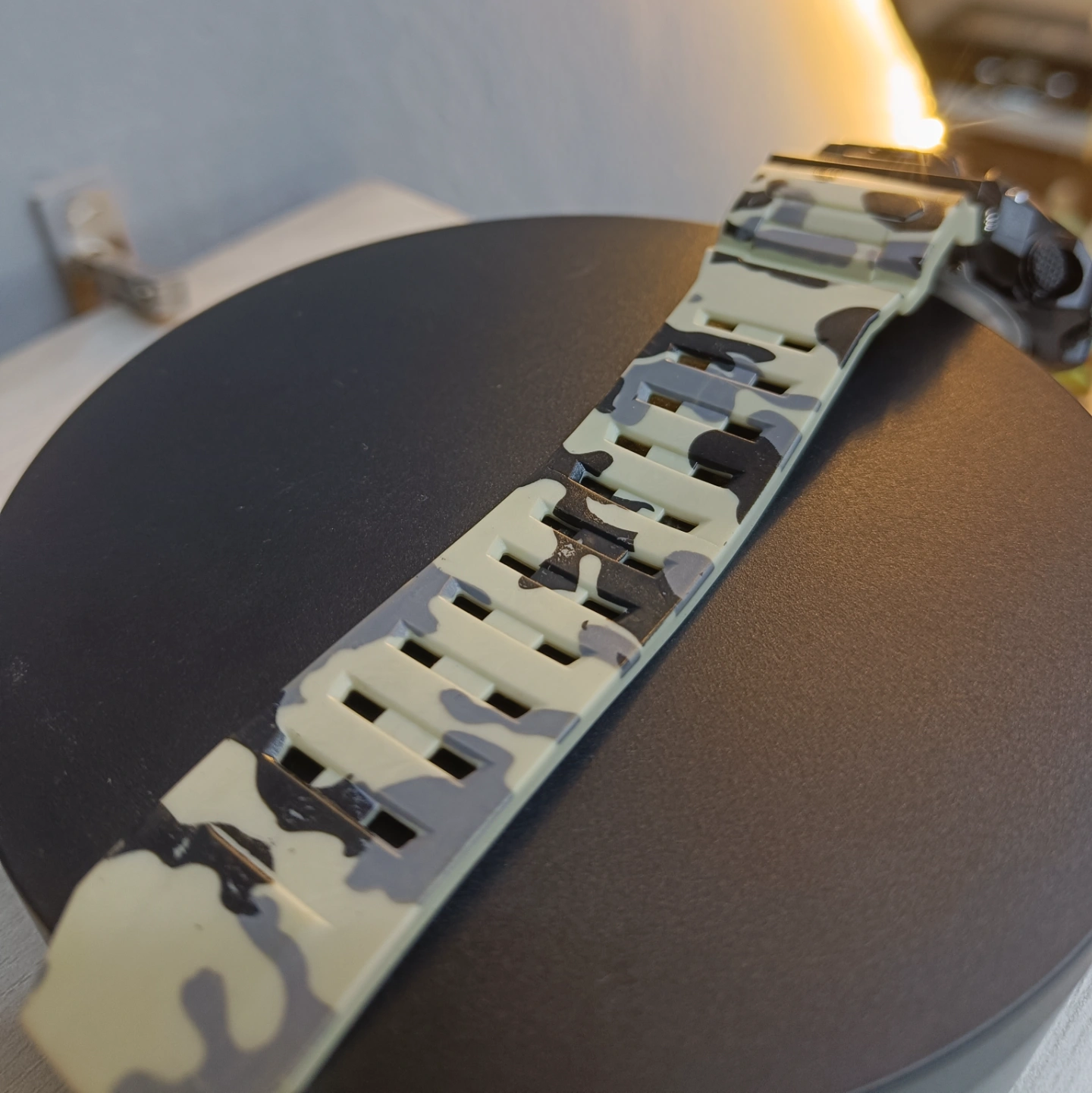 A rugged, shock-resistant digital watch featuring a black case and a distinctive tan/green camouflage resin strap.