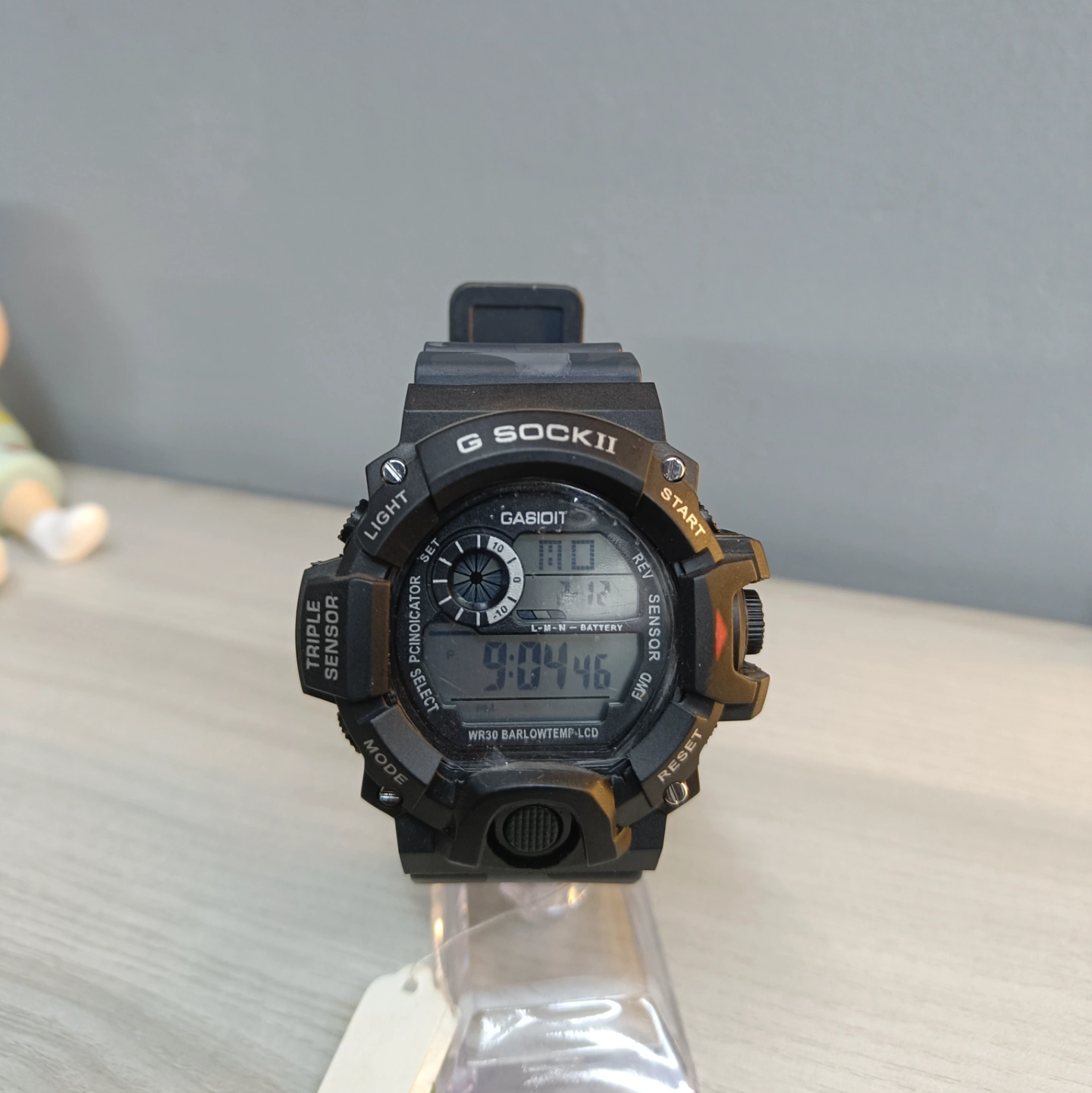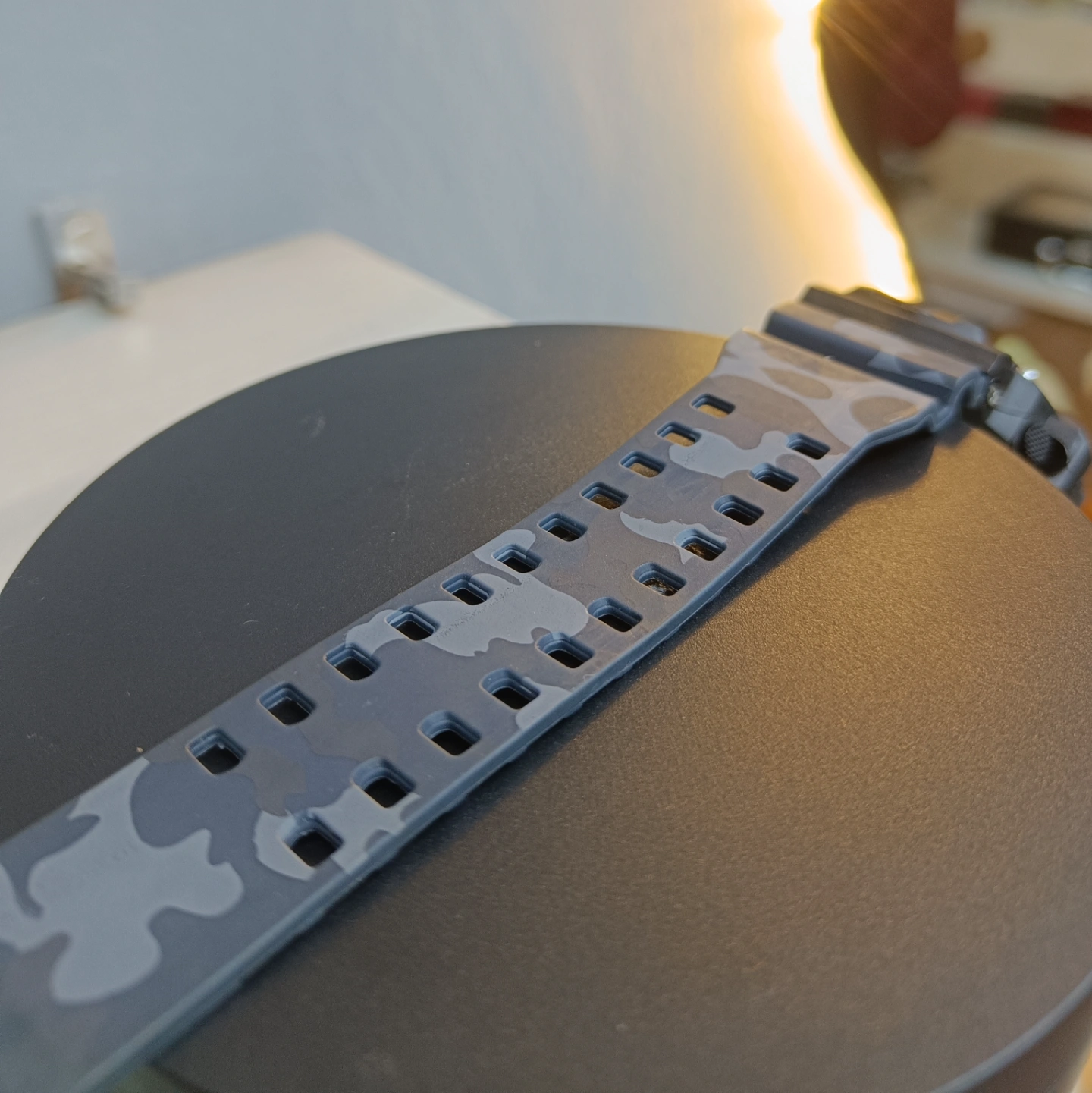 Strap: Comes equipped with a unique and comfortable resin strap featuring a gray camouflage pattern and a breathable, double-holed design for secure and comfortable wear.