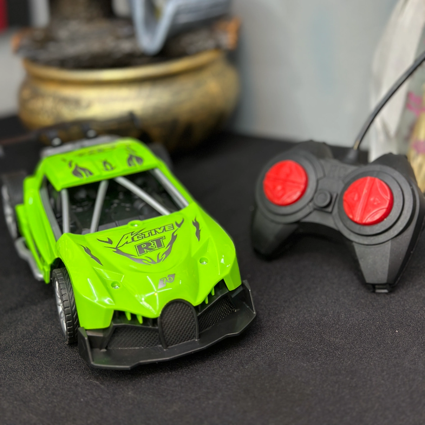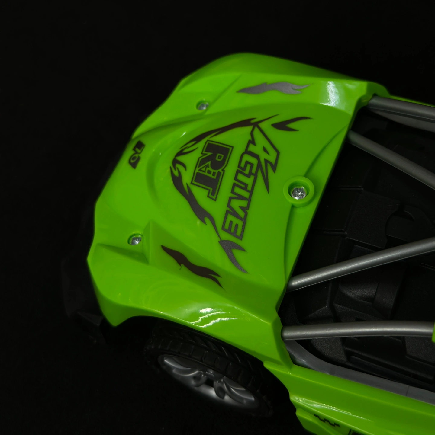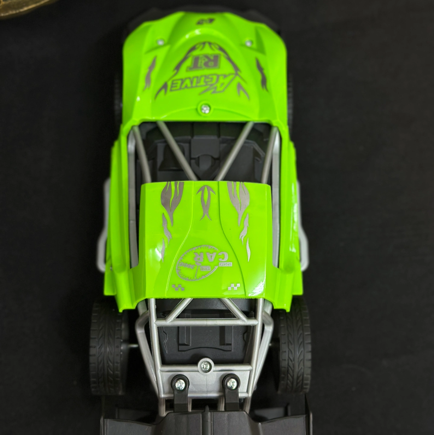 Description: This is a vibrant, neon green racing buggy or "truggy." The bright color and "Active RT" branding make it stand out as a high-energy toy.
