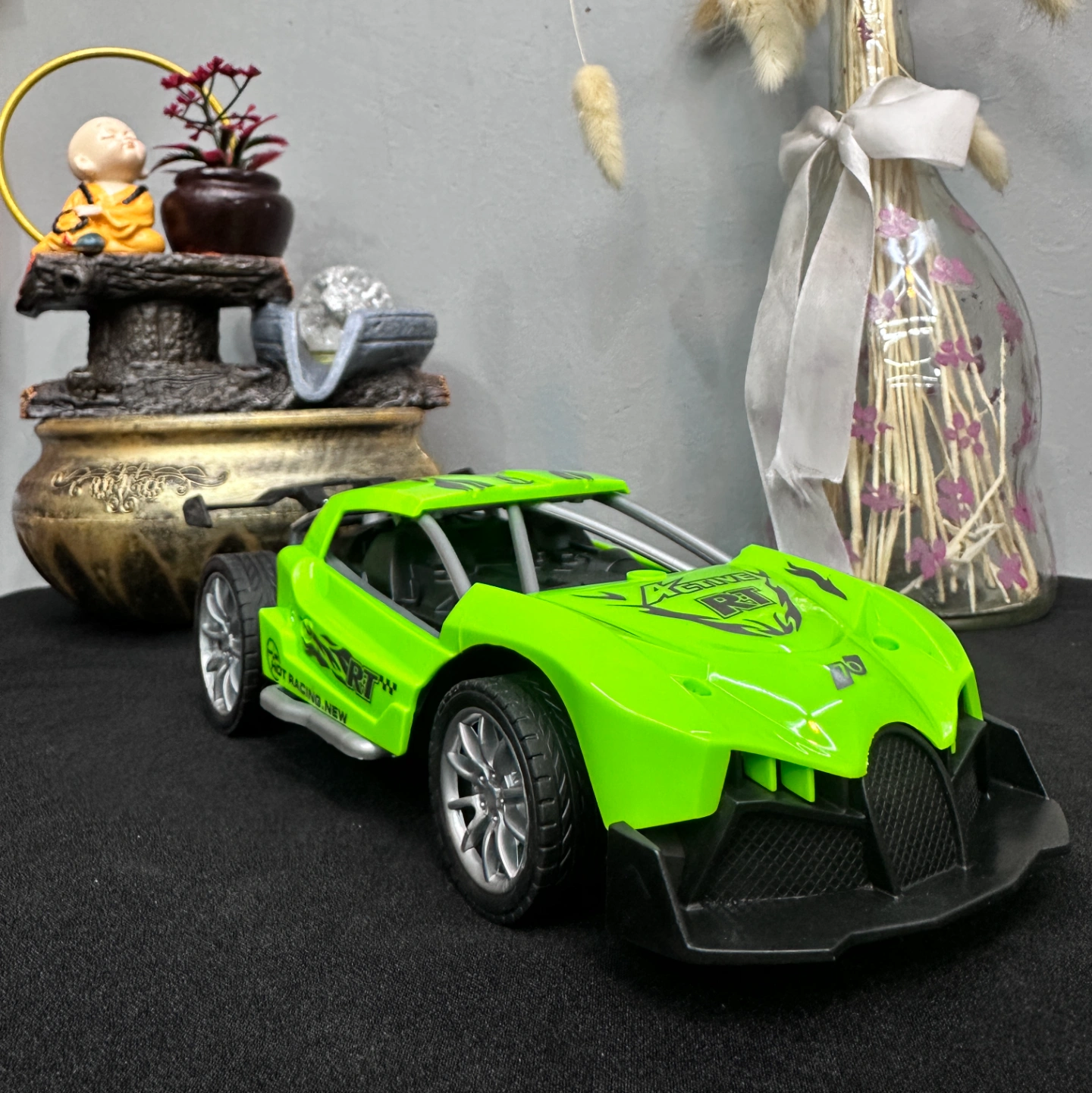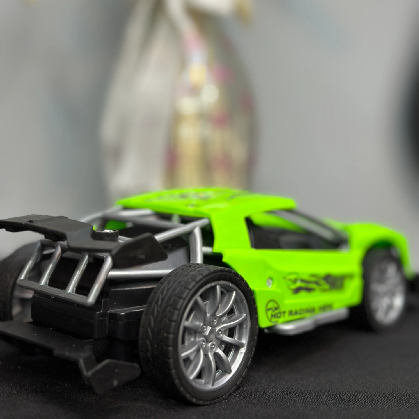 Key Features: The vehicle has an exposed silver roll cage for durability and a streamlined aerodynamic hood. Its bright lime-green shell makes it a great choice for a pop of color in a room's decor, particularly in a child's bedroom or a creative workspace.