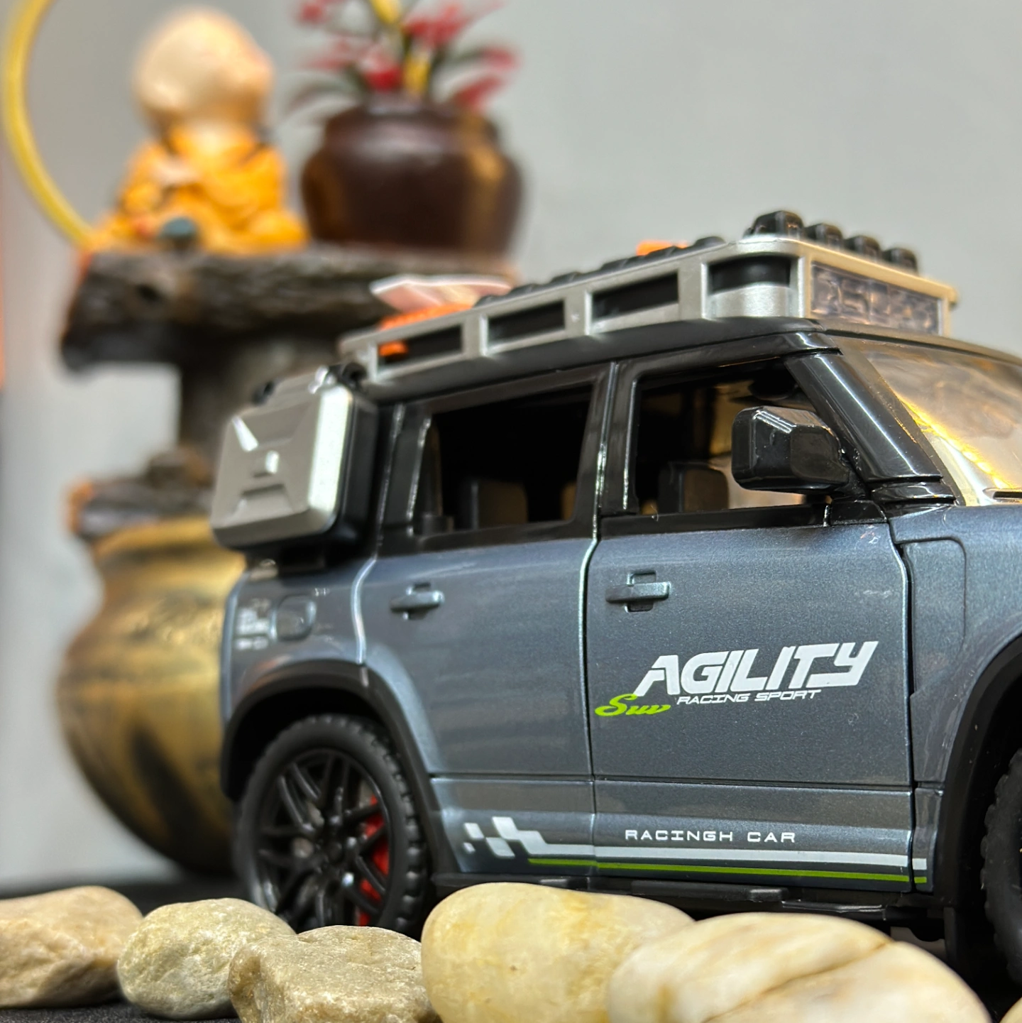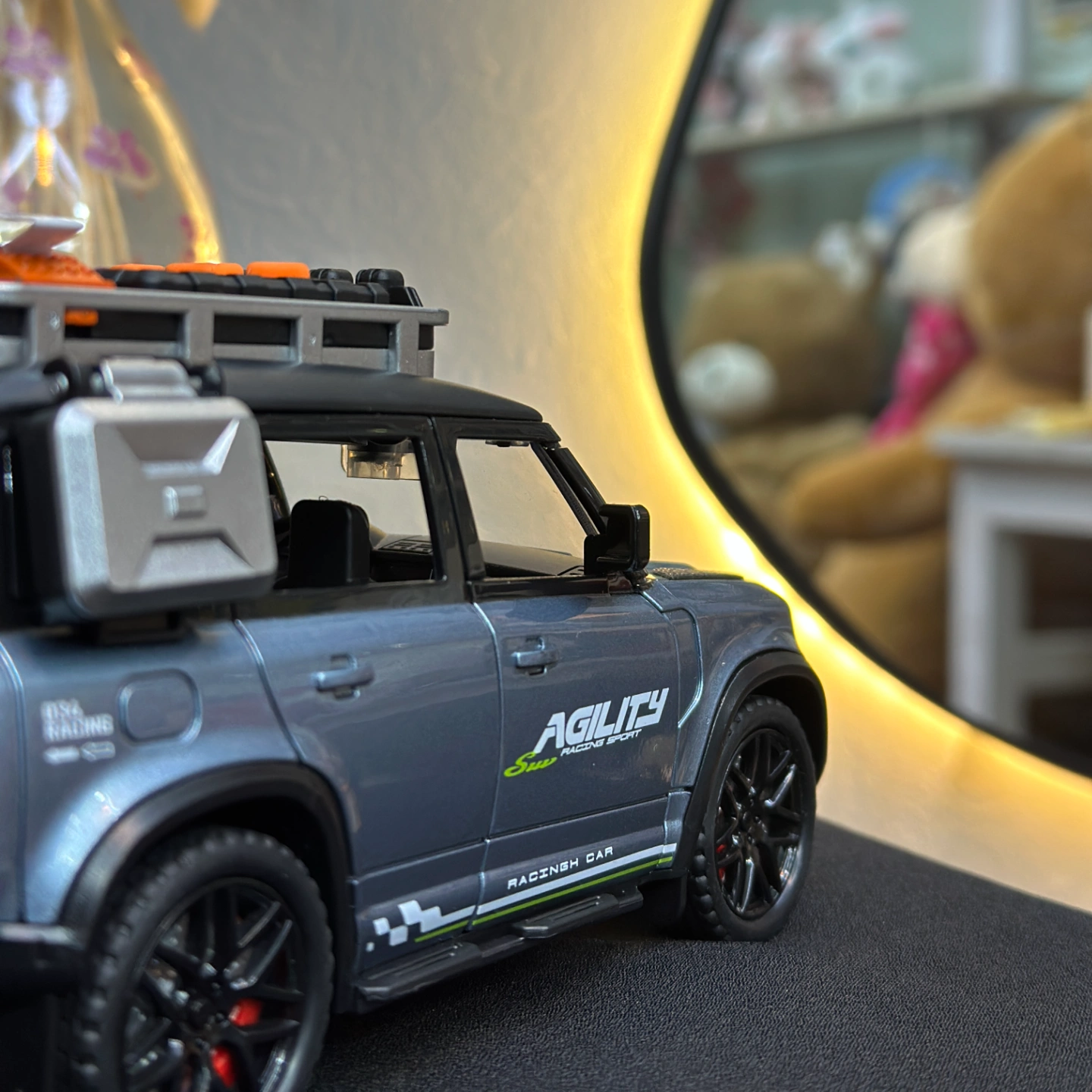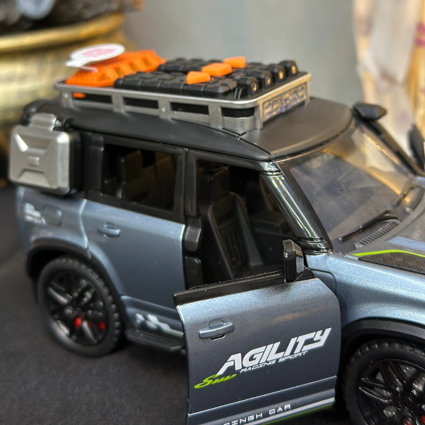 • Description: A sleek, metallic blue/grey SUV modeled after a Land Rover Defender. It is styled as an "overlanding" vehicle, featuring an "Agility Racing Sport" decal on the door.