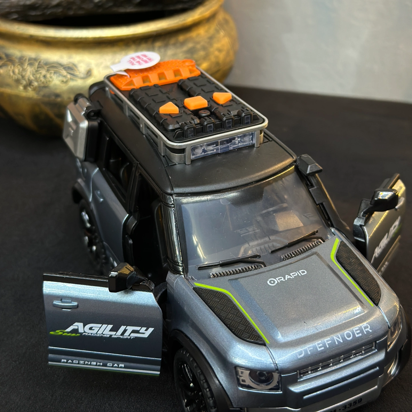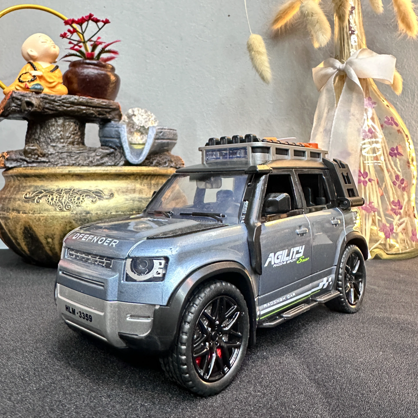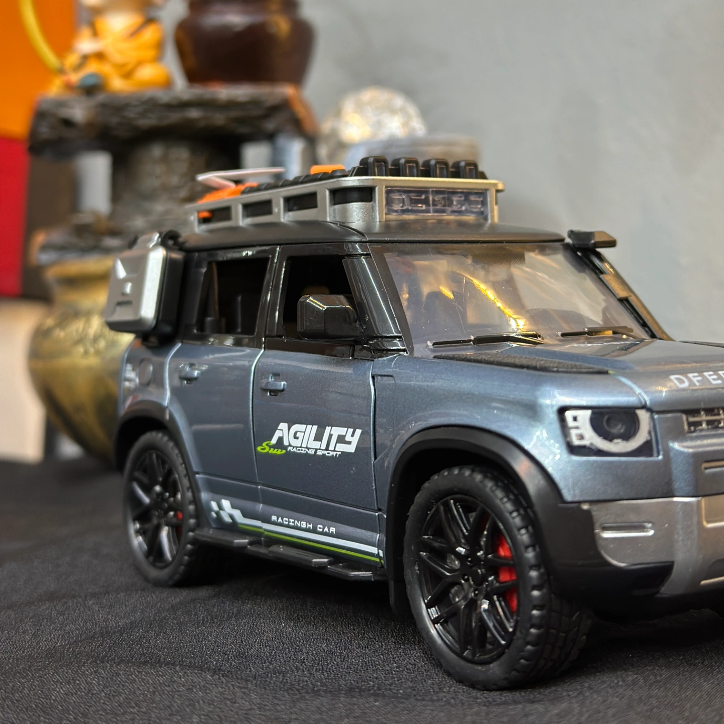 • Description: A sleek, metallic blue/grey SUV modeled after a Land Rover Defender. It is styled as an "overlanding" vehicle, featuring an "Agility Racing Sport" decal on the door.