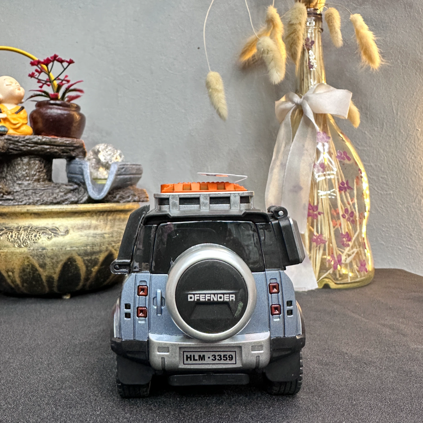 • Key Features: It is highly accessorized for a "safari" look, featuring a silver roof rack, a side-mounted storage gear box, and a rear-mounted spare tire. The low-profile black multi-spoke rims and red brake calipers give it a premium, modern aesthetic.