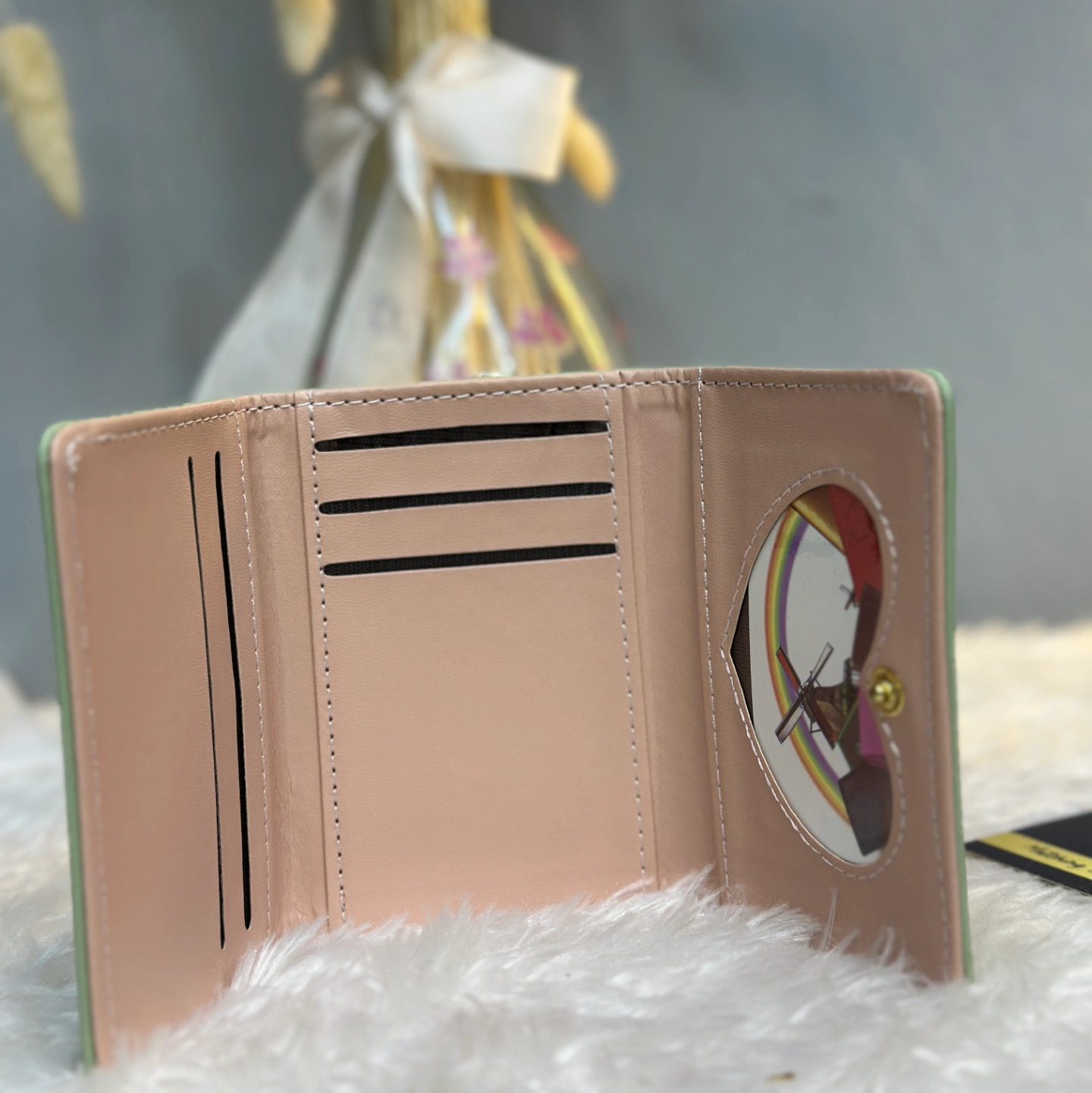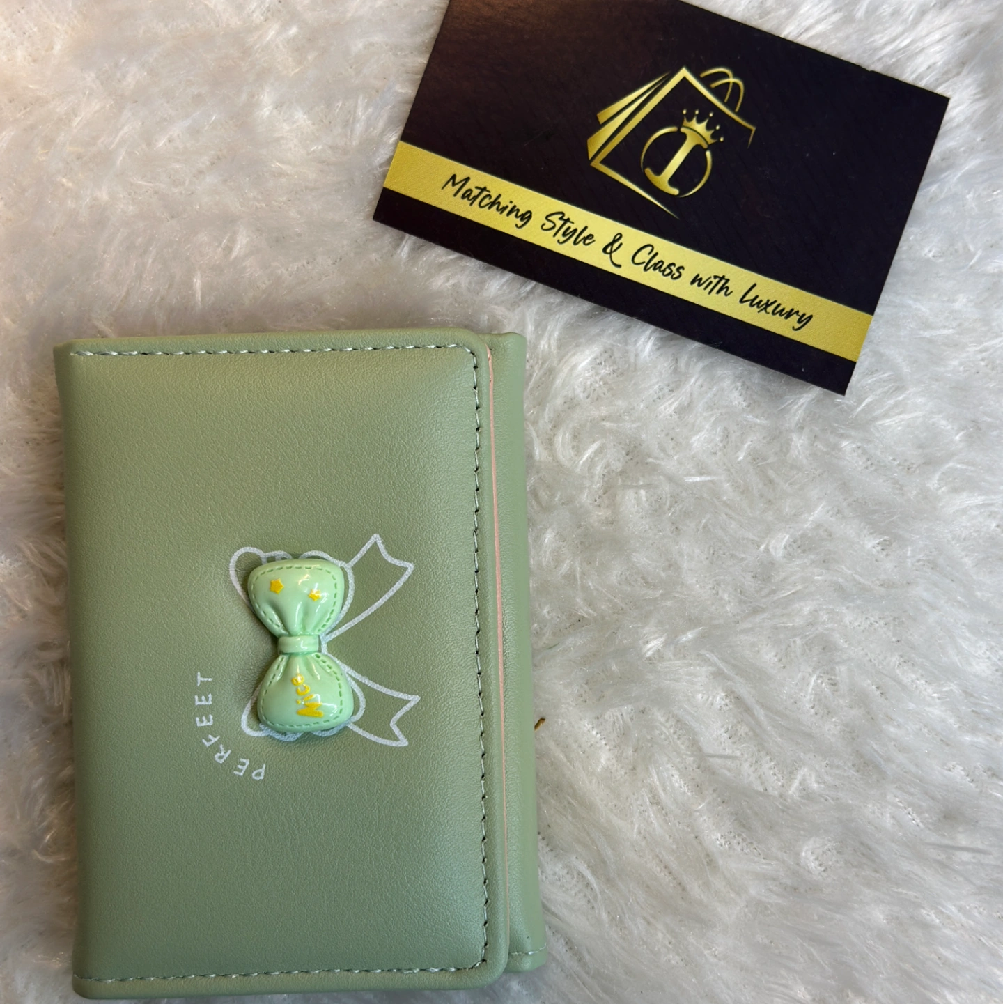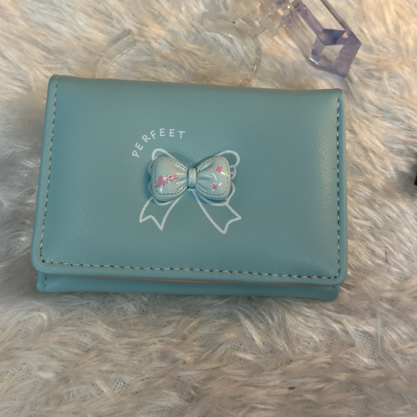 Add a touch of whimsy to your accessory collection with this adorable mint green trifold. Featuring a cute 3D "Nice" bow embellishment and "PERFEET" (Perfect) typography, this wallet is designed for the young and the young-at-heart. Its tiny footprint makes it perfect for mini-bags and backpacks.