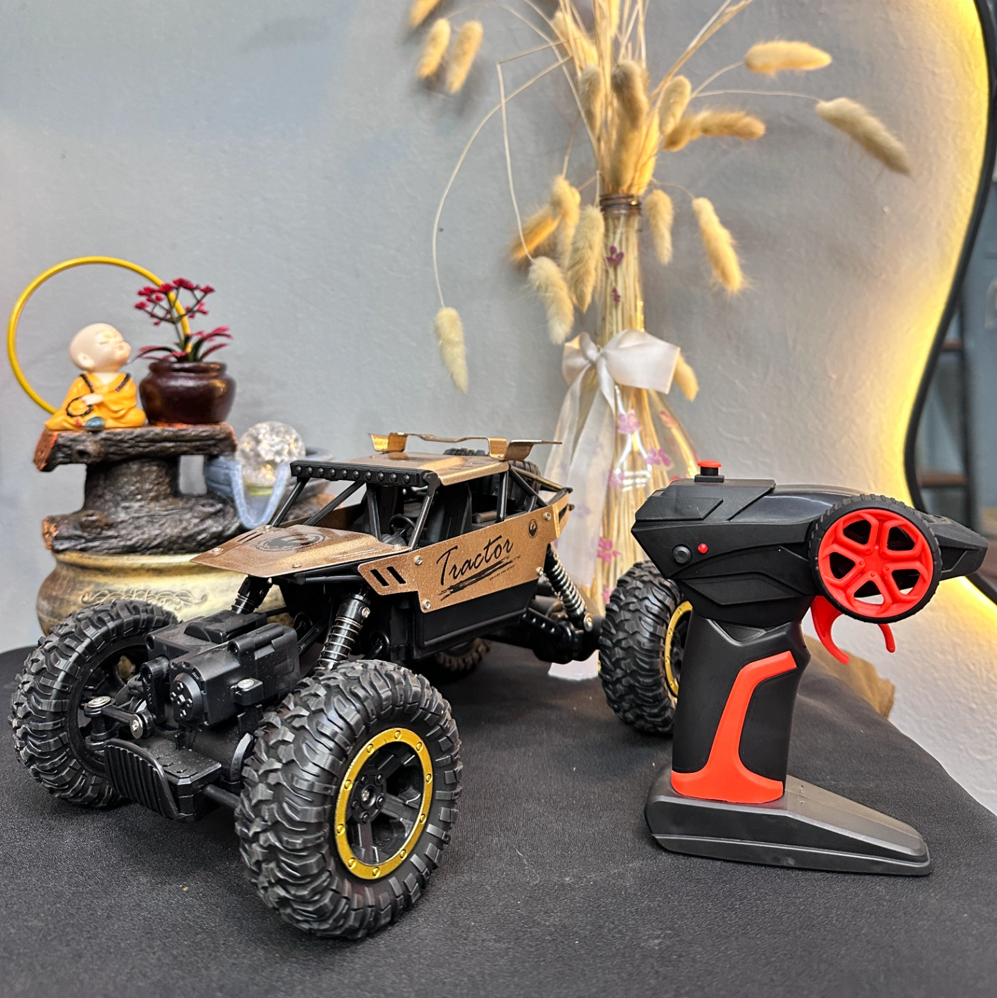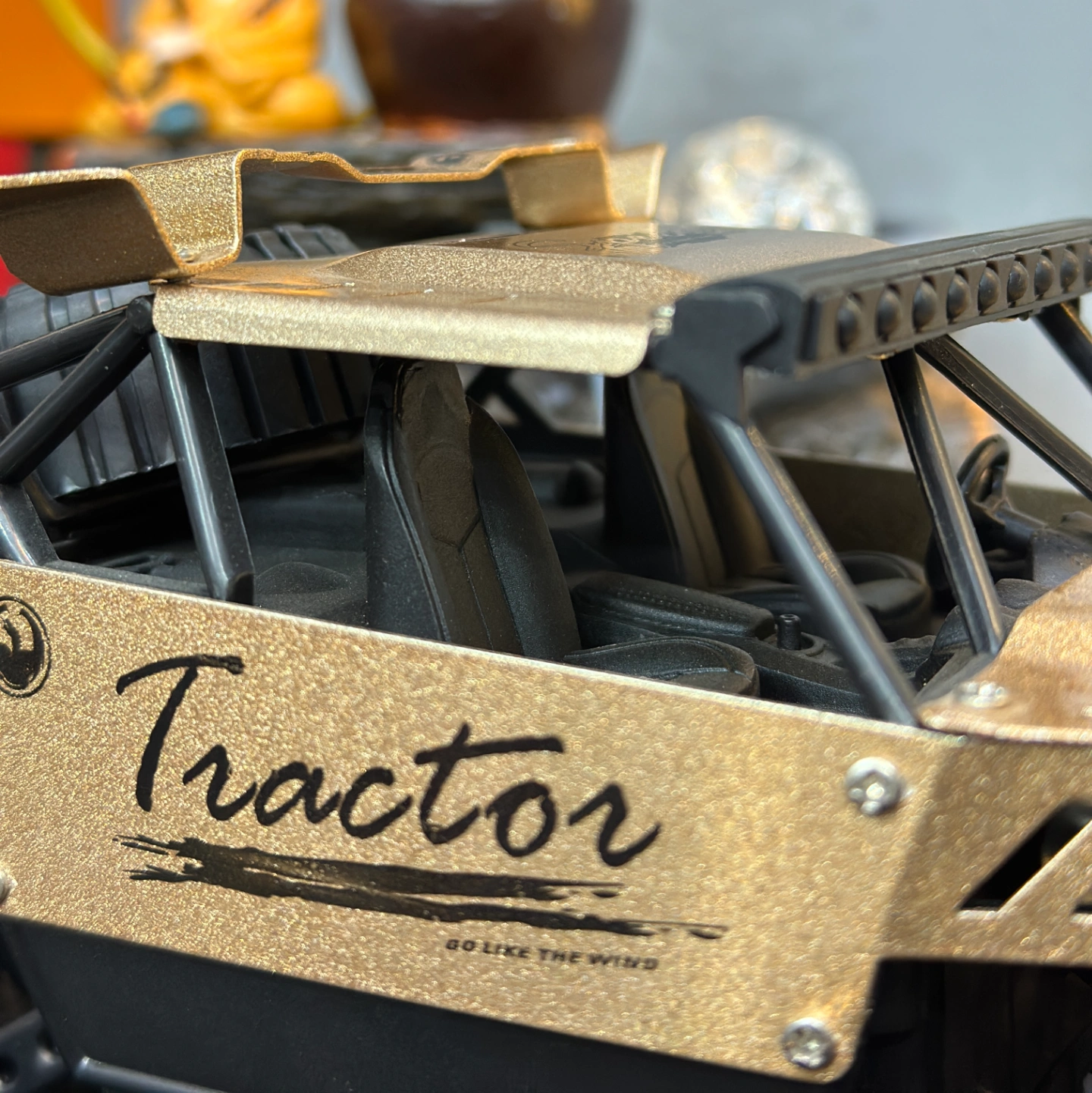 Description: This is a rugged, 1:16 scale rock crawler with an open-chassis design. It features a metallic bronze/gold finish on the body panels with the word "Tractor" printed on the side.