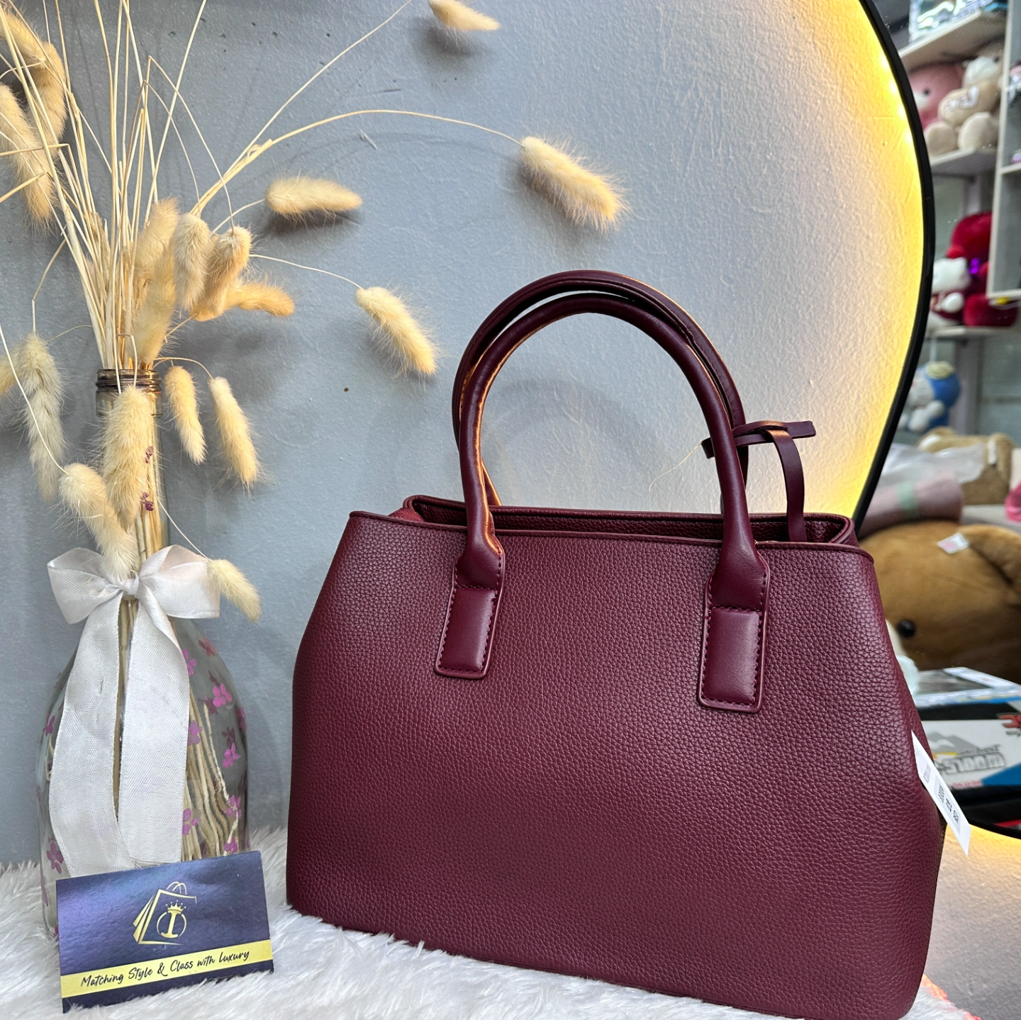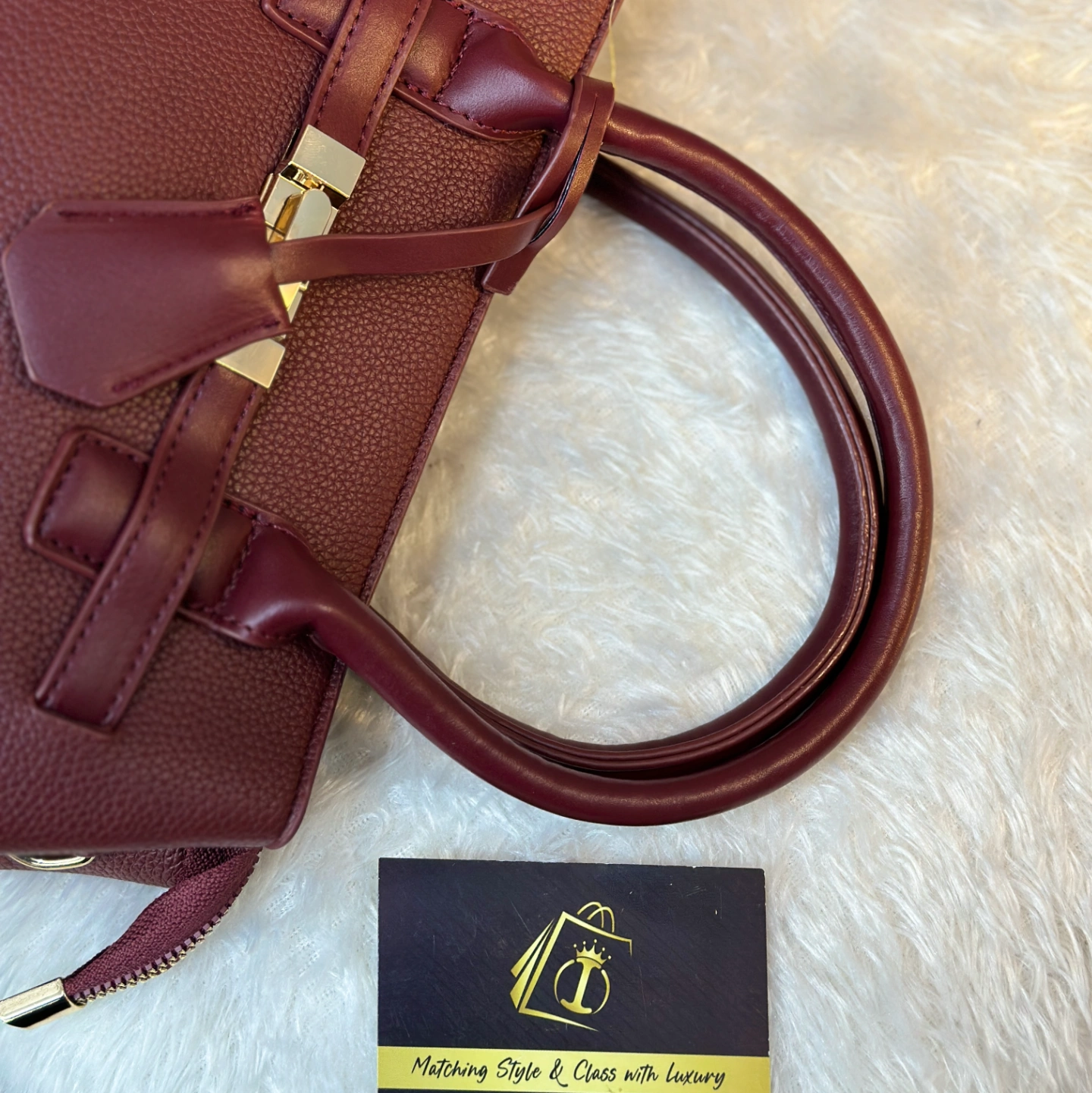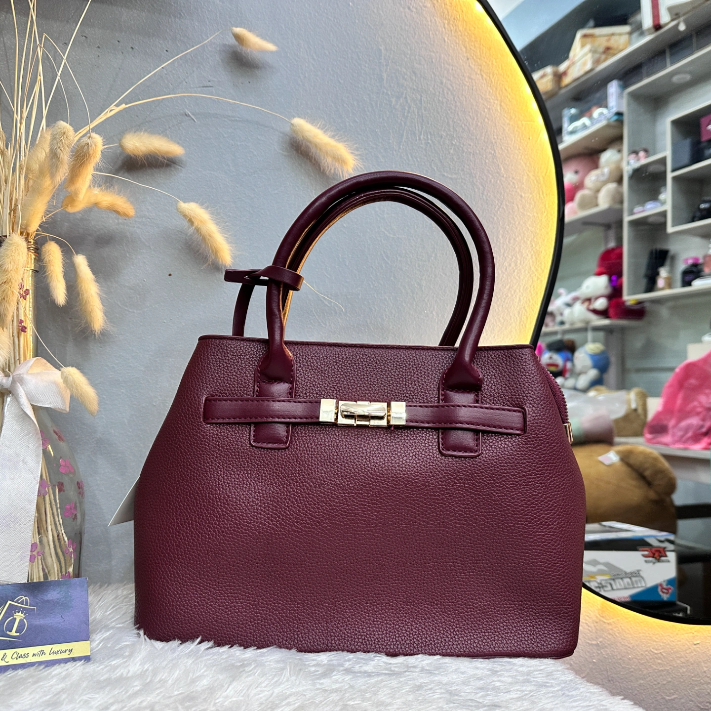 An elegant and structured bag in a rich maroon shade. The sophisticated gold hardware and belted front detail give it a high-end look suitable for the office or formal events.