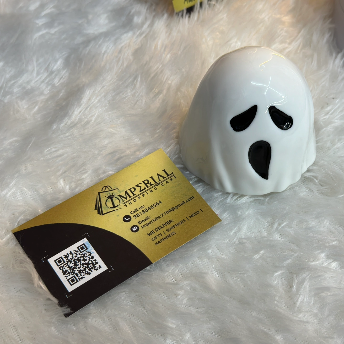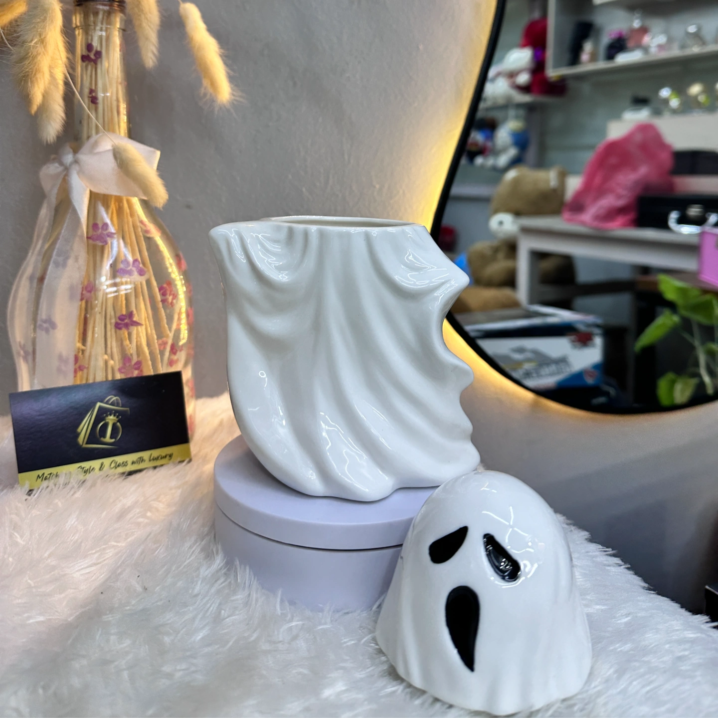 Description: A playful and seasonal ceramic jar with a flowing "fabric" texture. The matching ghost lid adds a touch of whimsical Halloween charm to any desk or kitchen.