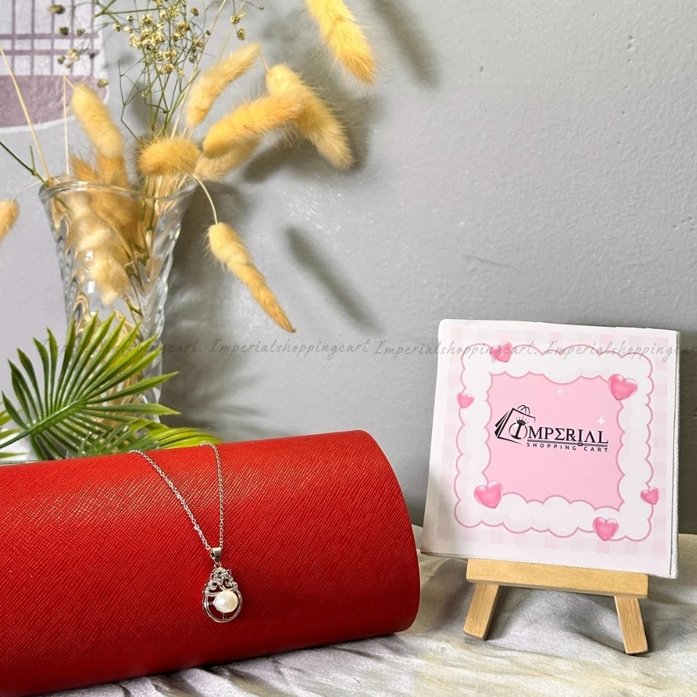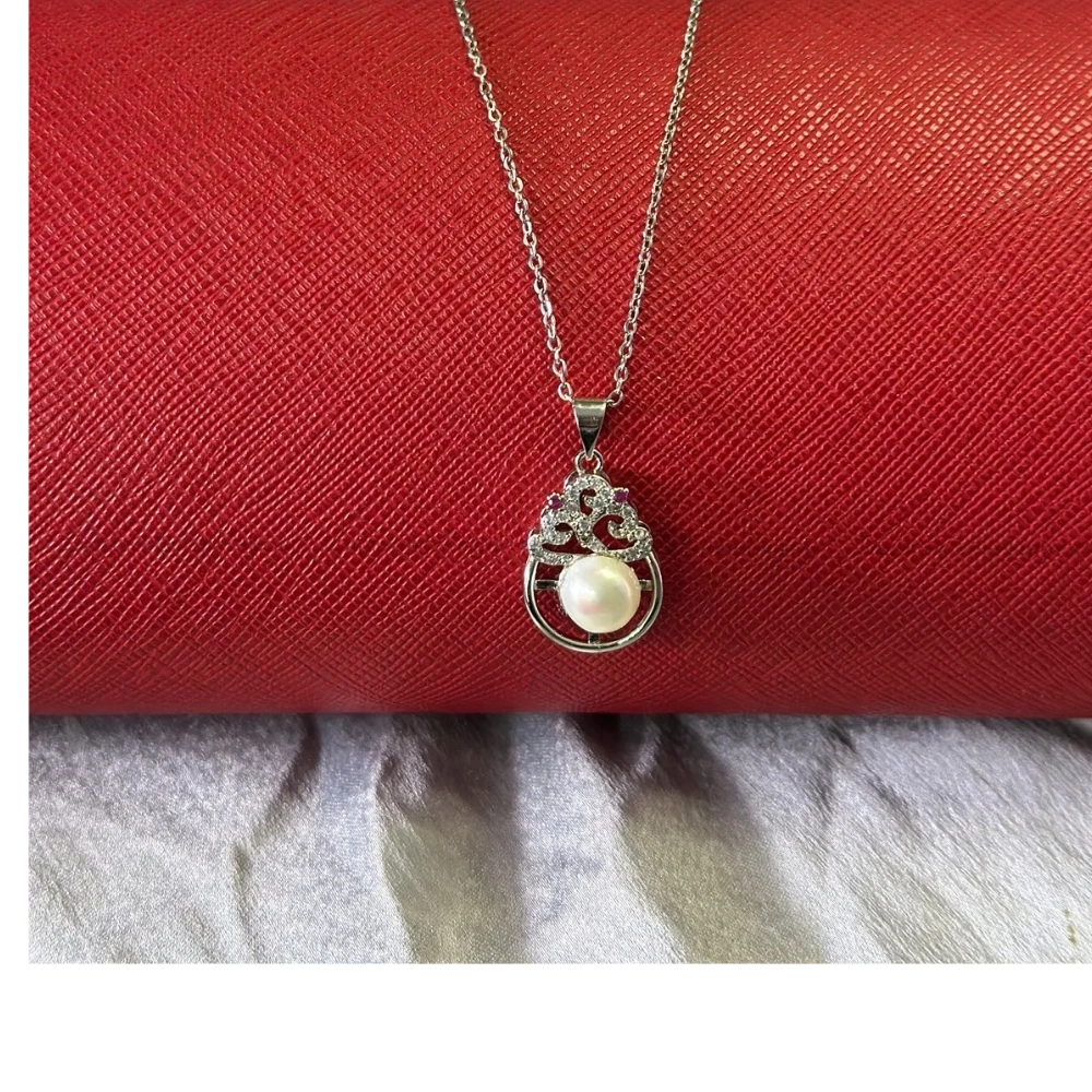 Large round pearl in an ornate, crown-like filigree frame with pink accents.