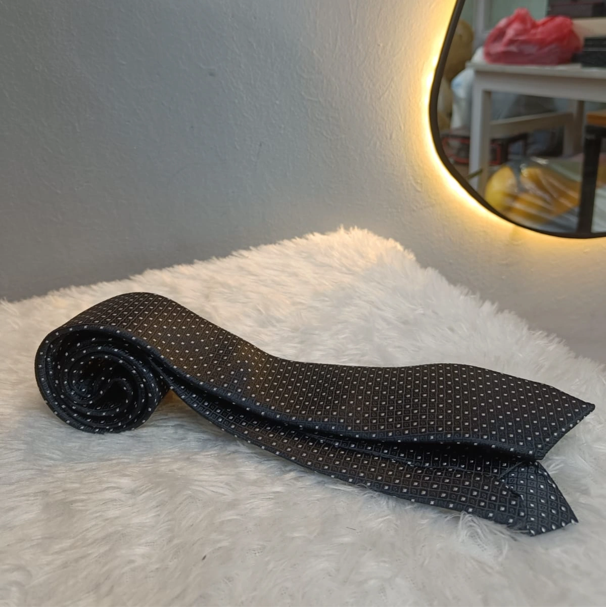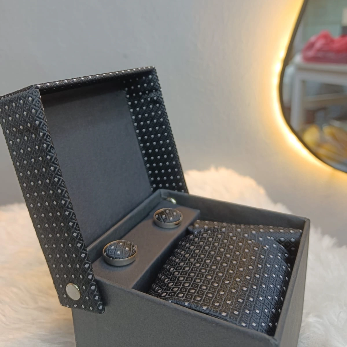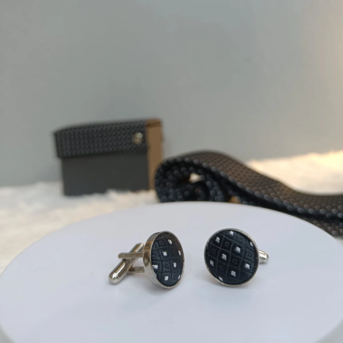 A sophisticated deep charcoal tie set featuring a classic micro-dot pattern. The subtle white accents provide a textured, shimmering effect against the dark fabric. This versatile set includes a matching pocket square and cufflinks, making it an essential choice for both formal business meetings and evening galas.