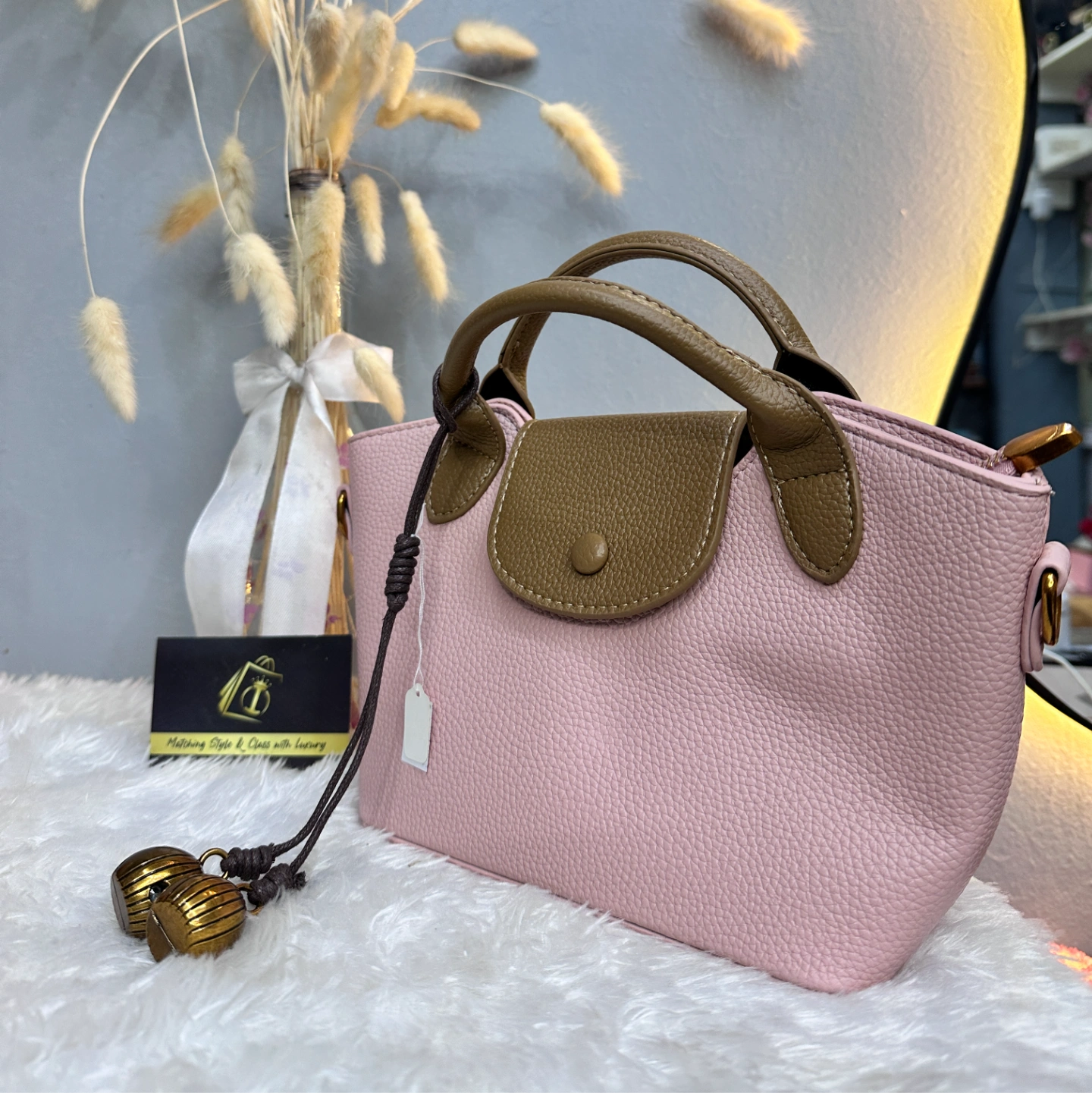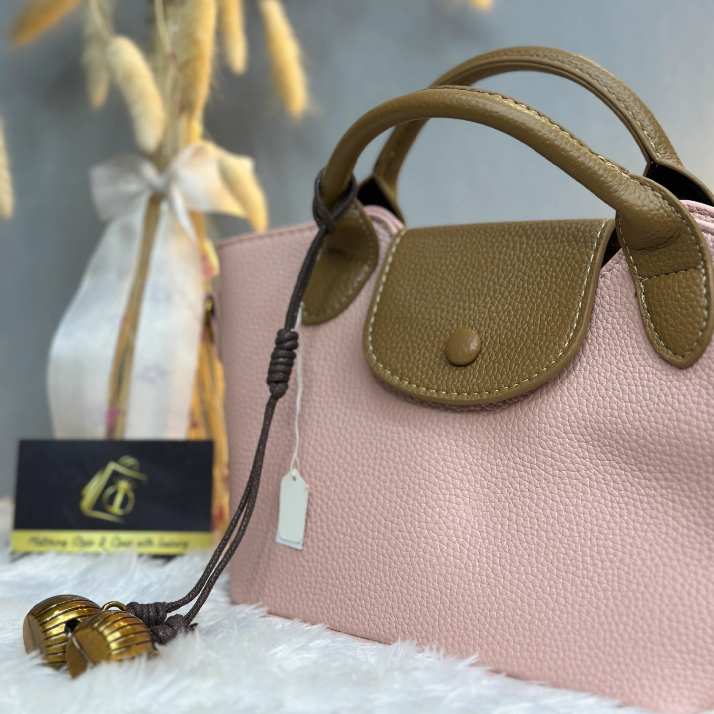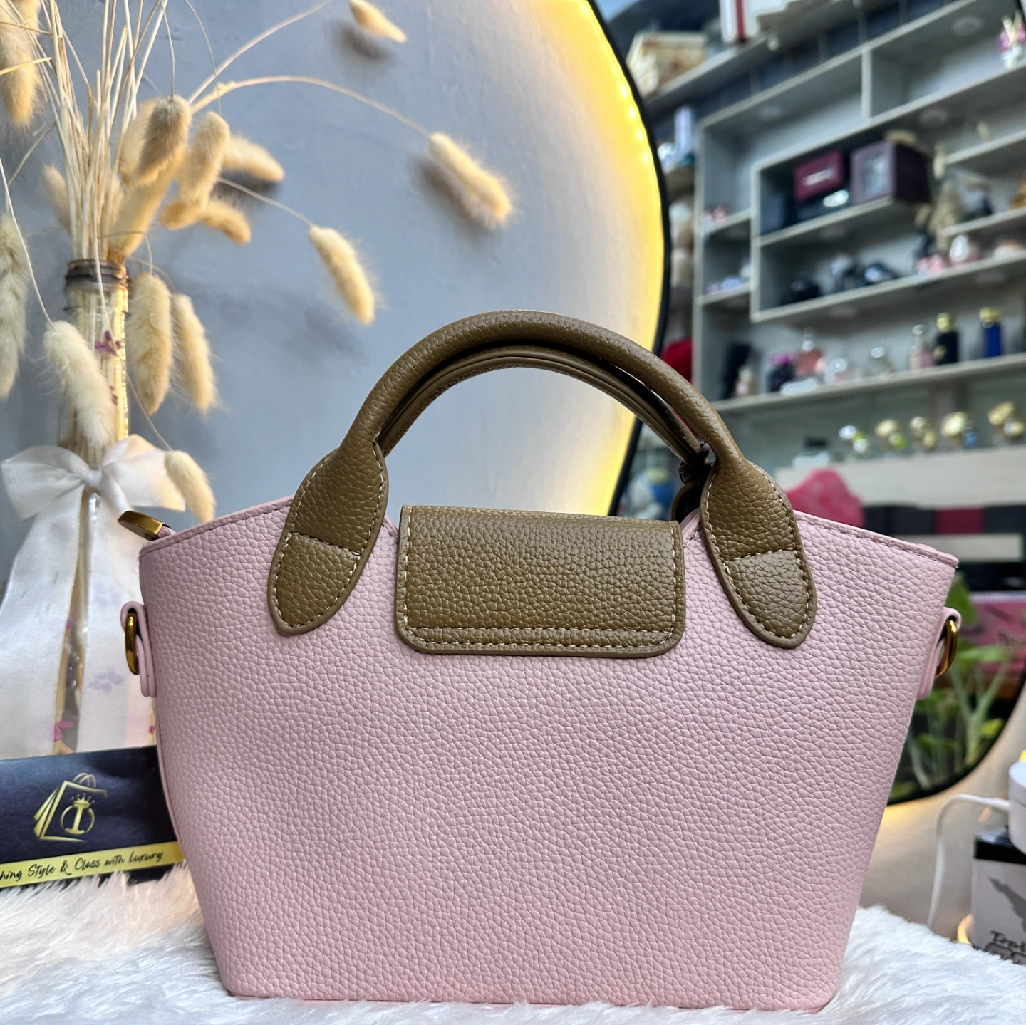 A chic, dual-tone handbag inspired by classic fold-over designs. It features a pebbled pink texture contrasted with smooth olive trim, making it a perfect playful accessory for casual outings.