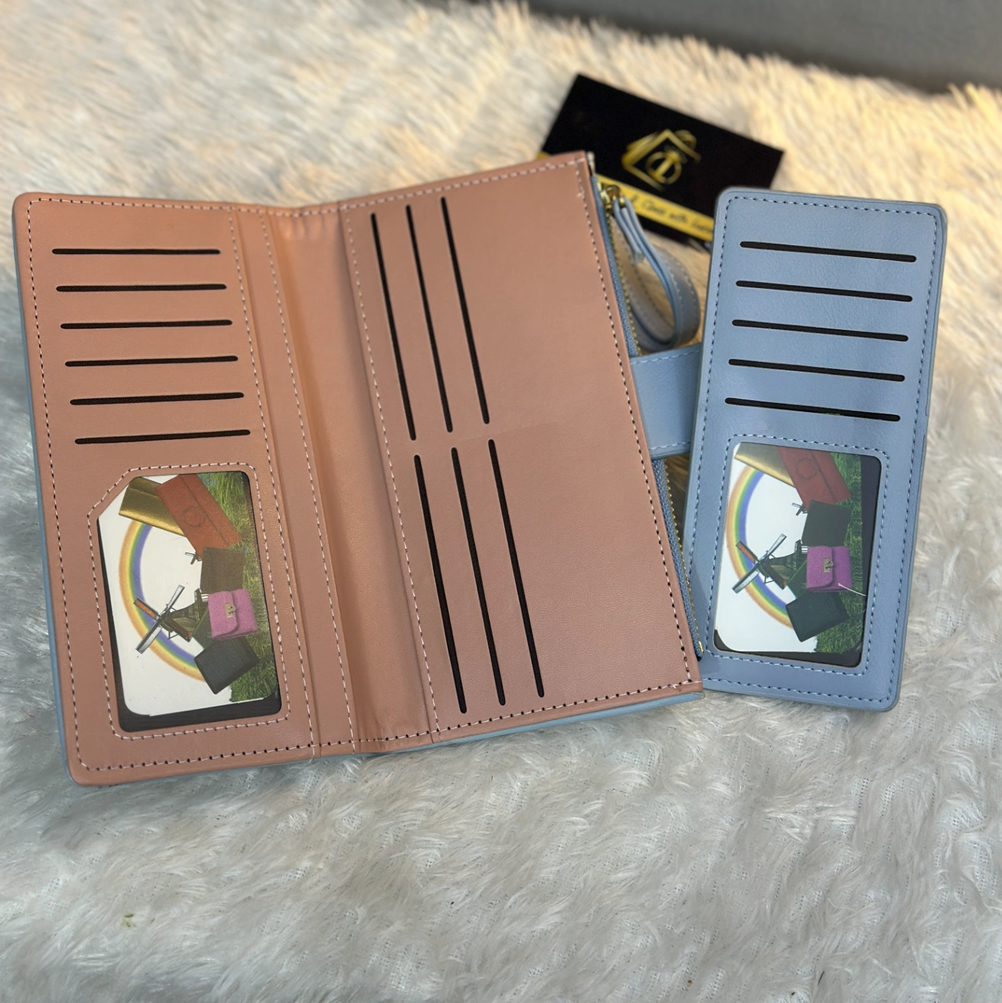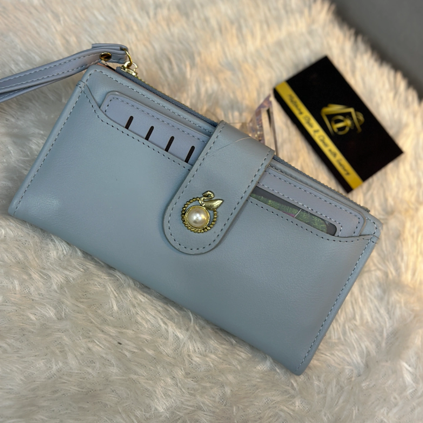 Exude elegance with this sophisticated long-form wristlet in a muted powder-blue shade. The focal point is a beautiful gold-tone swan emblem inset with a lustrous faux pearl, securing the snap-button tab. It features an easy-access front slot for your most-used card or ID.