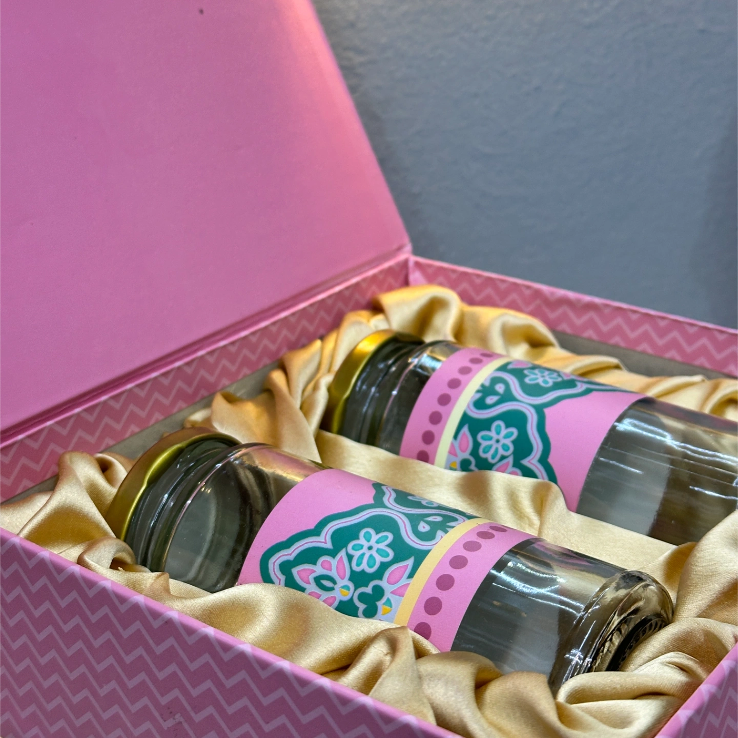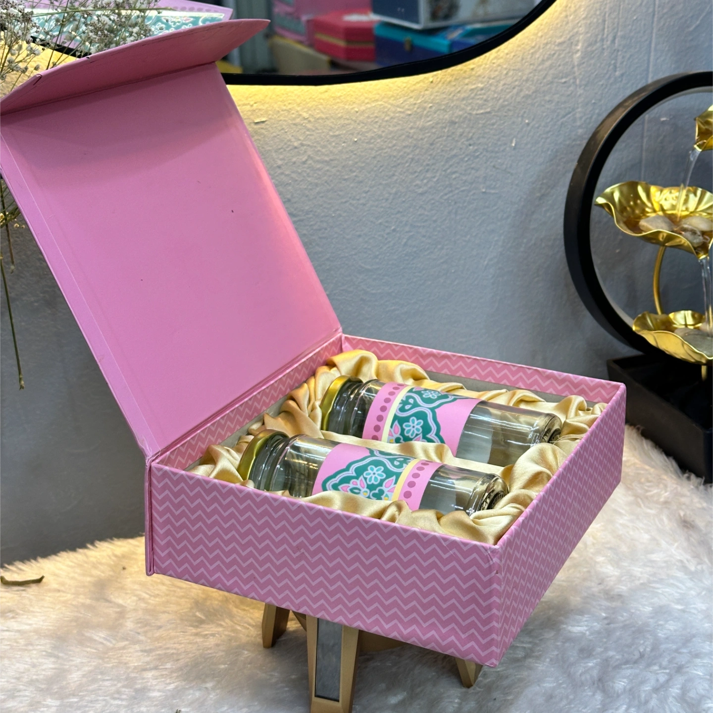 A small, vibrant pink box with a modern chevron/zigzag texture holding two horizontal jars.
