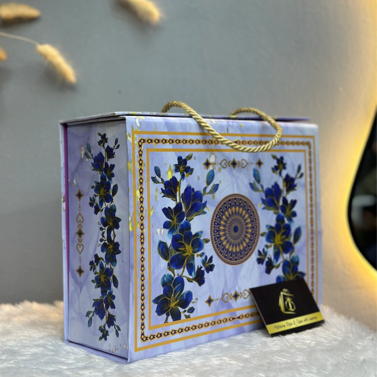 A premium, rectangular rigid gift box featuring a serene lavender-marble backdrop. It is adorned with deep blue botanical illustrations and a central gold-foiled mandala. The gold braided rope handles add a touch of regal elegance.