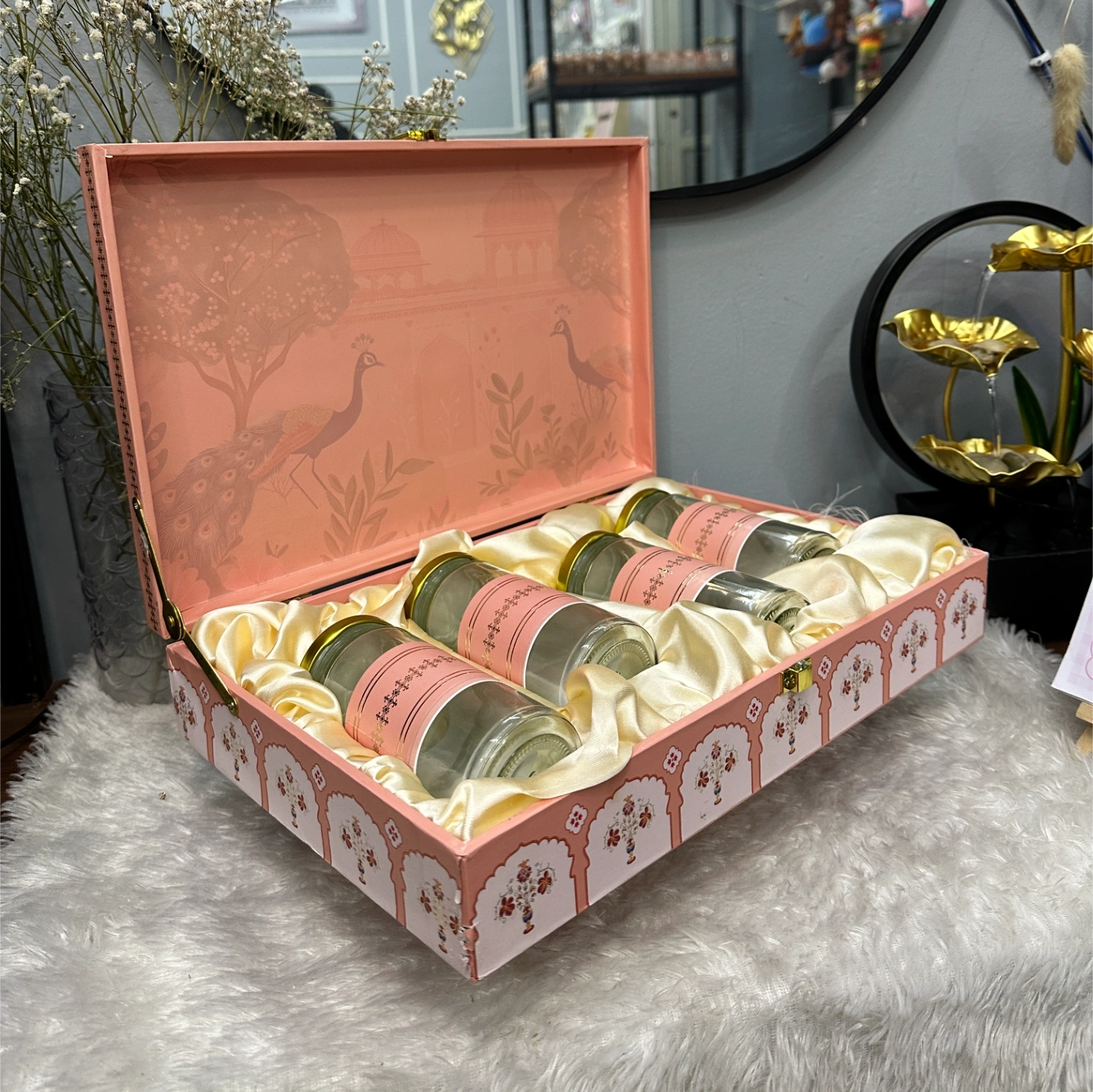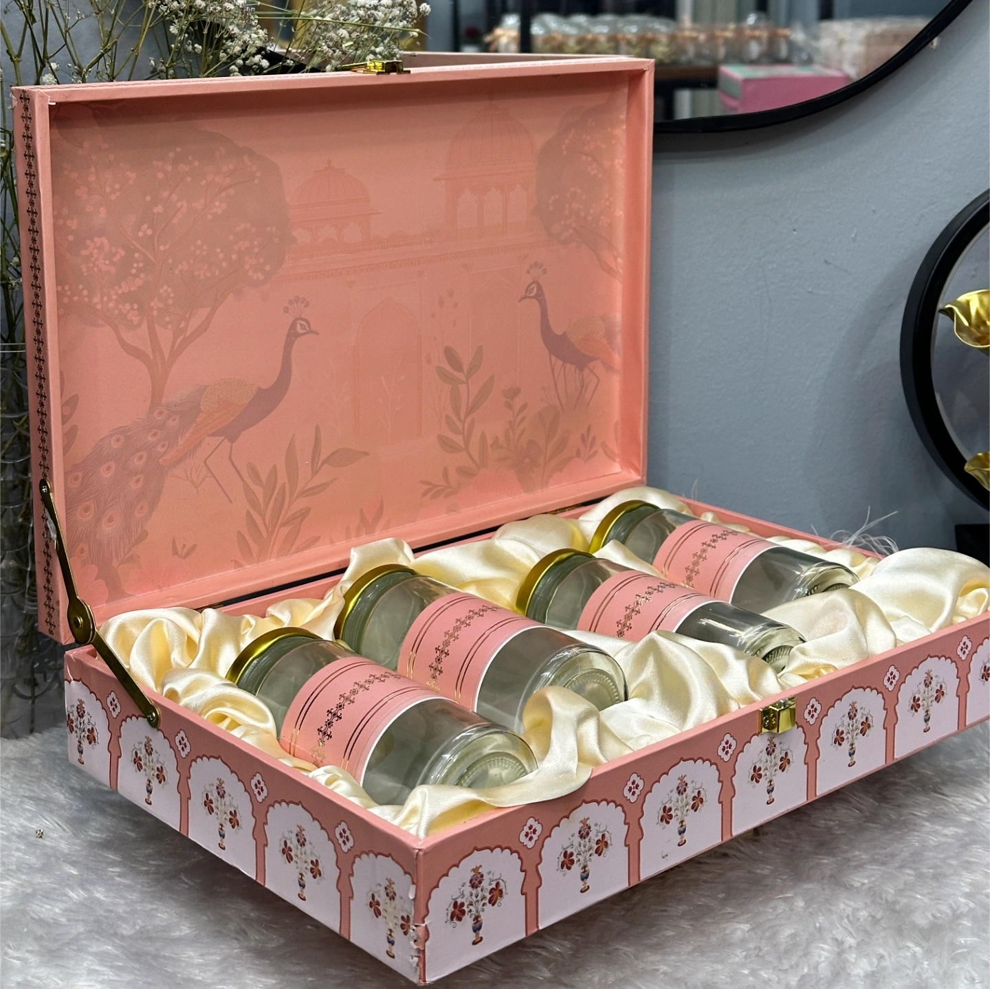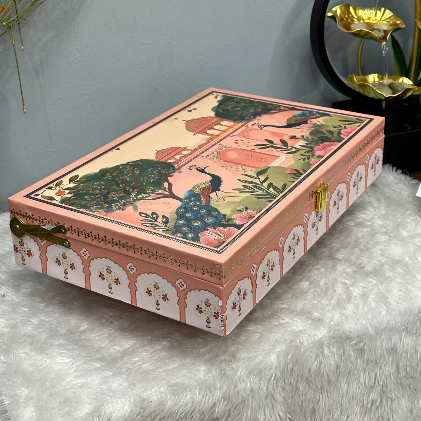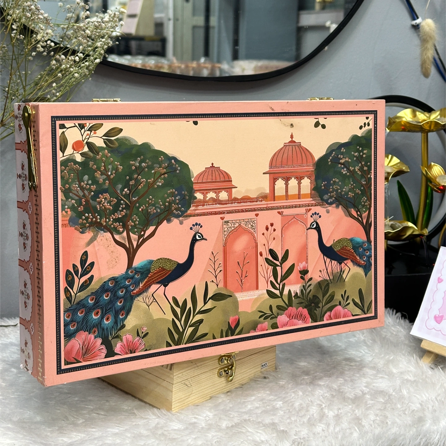Box Style: Soft peach-pink with a vintage arch and peacock illustration on the inside lid. Traditional floral motifs on the exterior.
