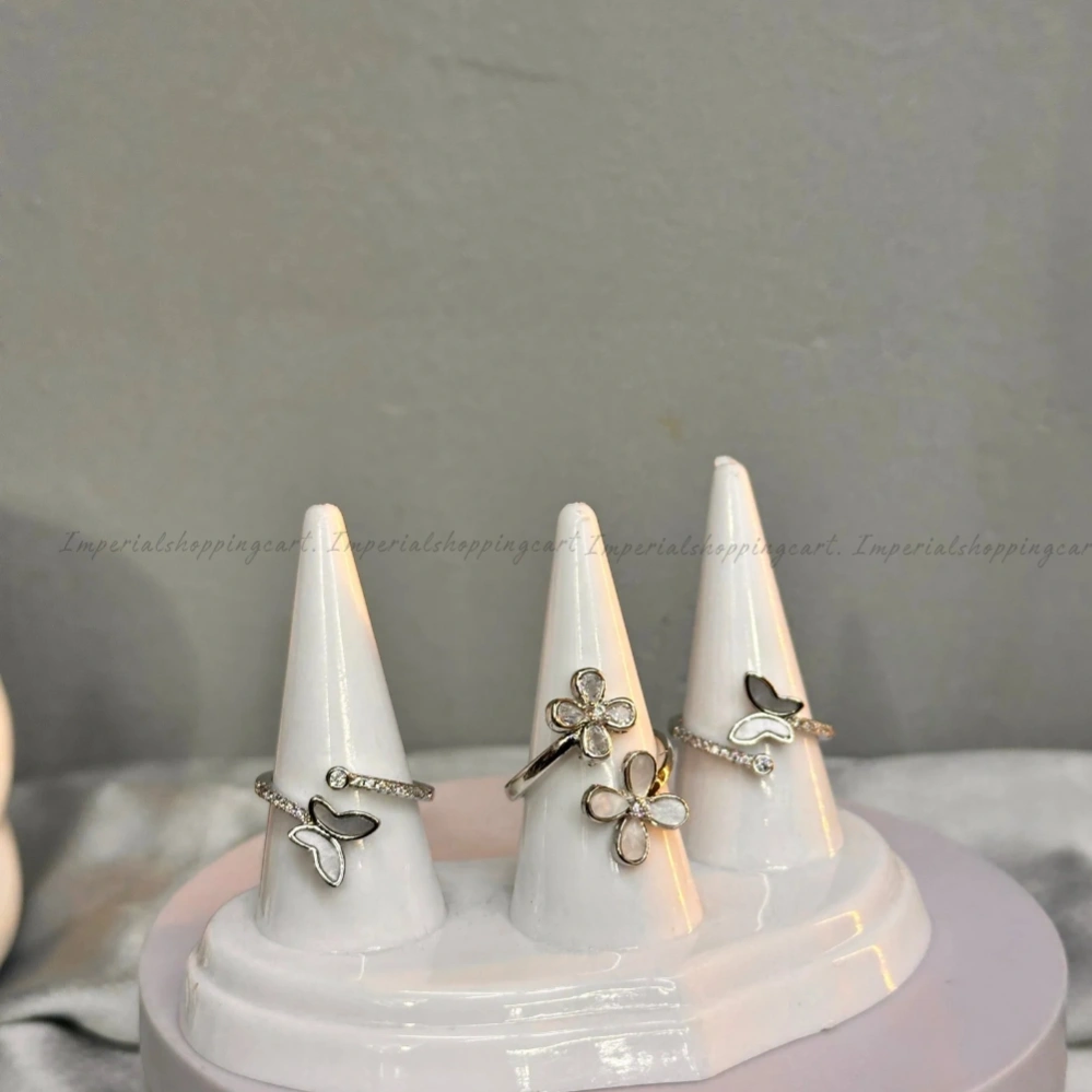 Description: A delicate, adjustable silver-plated wrap ring featuring a stylized butterfly wing crafted from shimmering mother-of-pearl. The open-end design is tipped with a sparkling zircon stone for a touch of celestial elegance.